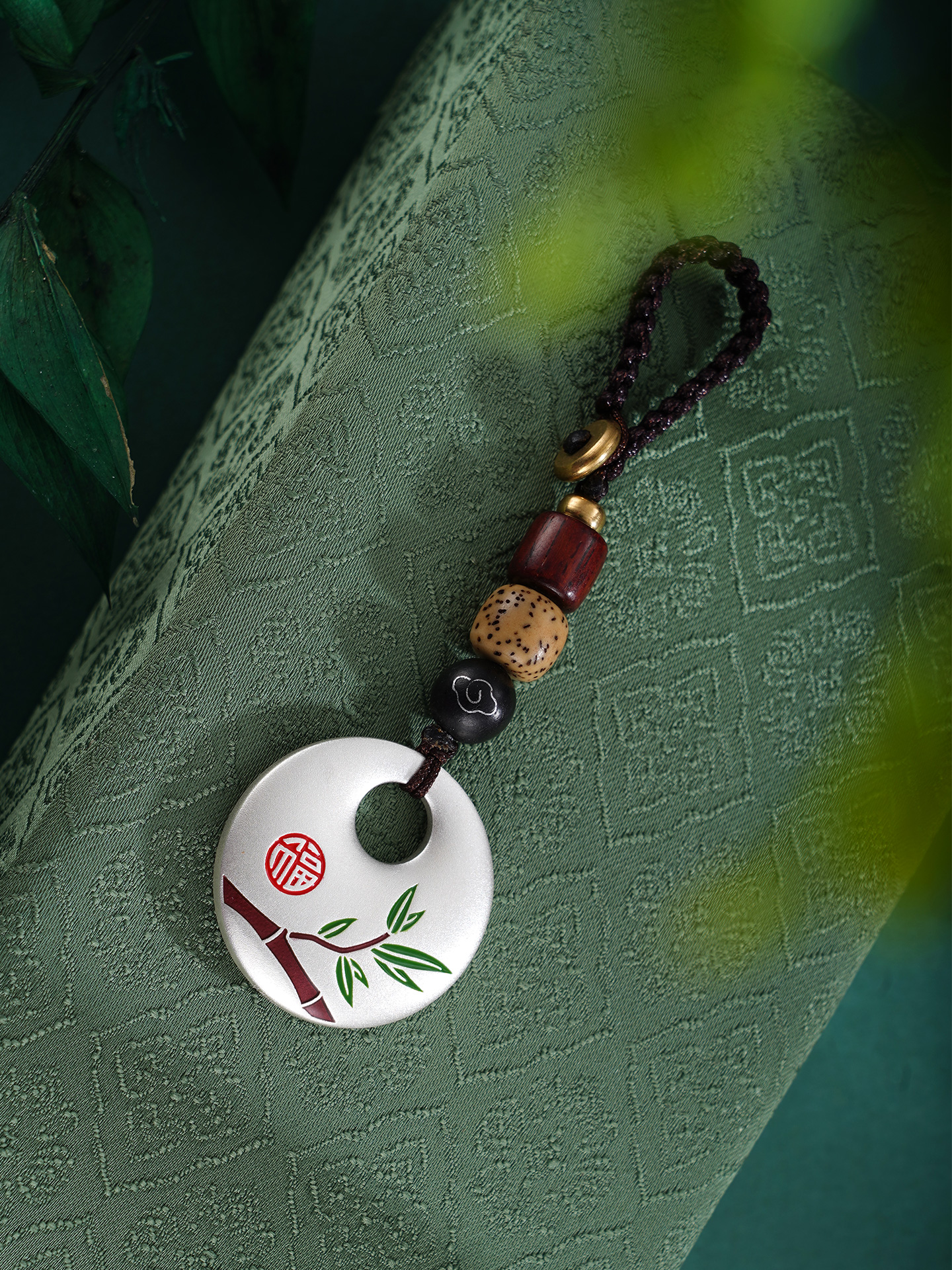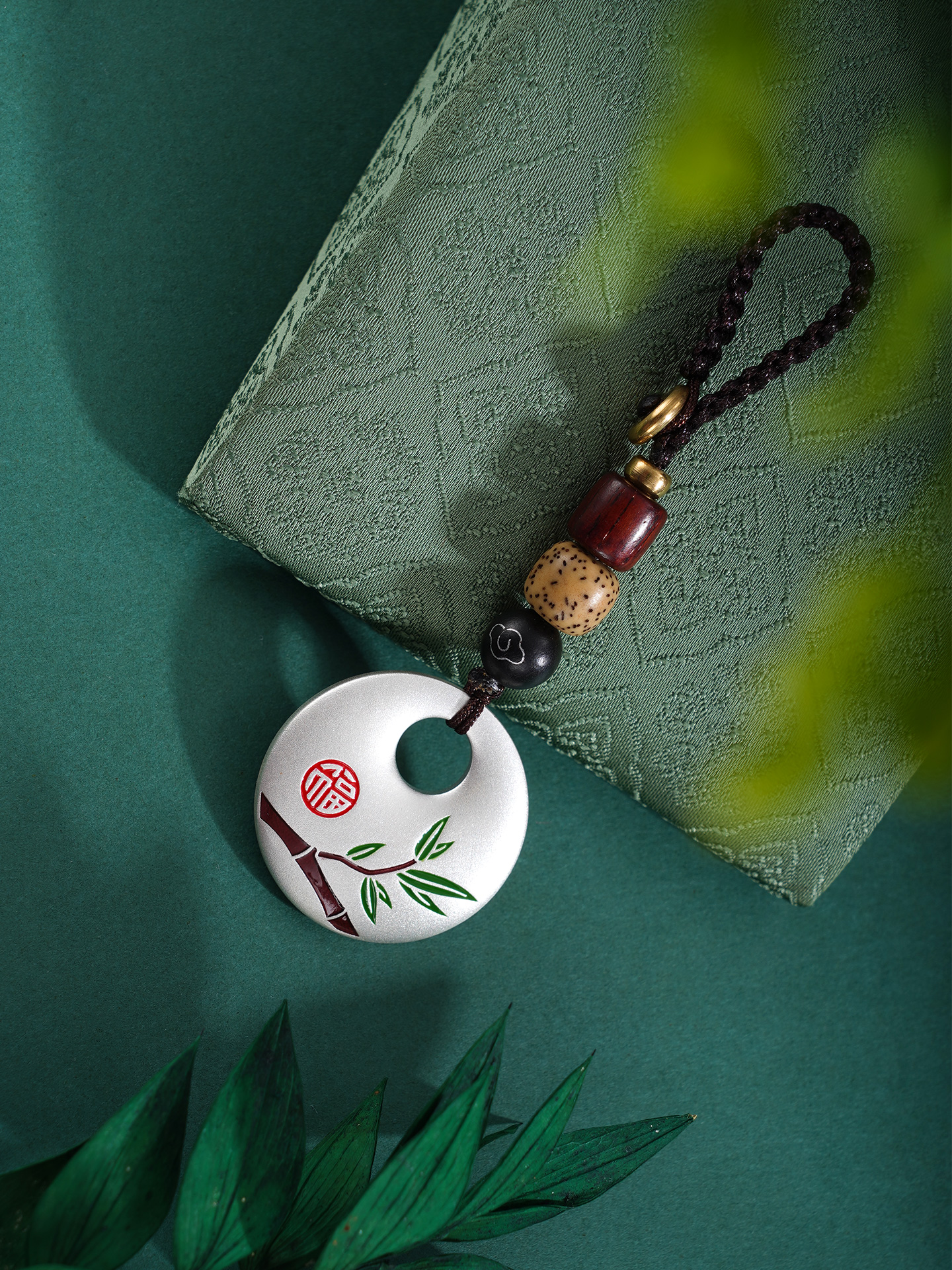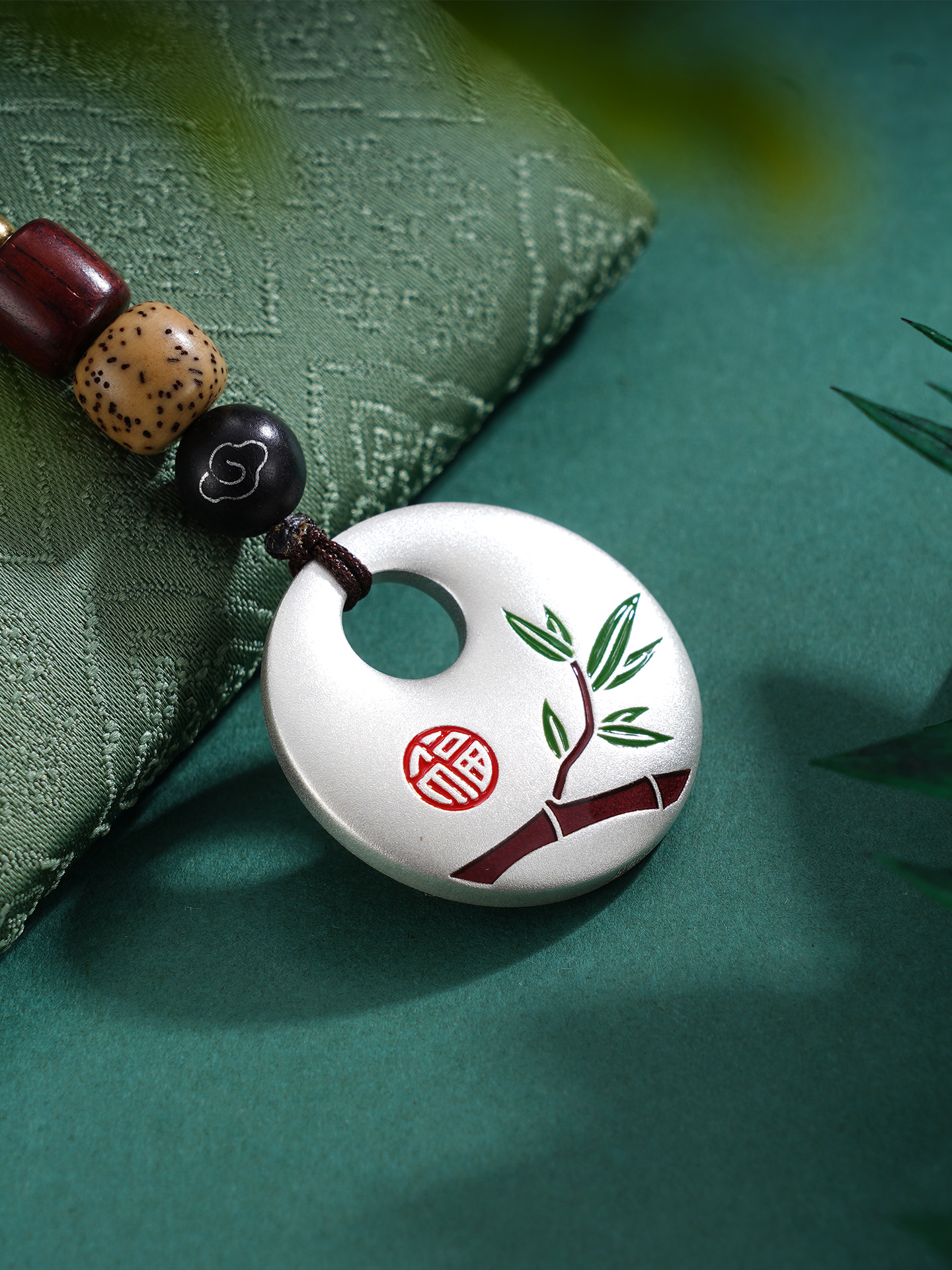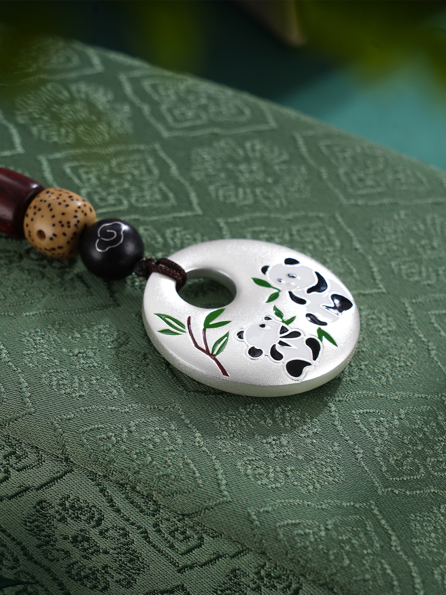 【寓意】:作品以平安扣为灵感设计,珐琅彩绘熊猫戏竹图案,构筑生机图景,传递吉祥“竹福”。福字元素增添设计亮点,更寓意福气连绵,平安相伴。