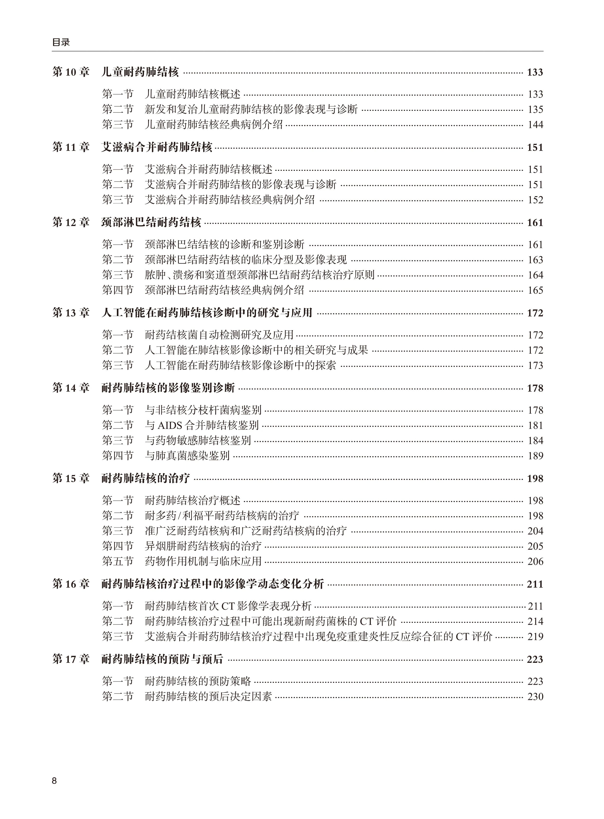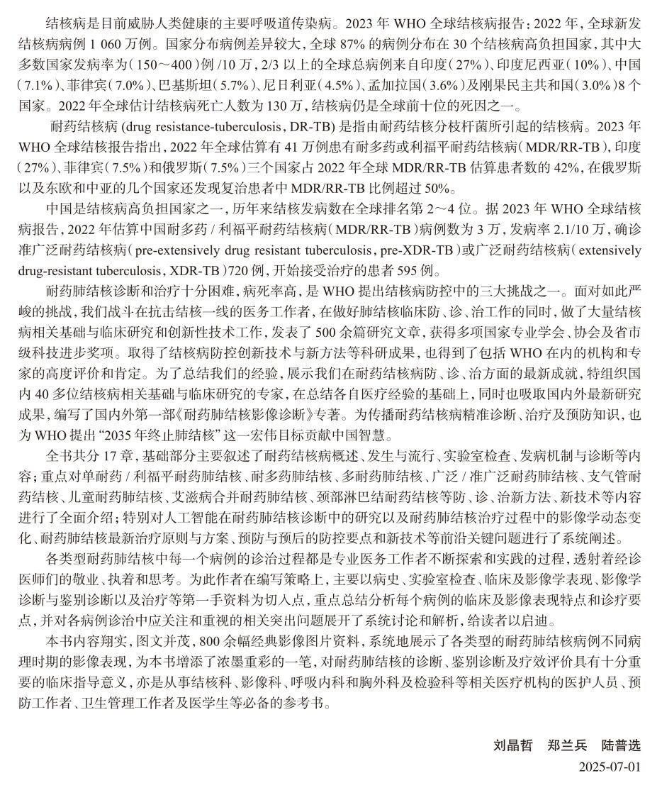 本书聚焦耐药肺结核这一全球公共卫生挑战,对单耐药/利福平耐药、耐多药、广泛/准广泛耐药等核心类型,及支气管、儿童、艾滋病合并耐药肺结核、颈部淋巴结耐药结核病等展开了全面深入的阐述。针对领域前沿,本书系统解析了关键议题:包括AI在耐药肺结核诊断中的研究和应用、耐药结核治疗中的影像学动态变化特点,以及含新型药物的超短程方案等最新治疗原则与方案,同时涵盖预防与预后的防控要点及创新技术。书中收录的经典病例800余幅珍贵影像图,将理论与临床实践深度结合,为著作注入了厚重的实践价值,成为其鲜明亮点。