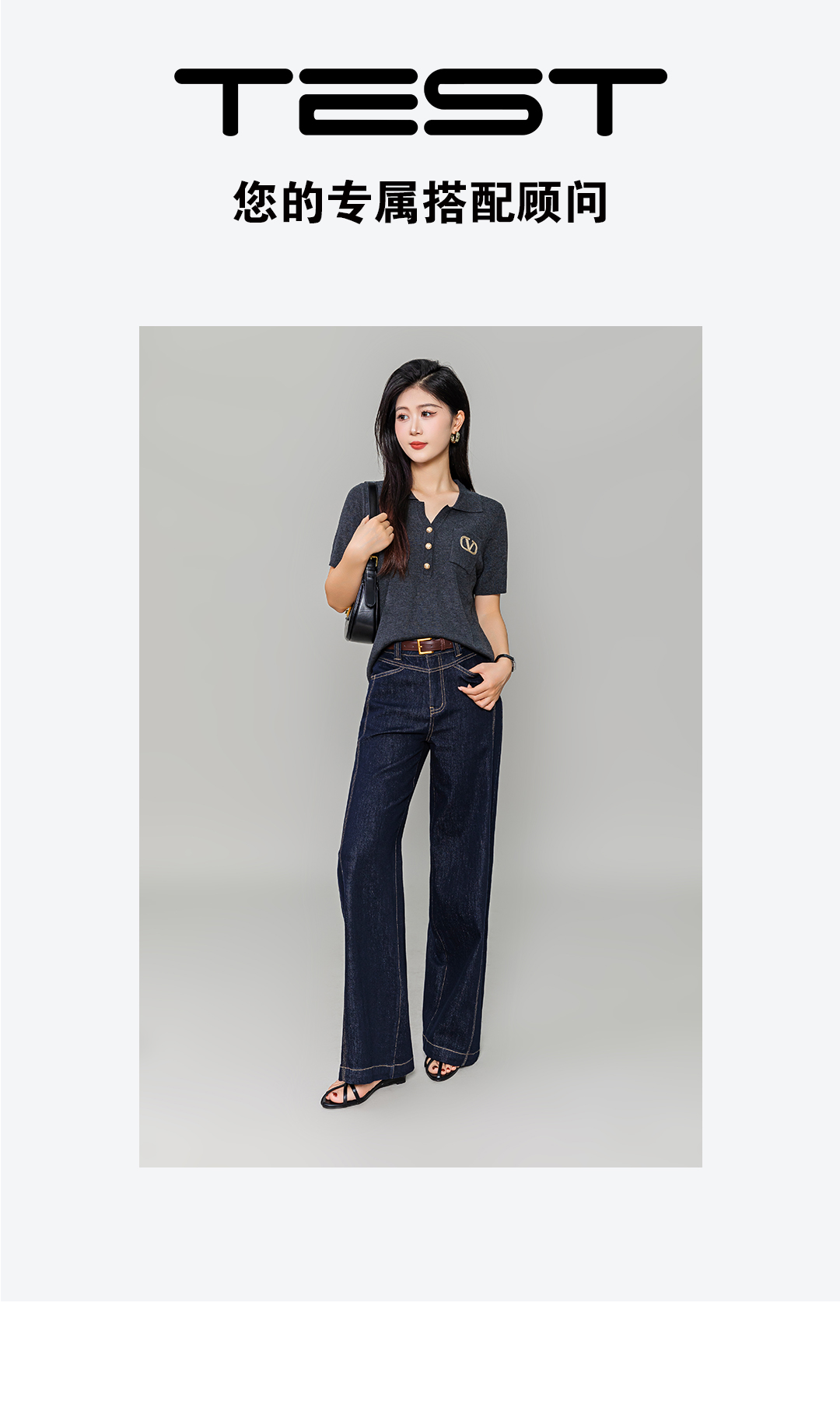 秋上新深蓝色阔腿独特压线设计超加分牛仔裤3253020 商品图2