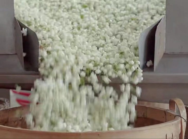 首先,将备好的茶胚与花胚【拼和】 这是整个茉莉花茶窨制过程的重点工序。