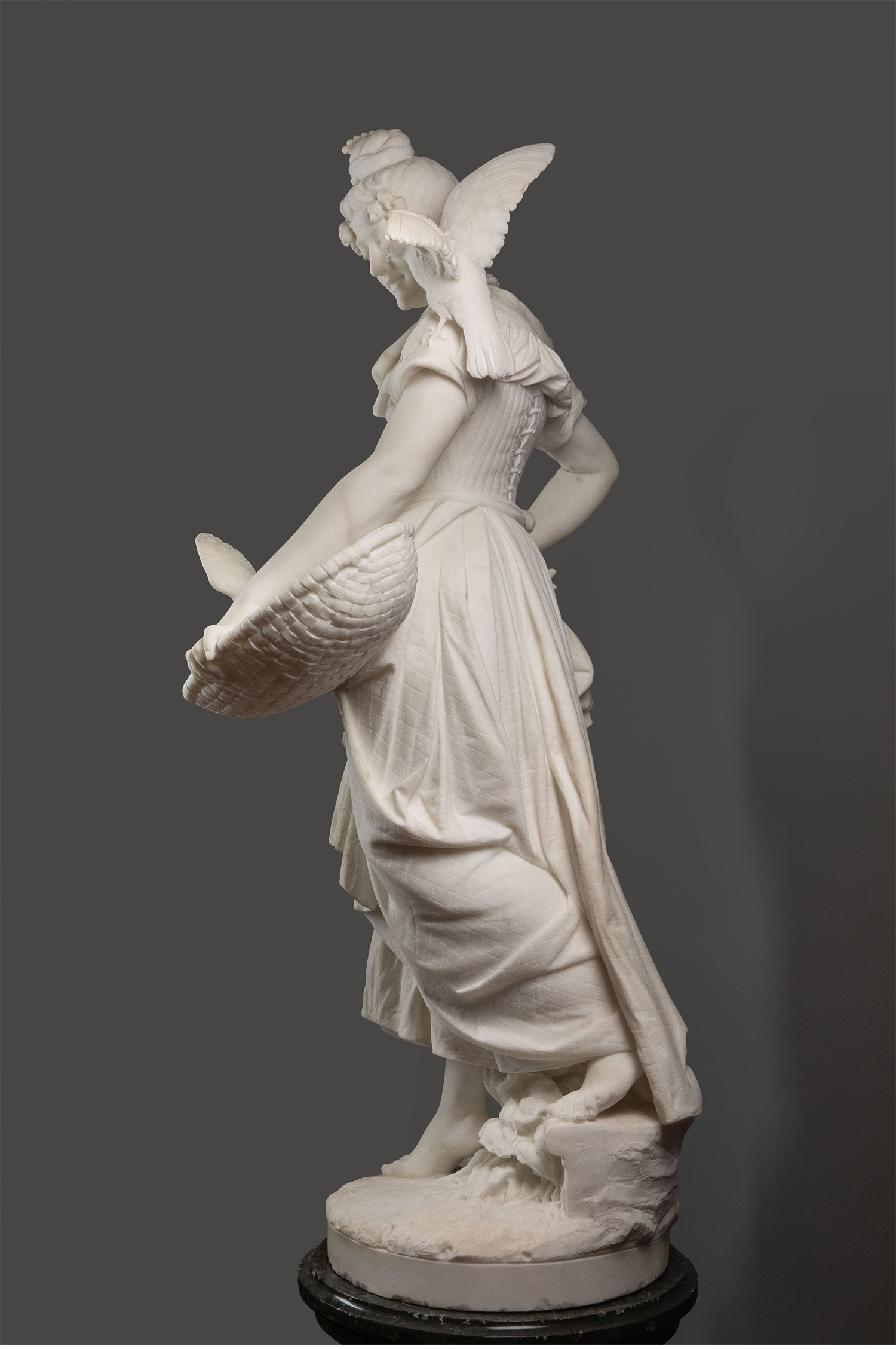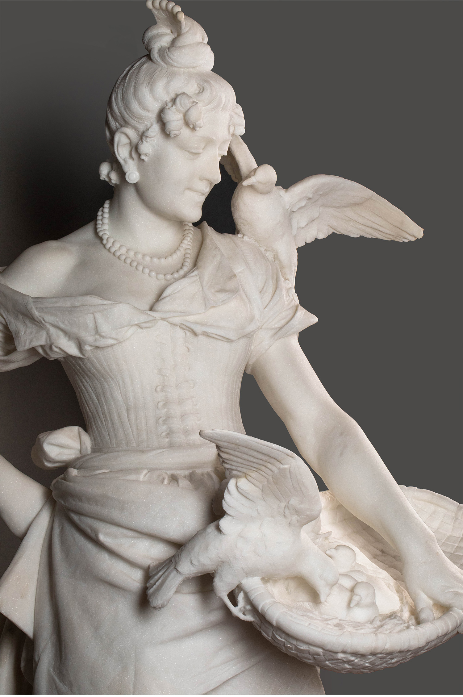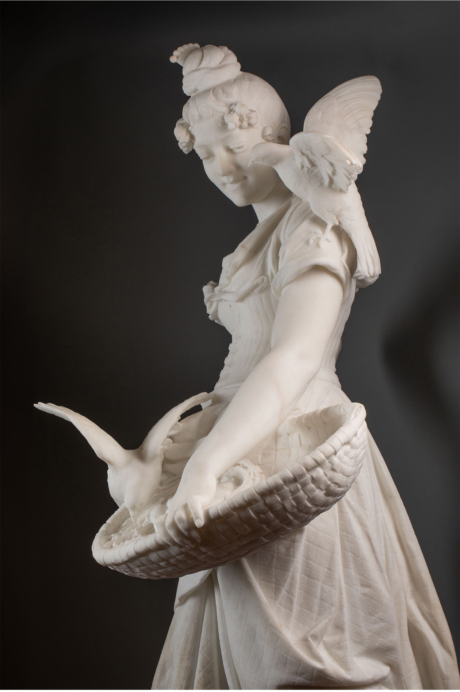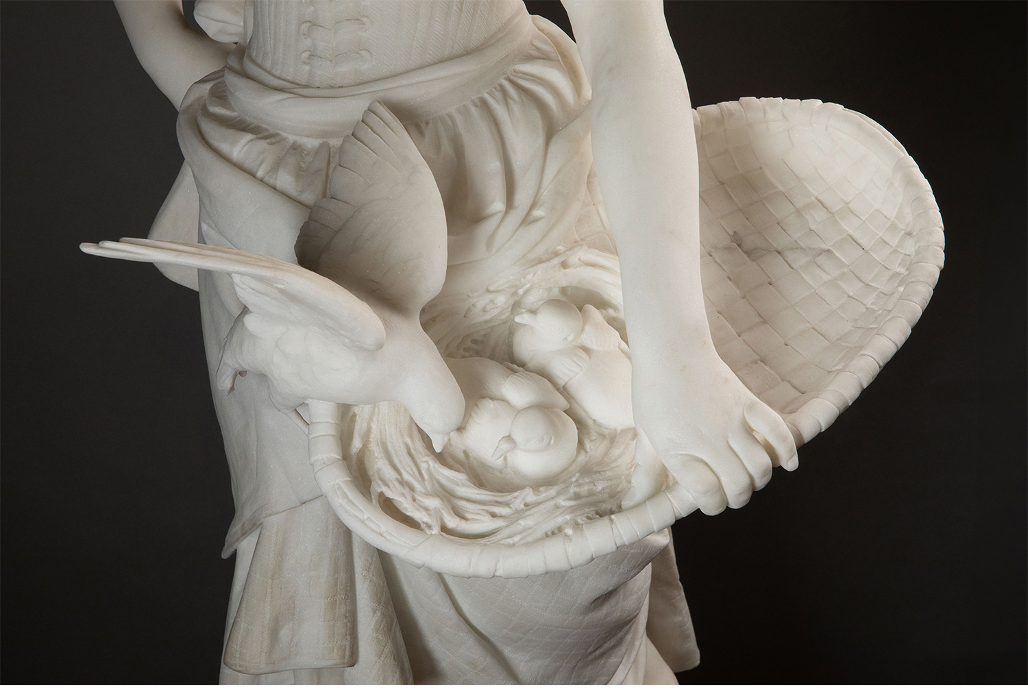 1887年意大利雕塑家Vittorio Caradossi签名创作女性人物主题大理石雕塑作品《与鸟一起的少女》