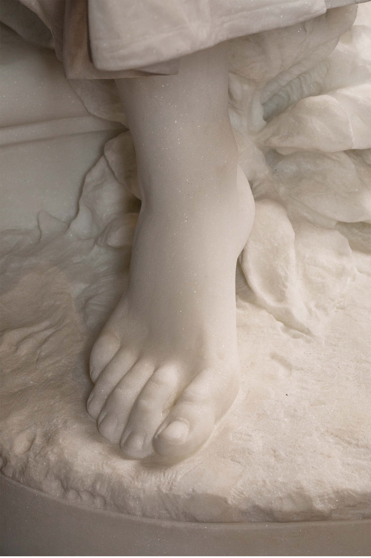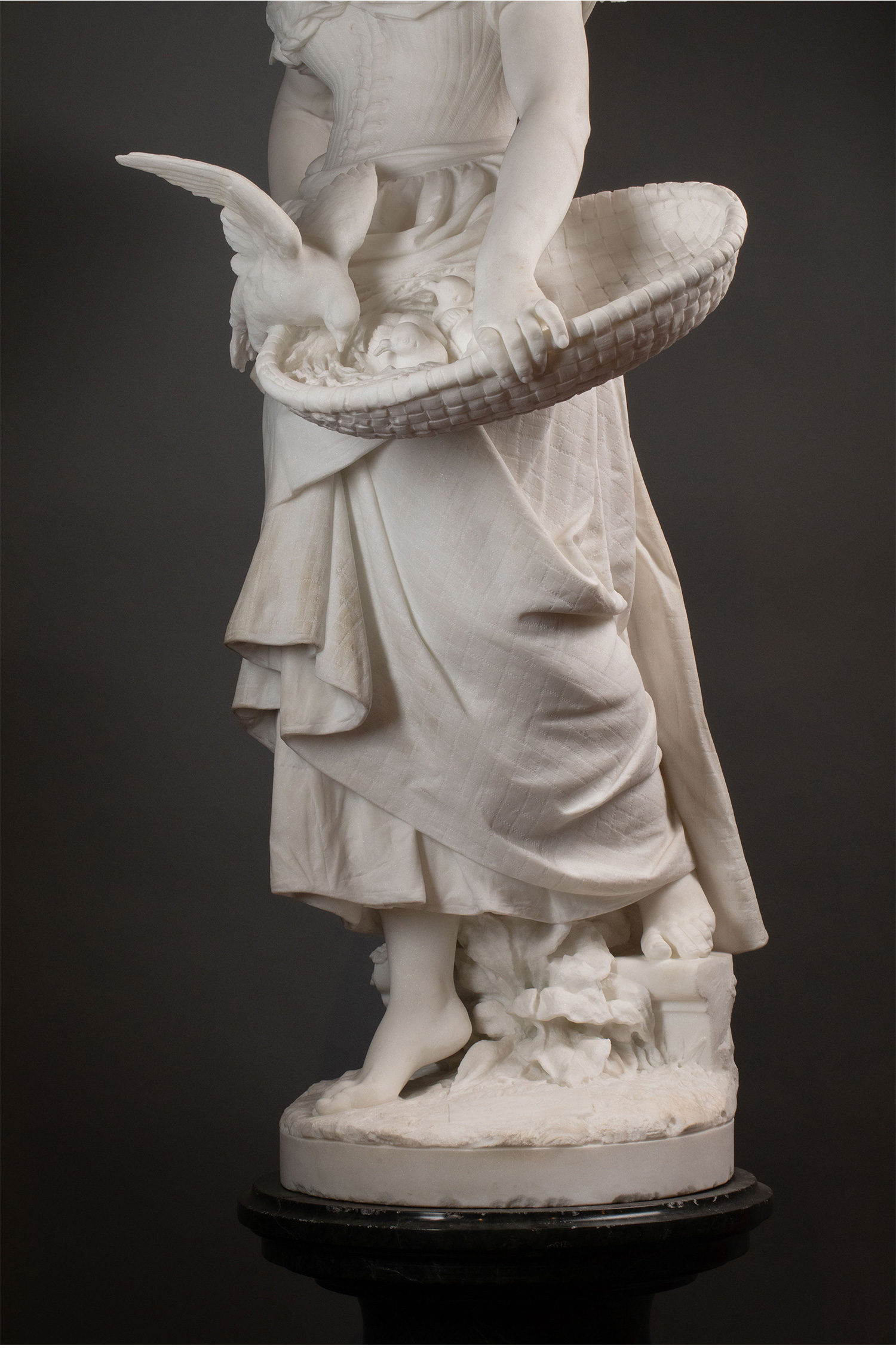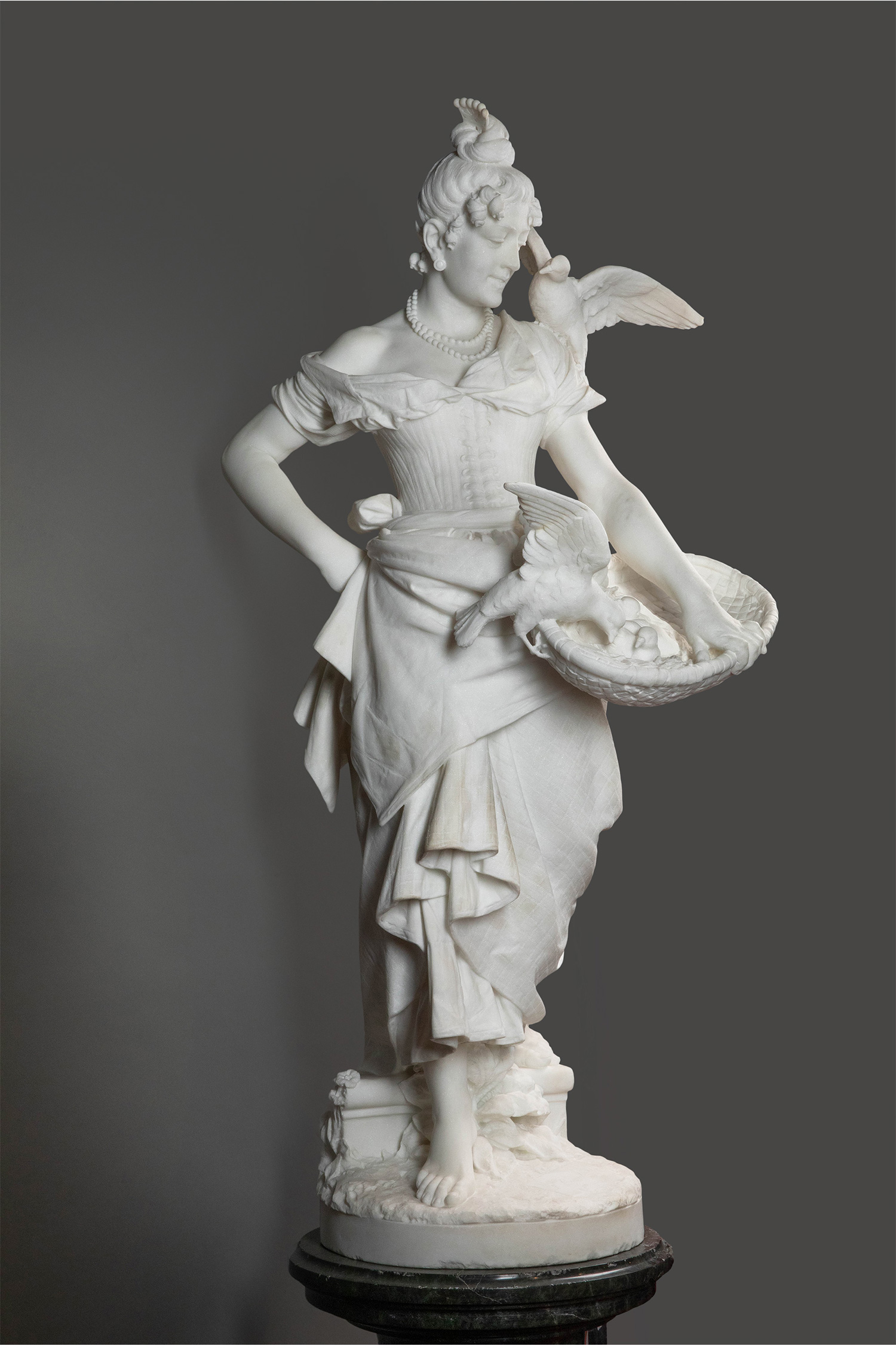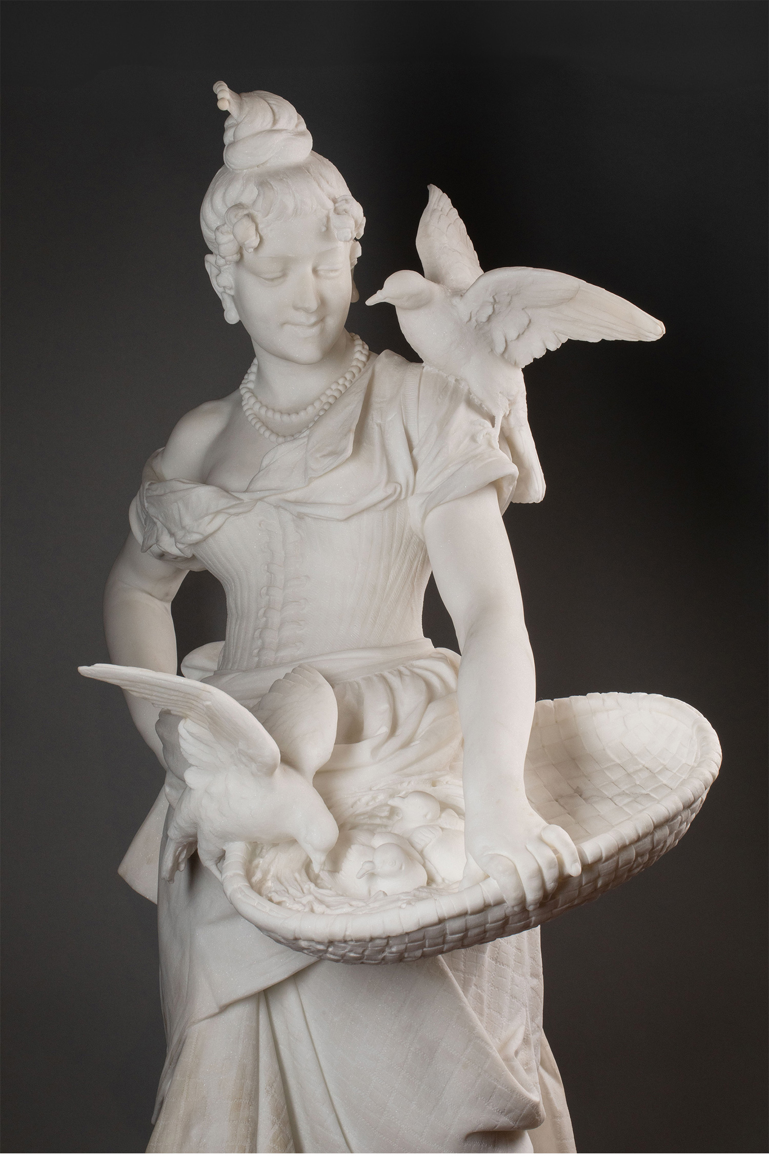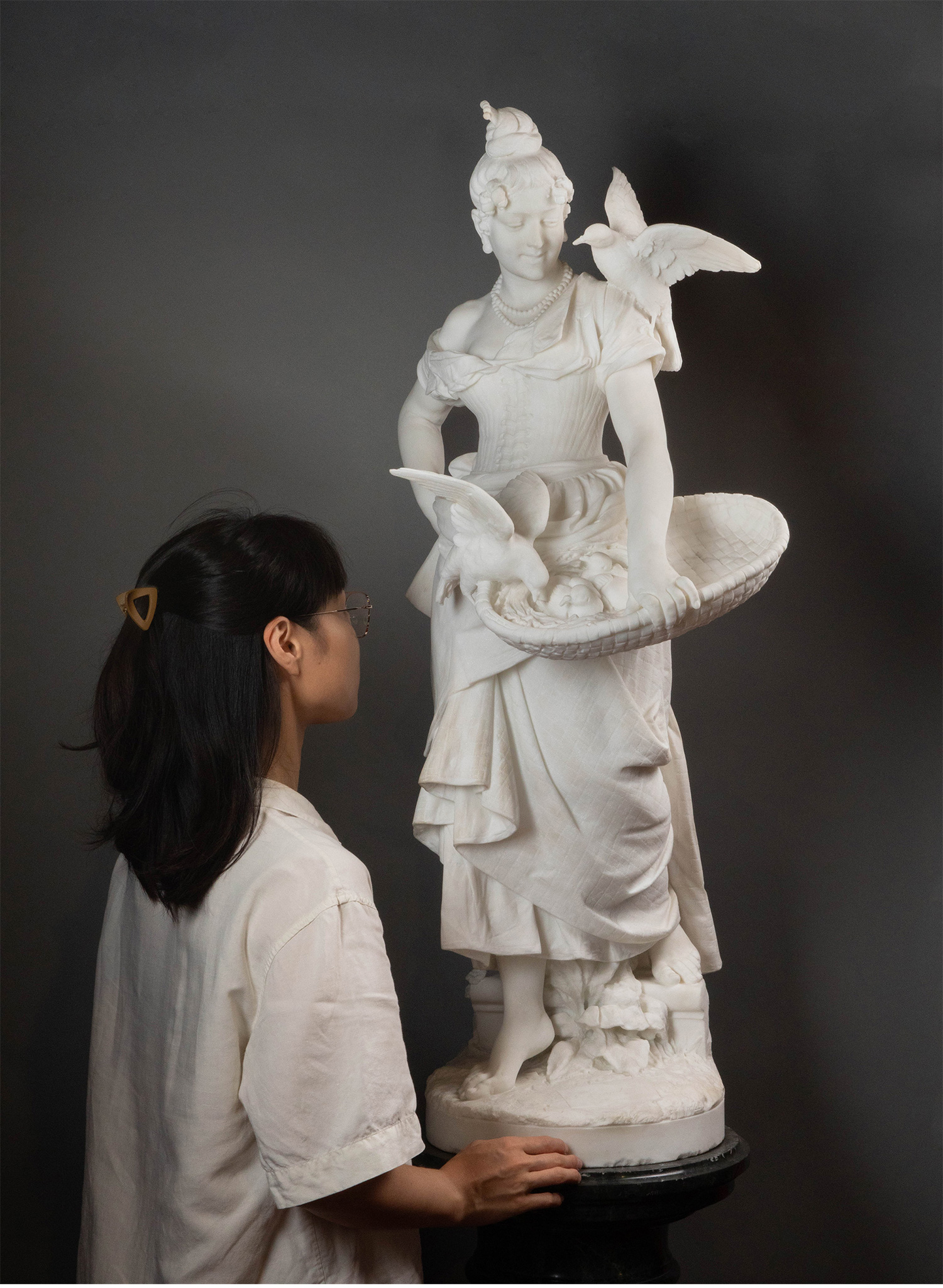 1887年意大利雕塑家Vittorio Caradossi签名创作女性人物主题大理石雕塑作品《与鸟一起的少女》