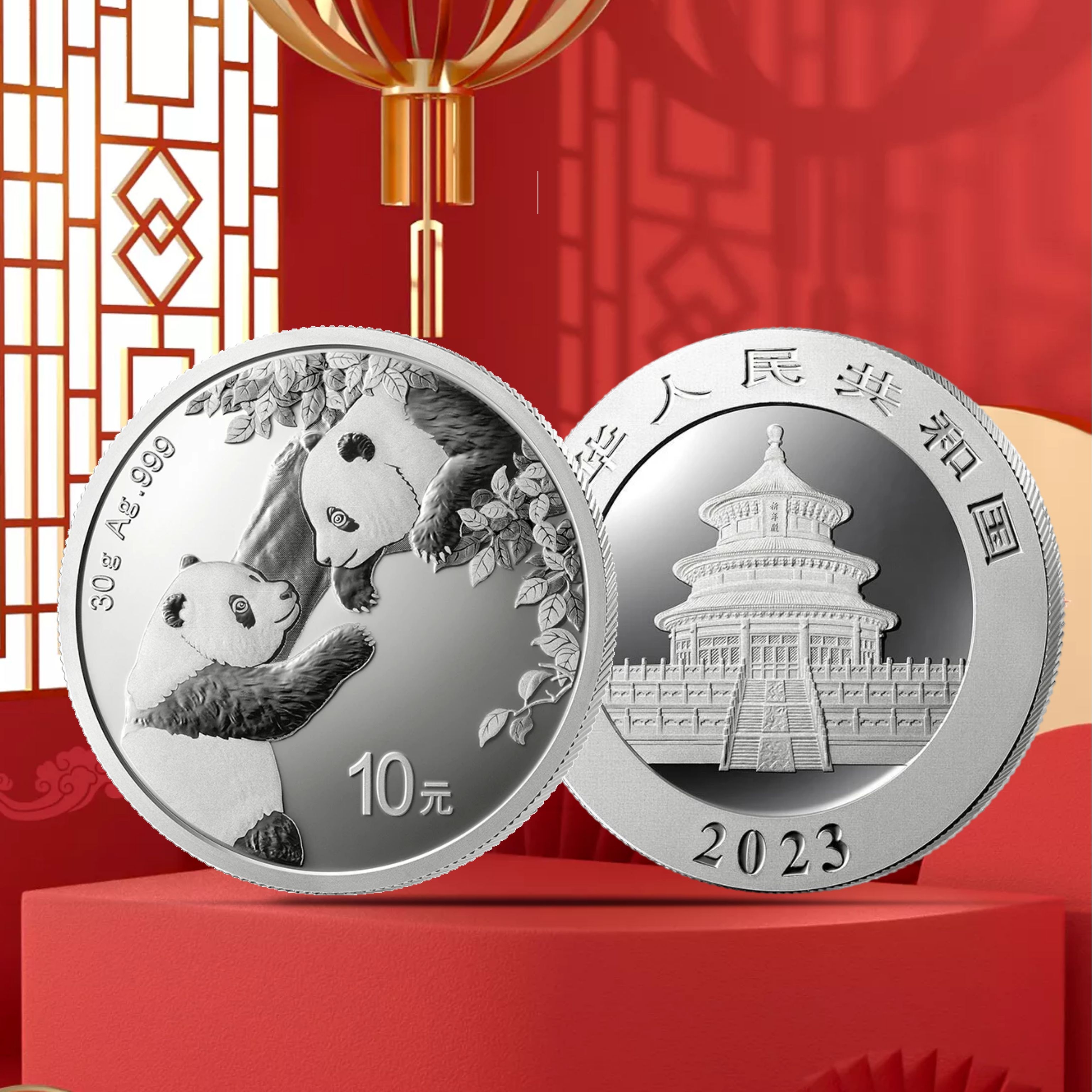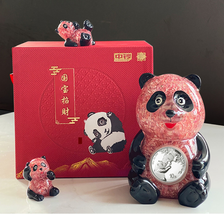 胖乎乎的身子萌态十足的招财造型熊猫,双手紧抱着中国人民银行发行的2023年熊猫纪念银币