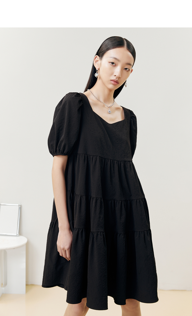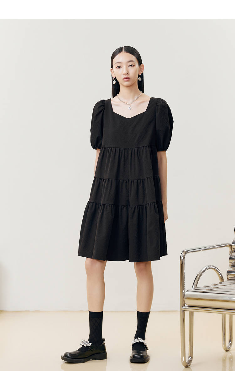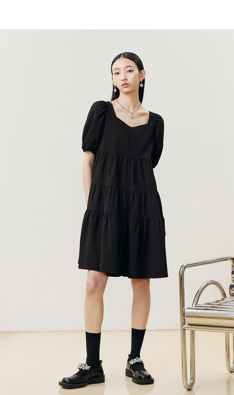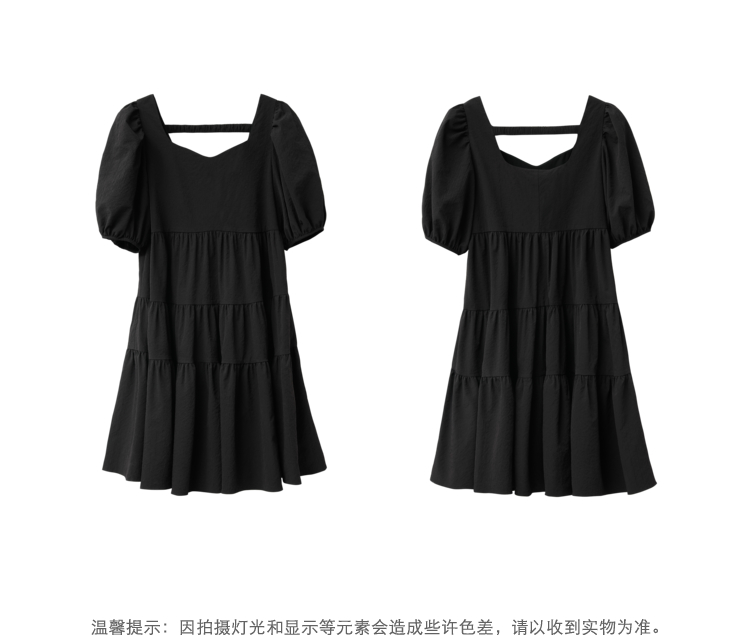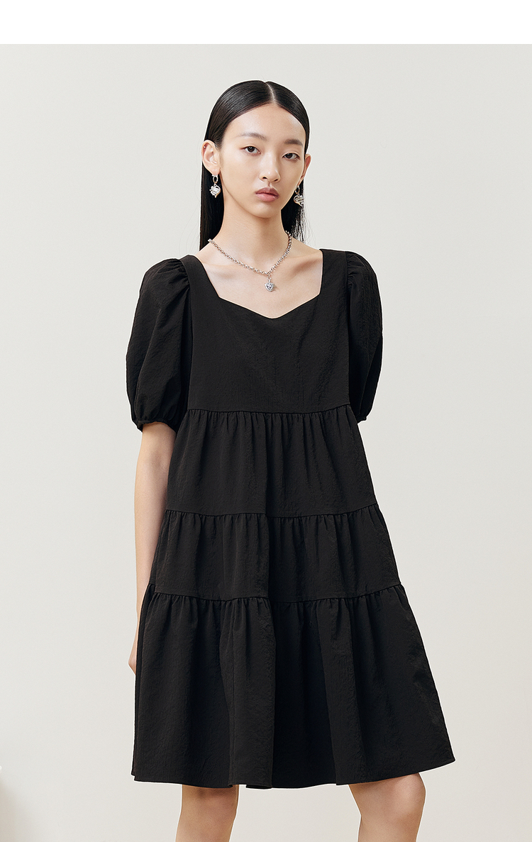 NEELLY纳俪商场同款桃心领短袖黑色连衣裙女夏季泡泡袖娃娃裙显瘦N22042Y01048