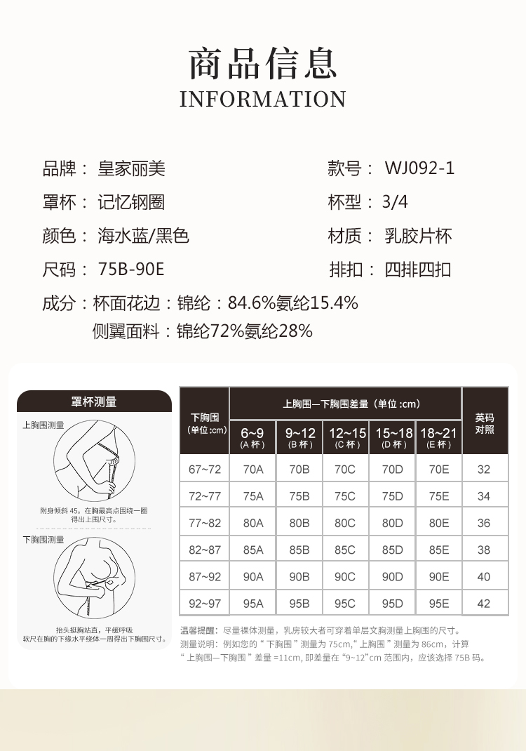 皇家丽美 亲肤/柔软/Q弹/轻盈/薄款调整型文胸内衣WJ092-1