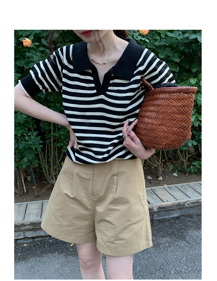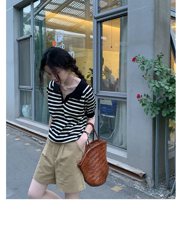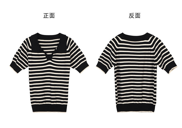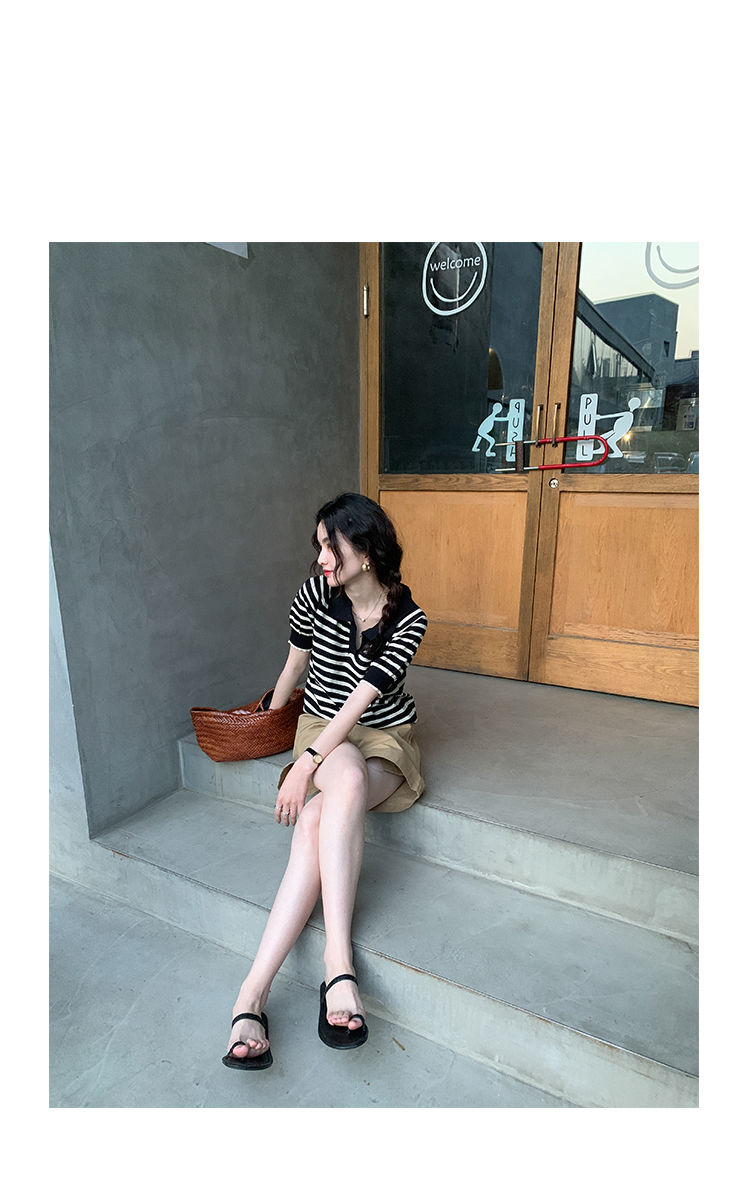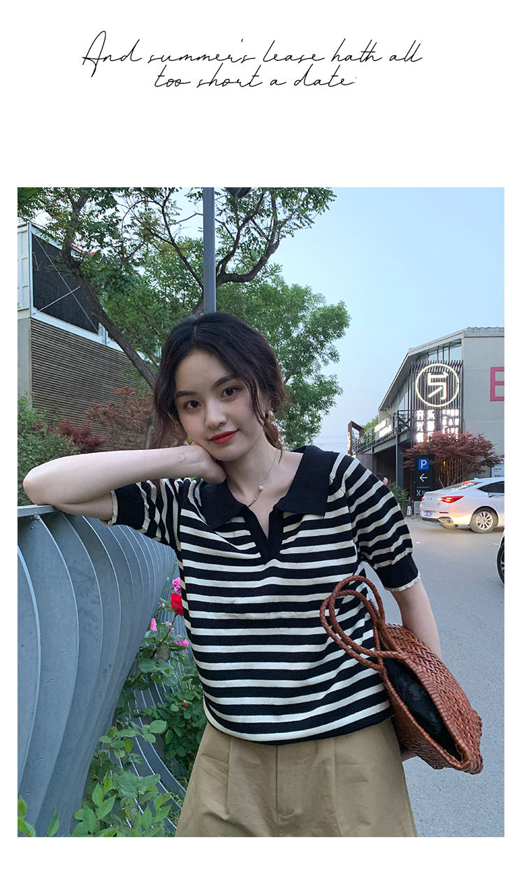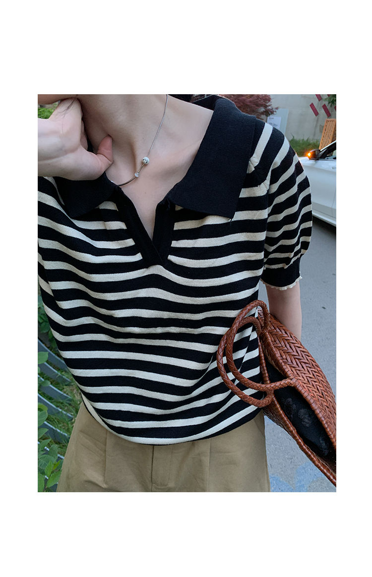 黛唯梵馨帮帮 法式设计感小众气质修身上衣polo衫v领条纹短袖针织衫女夏