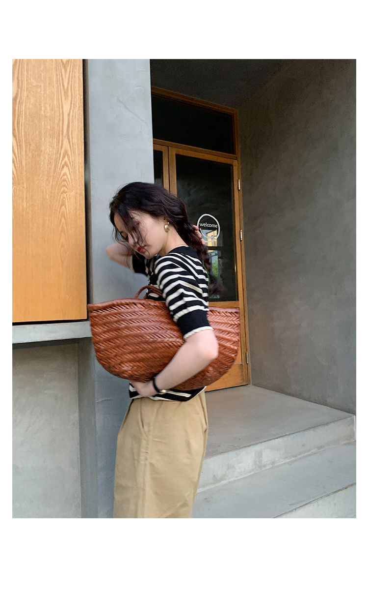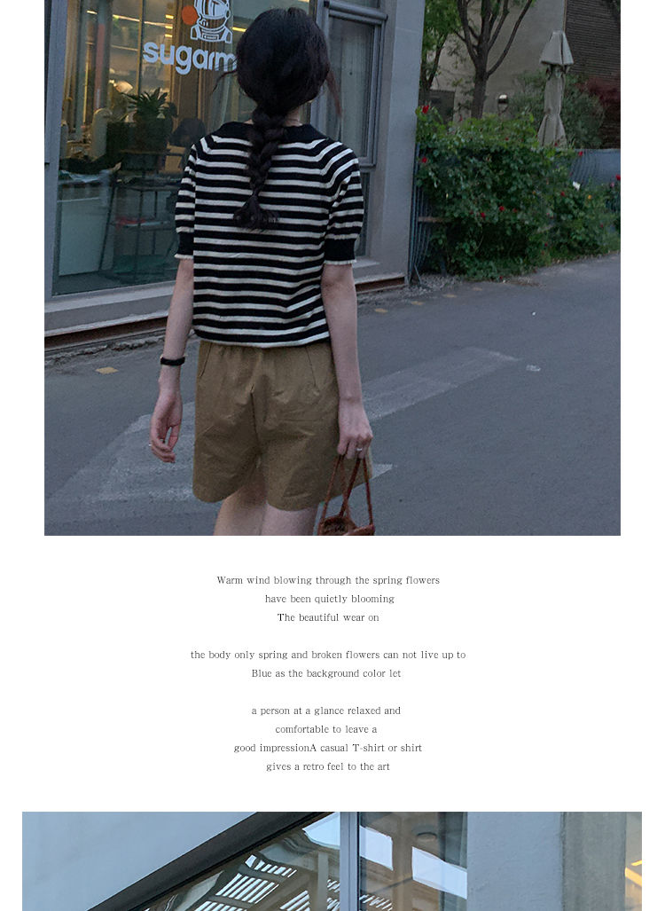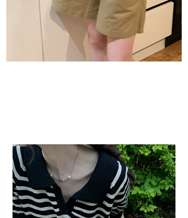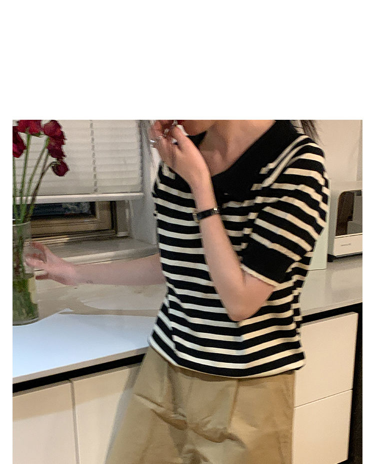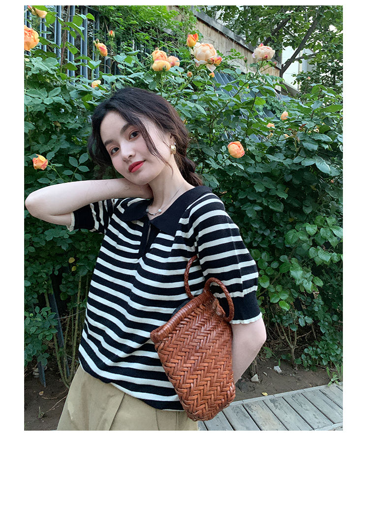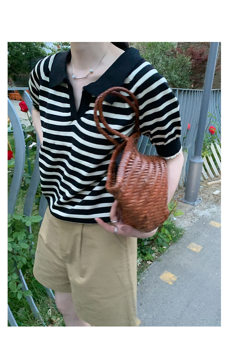 黛唯梵馨帮帮 法式设计感小众气质修身上衣polo衫v领条纹短袖针织衫女夏