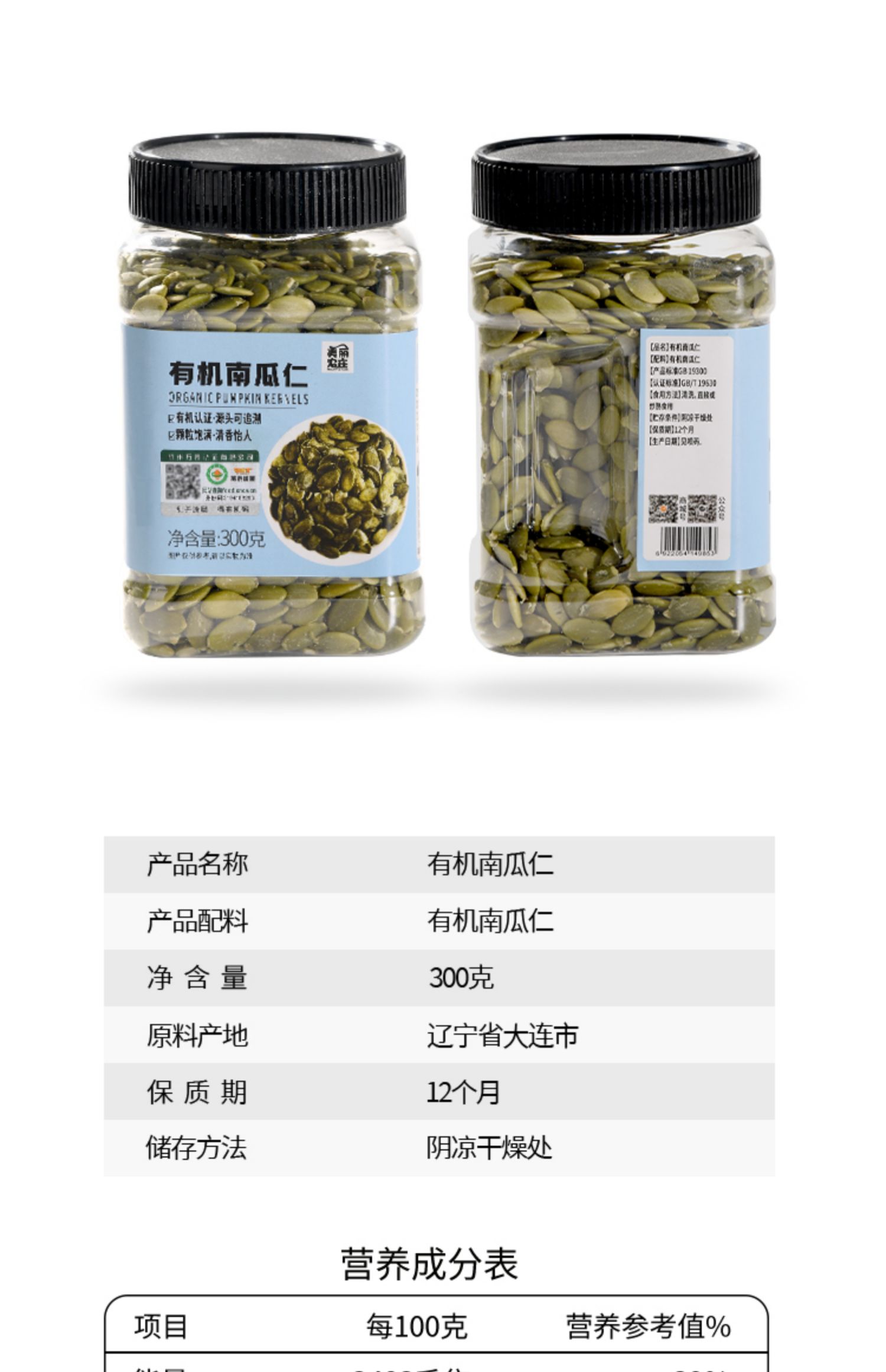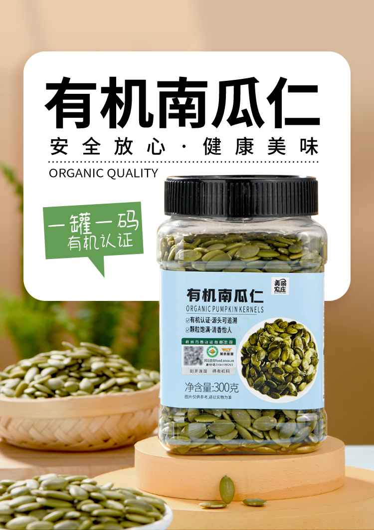 美丽农庄有机生南瓜仁 南瓜籽仁大粒种子循环烘焙零食300g罐装