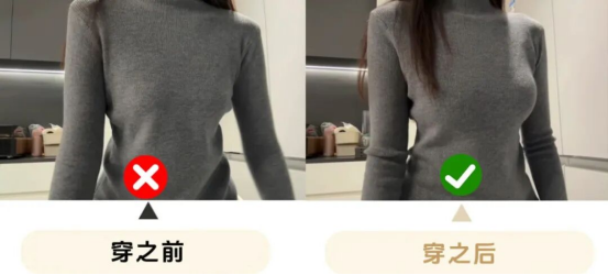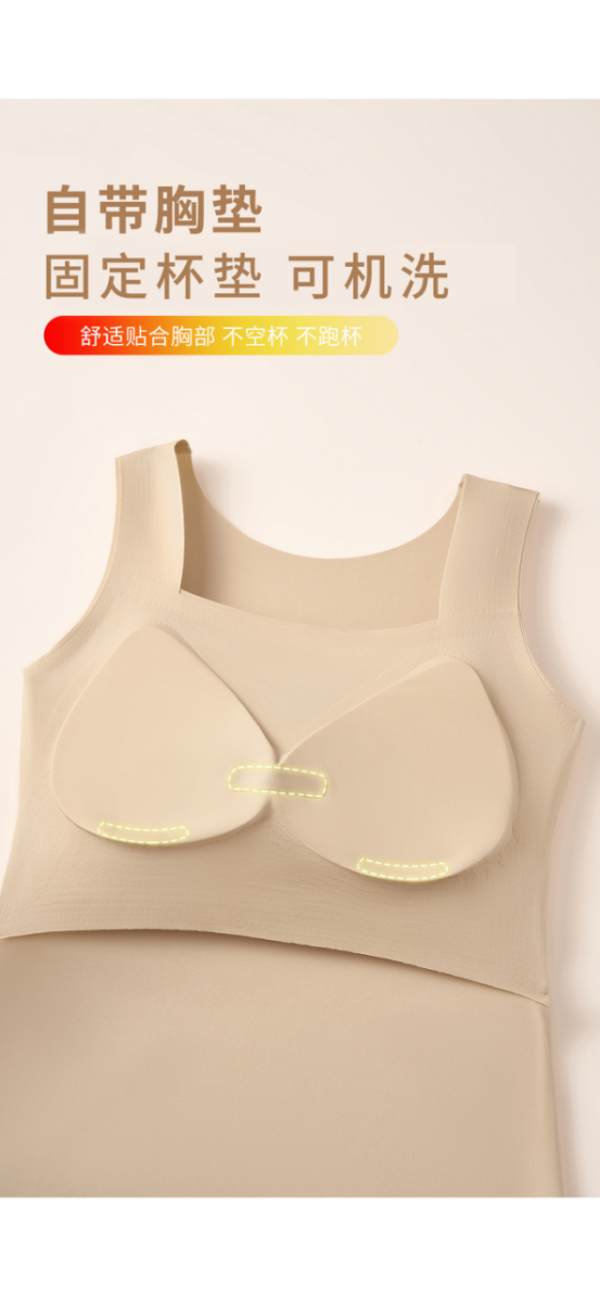 但是!!我最爱的还是它自带杯垫的设计。 有了这款美肤保暖背心后,直接一件搞定,早上套上外套就能出门,因为它可以直接代替文胸稳定胸型。 冬天直接穿它可以省掉穿内衣的麻烦,真的好懂女人偶尔想要偷点懒的小心思。 每次穿它都感觉自己在光明正大的“不穿内衣”出门。 适应性满分的水滴形杯垫设计,一穿就有丰满浑圆的完美胸形,从下到上,从外到内修饰胸形。 虽然是无钢圈设计,但聚拢度依然不容小觑,看上去绝对有料~
