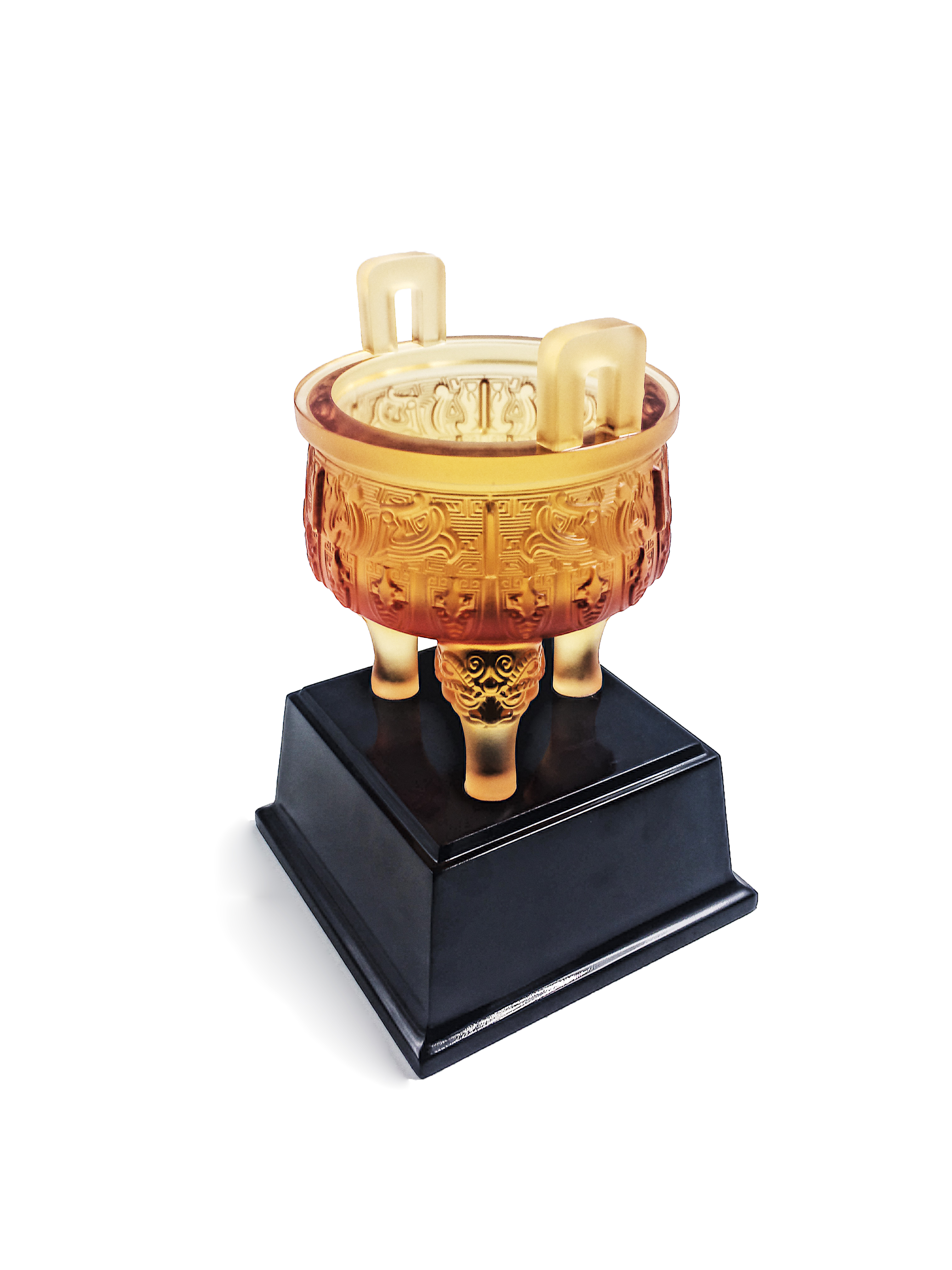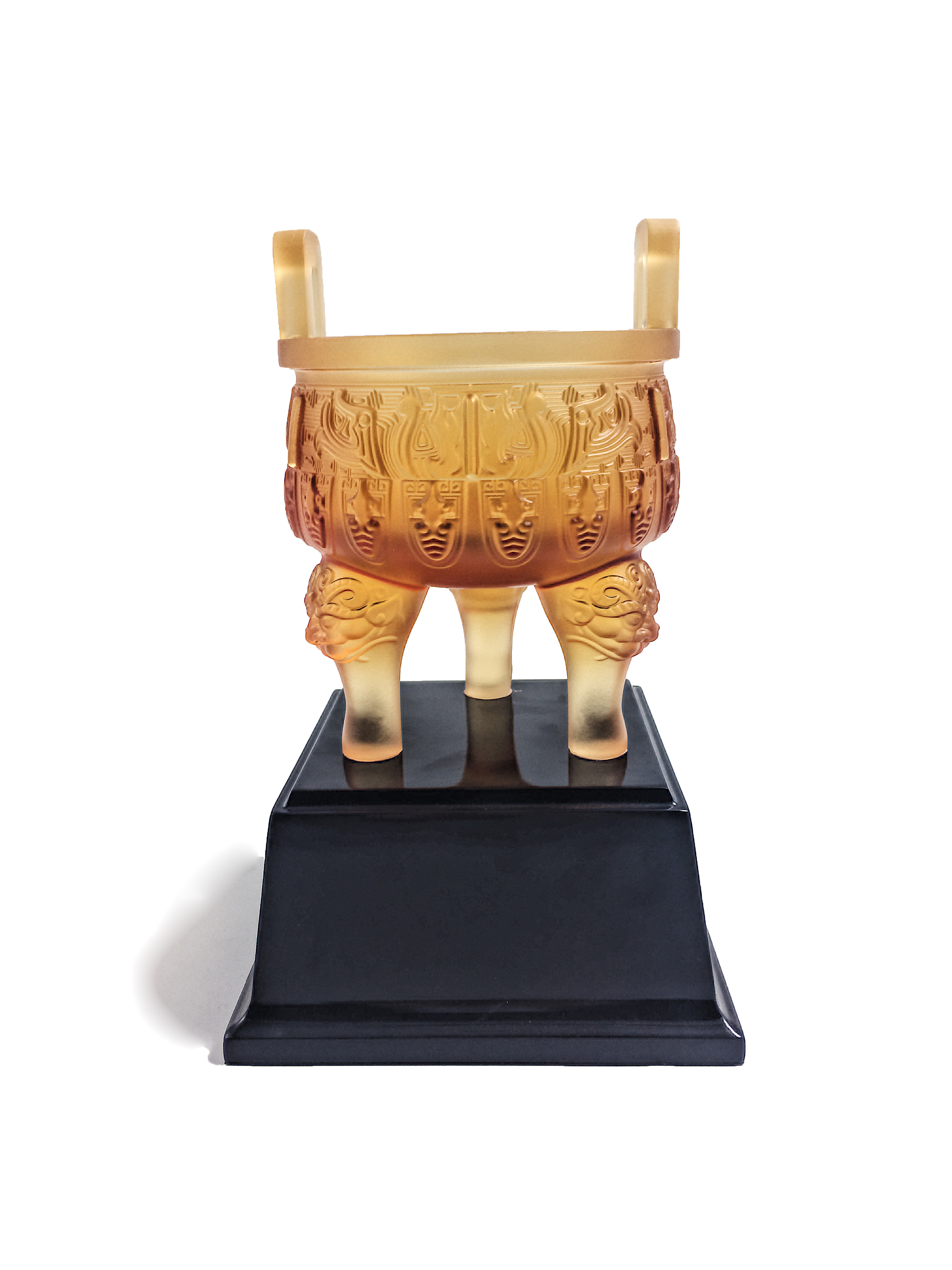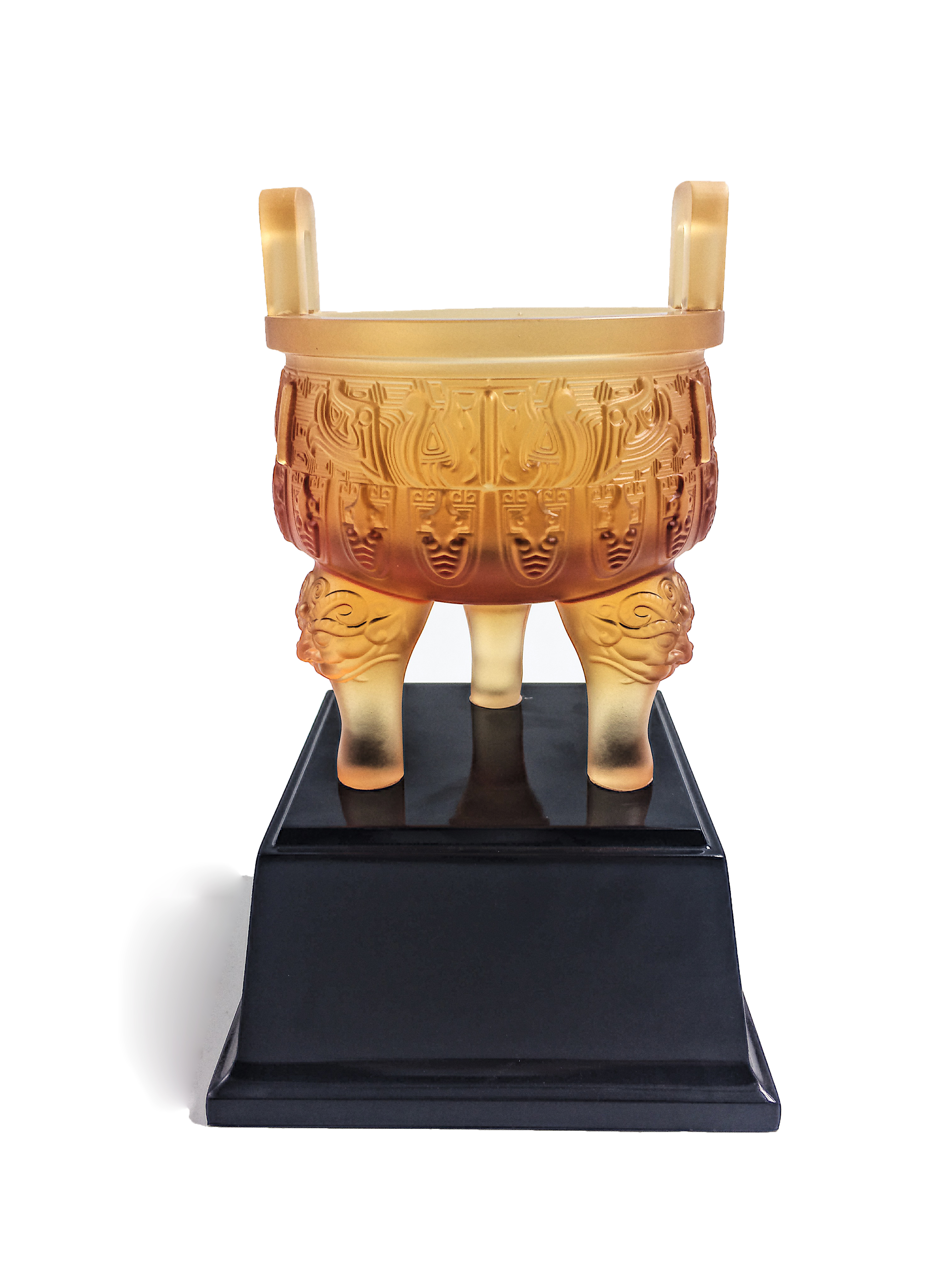 招财进宝,大富大贵,财源广进。金琥珀琉璃压形制作,更现产品晶莹剔透,富贵大方。三足也象征着天时、地利、人和。底座为钢琴漆制作,使产品更高档。