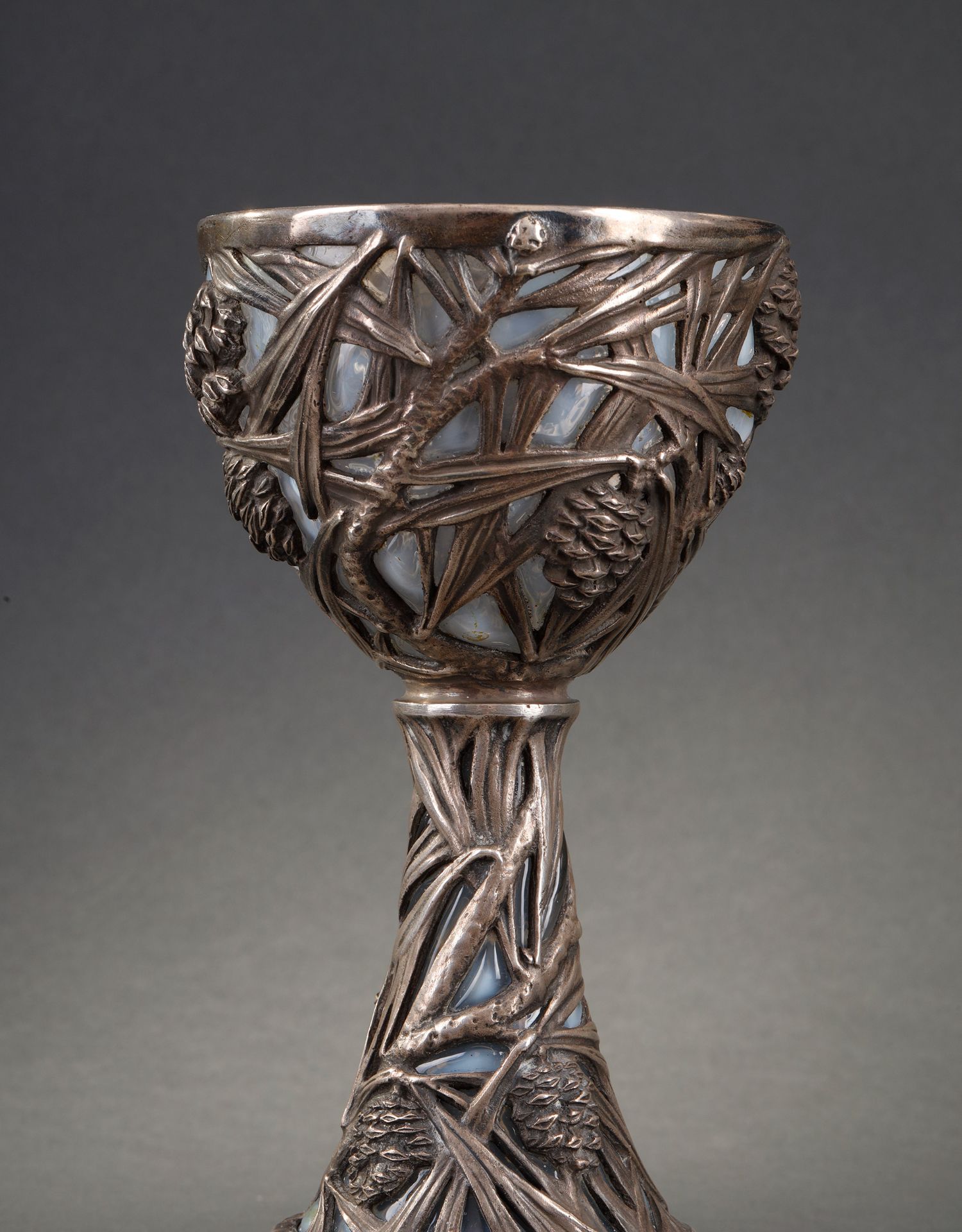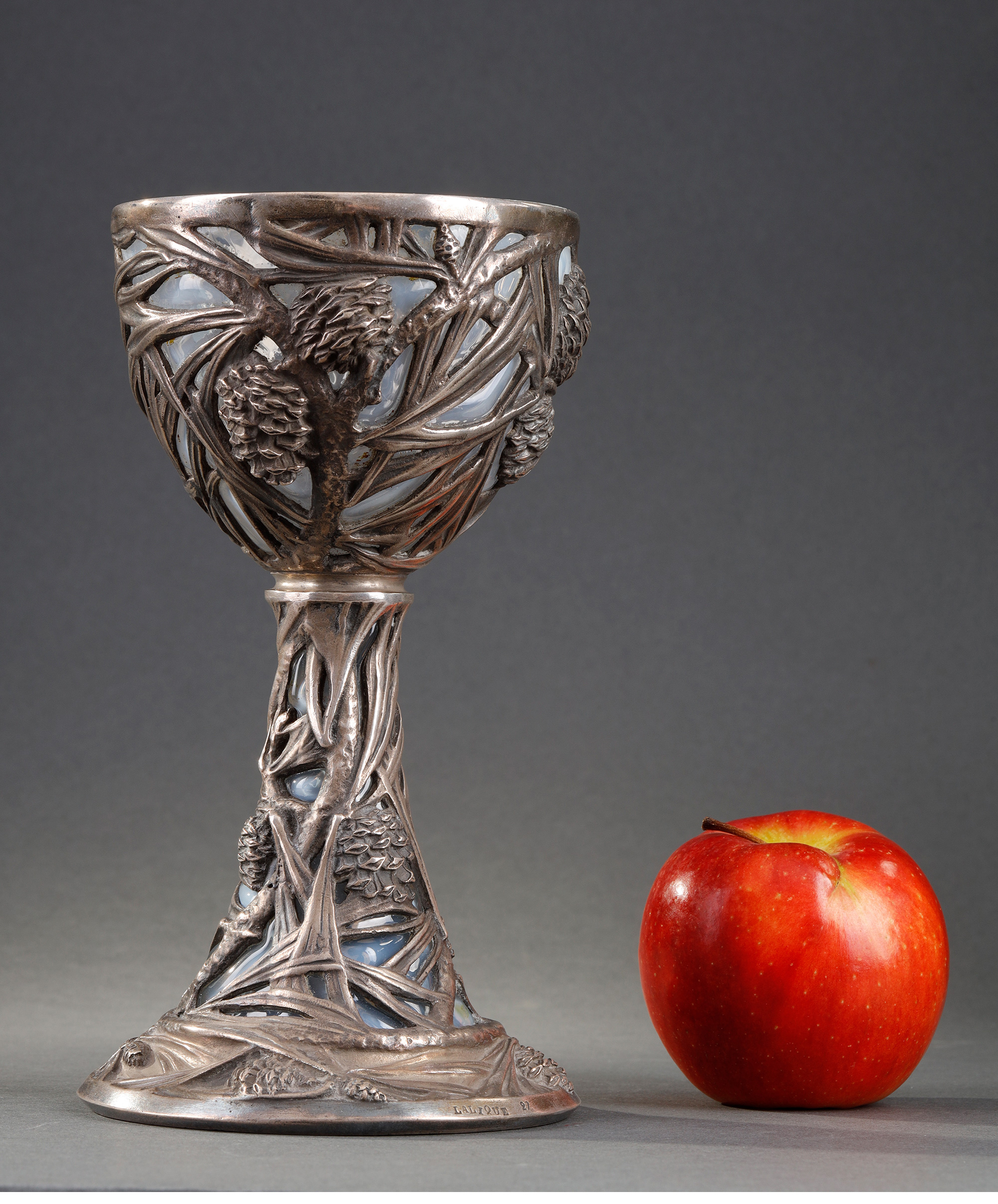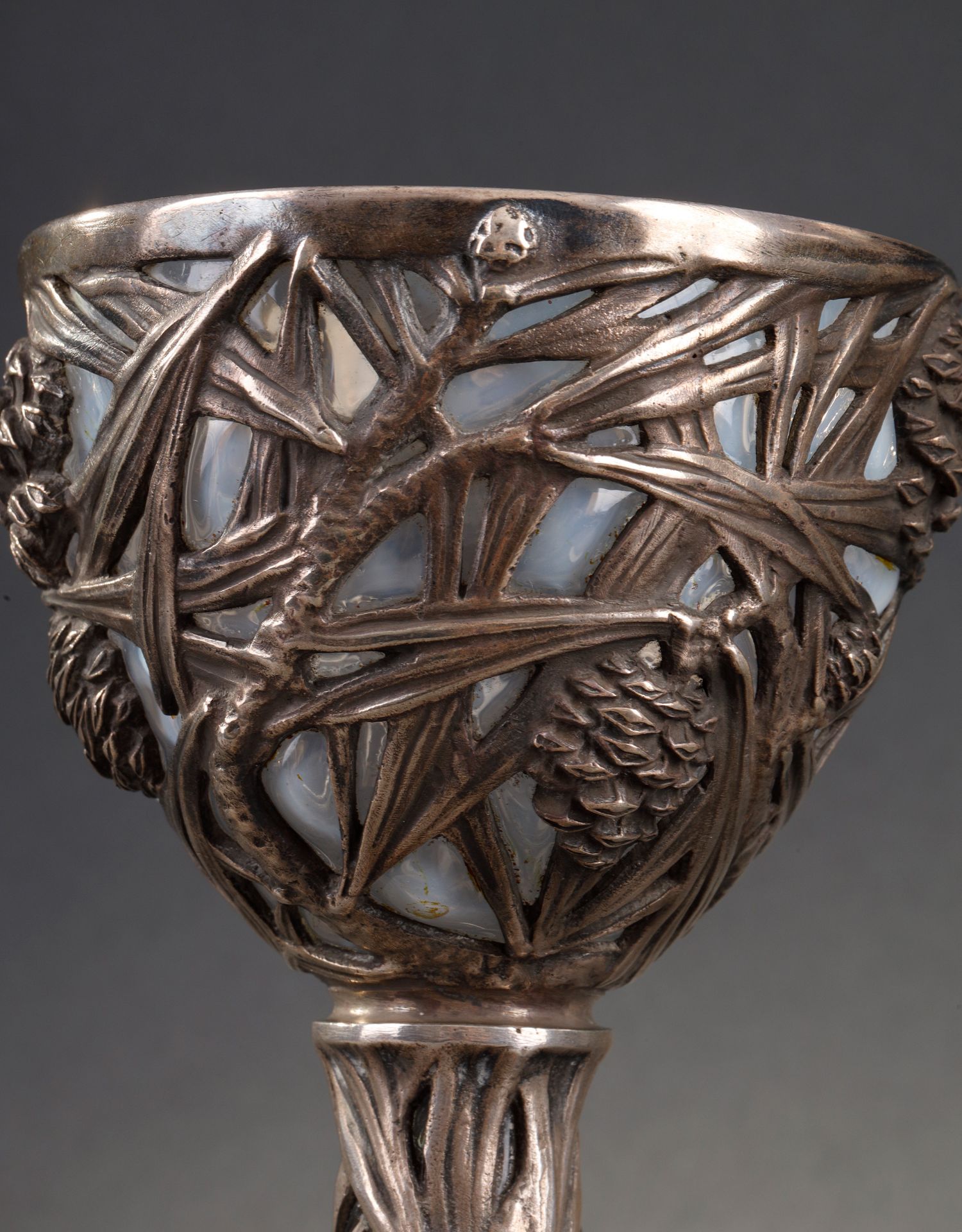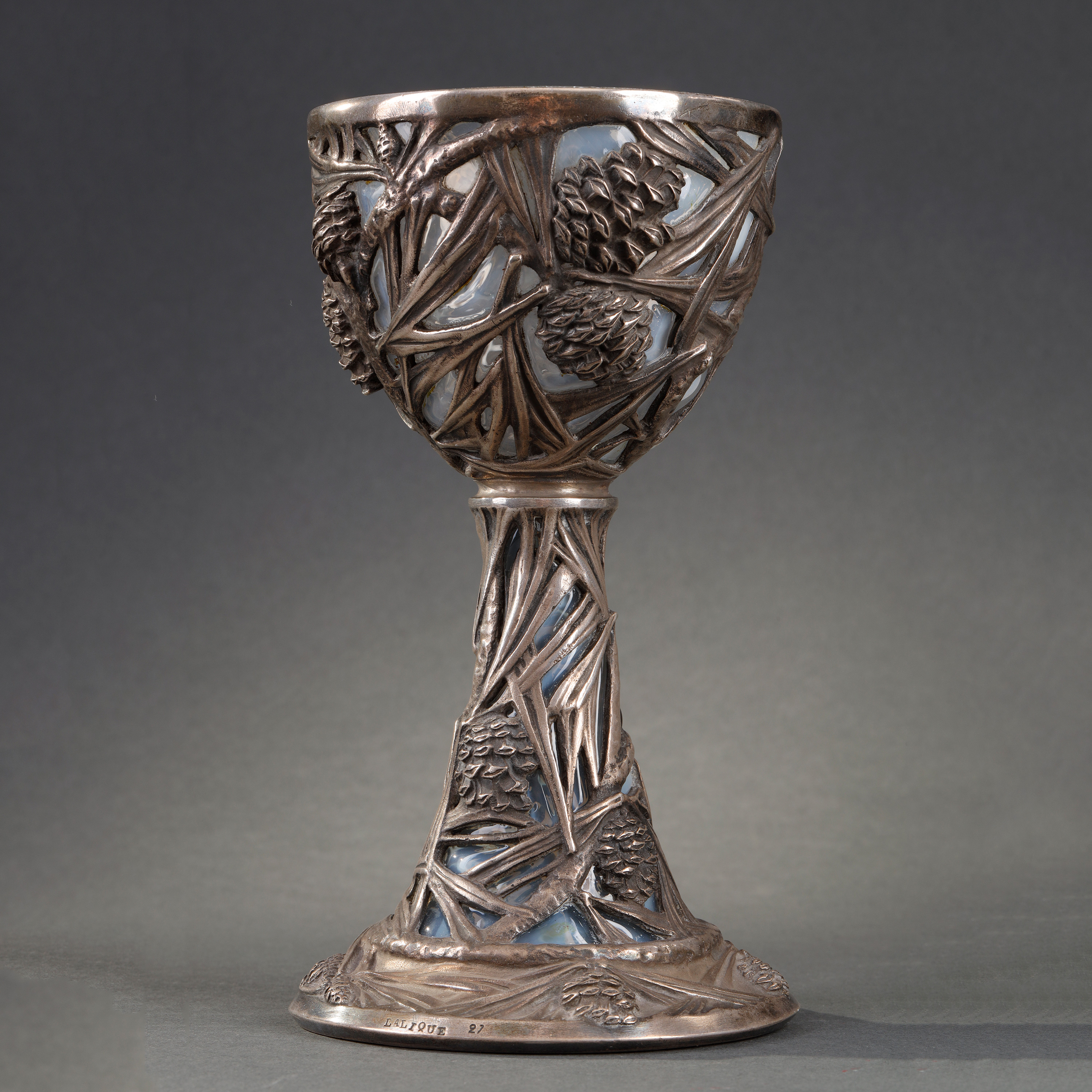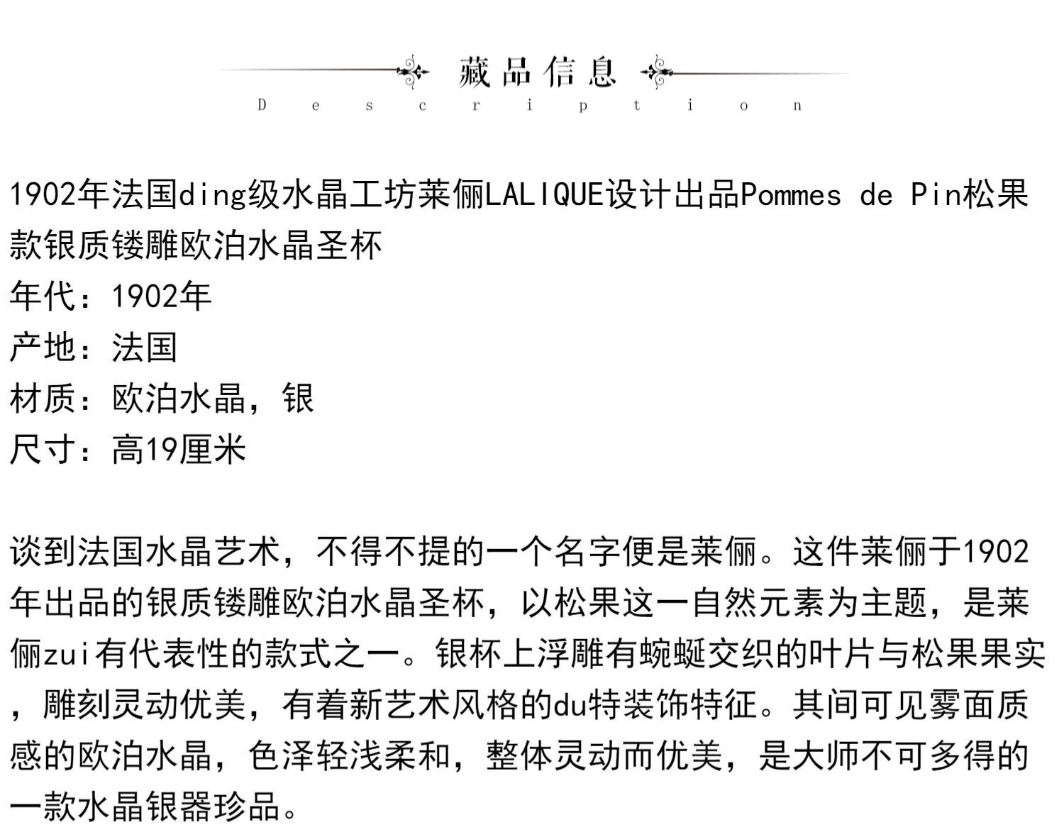 独角鹿西洋古董法国工坊莱俪LALIQUE松果款银质镂雕欧泊水晶圣杯