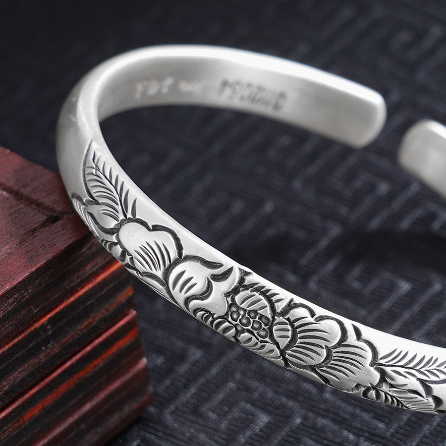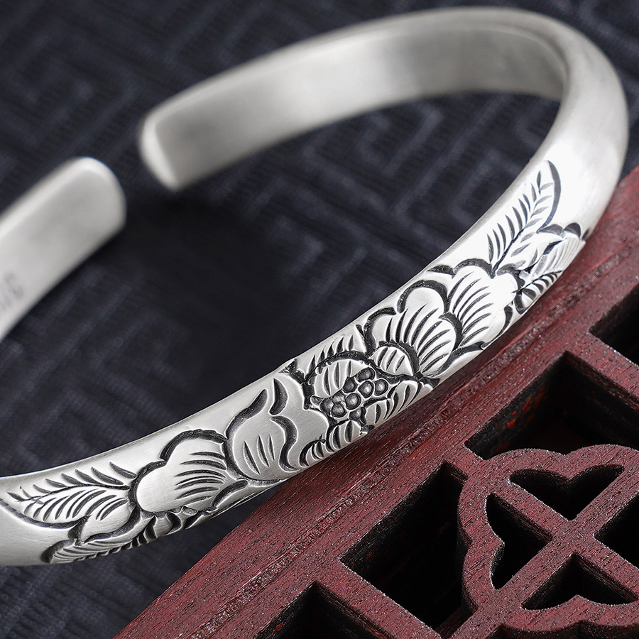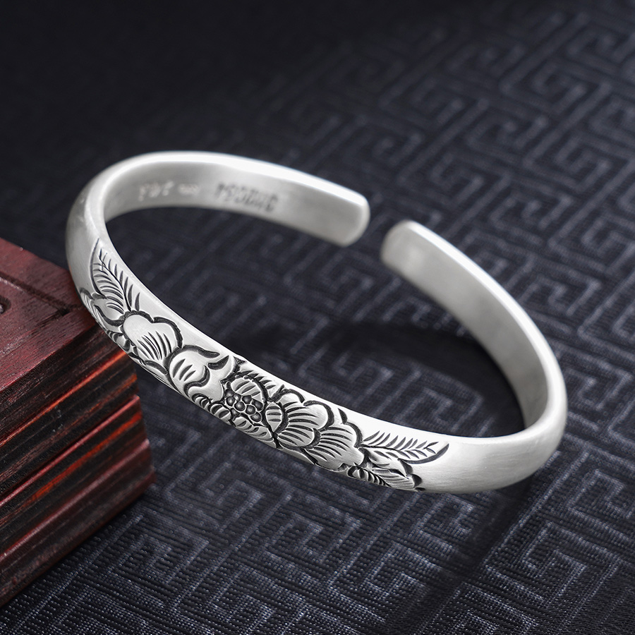 【寓意】:子佩集匠心手作银镯,采用成都金银器制作技艺,于足银镯体之上錾刻牡丹纹样,整体华贵典雅,寓意富贵吉祥。