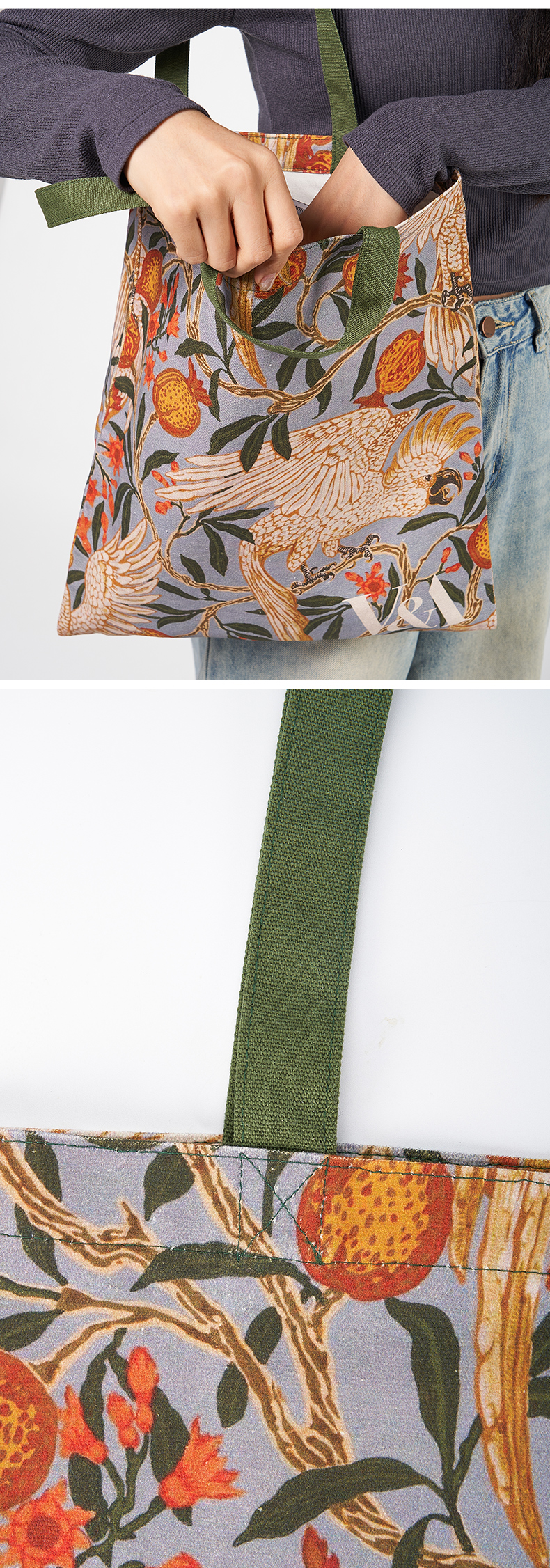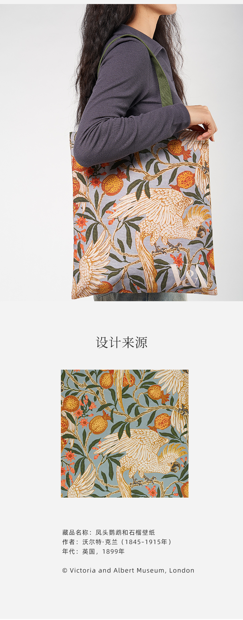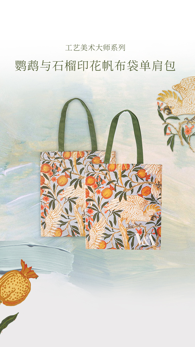 V&A博物馆 工艺美术大师系列 鹦鹉与石榴 印花 帆布袋 单肩包 手提包 通勤百搭包