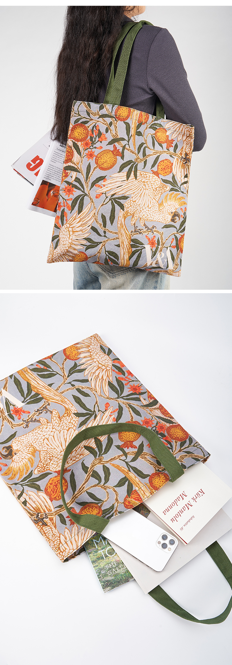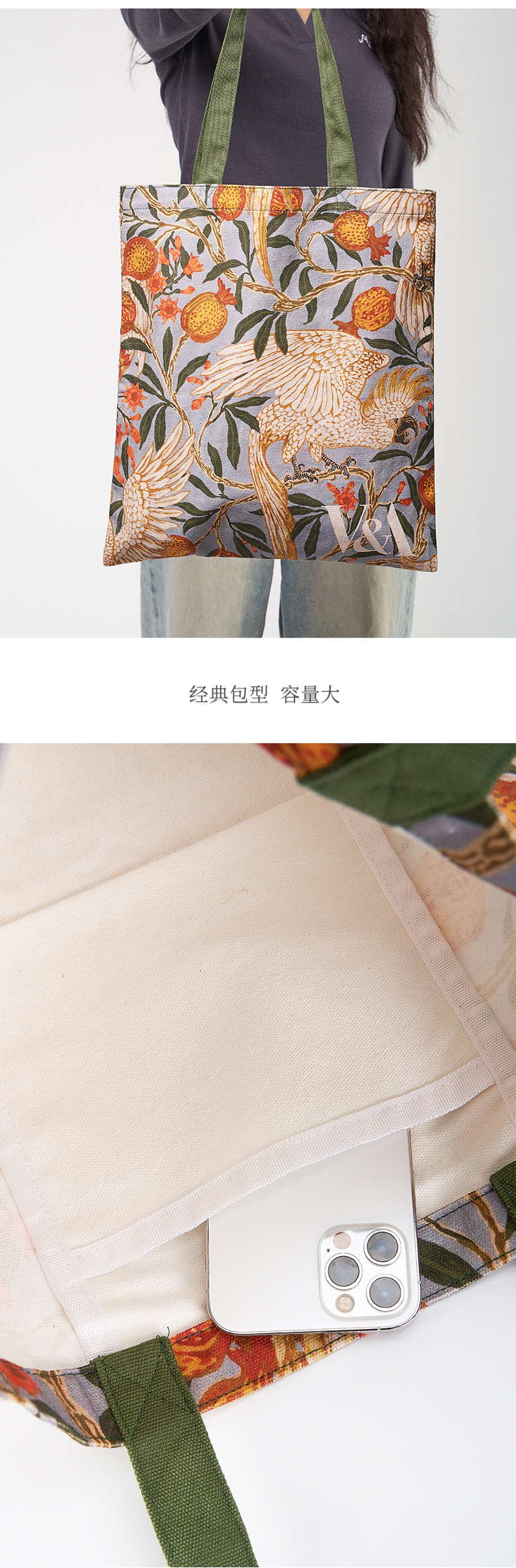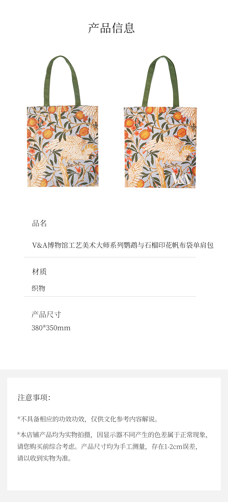 V&A博物馆 工艺美术大师系列 鹦鹉与石榴 印花 帆布袋 单肩包 手提包 通勤百搭包