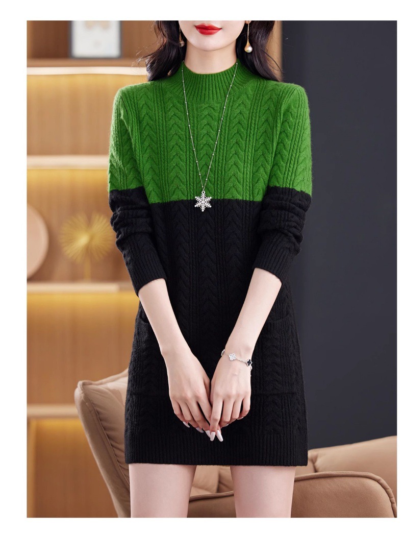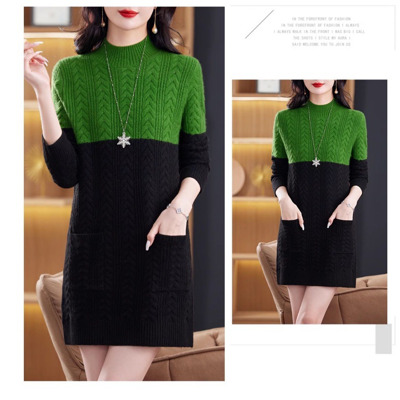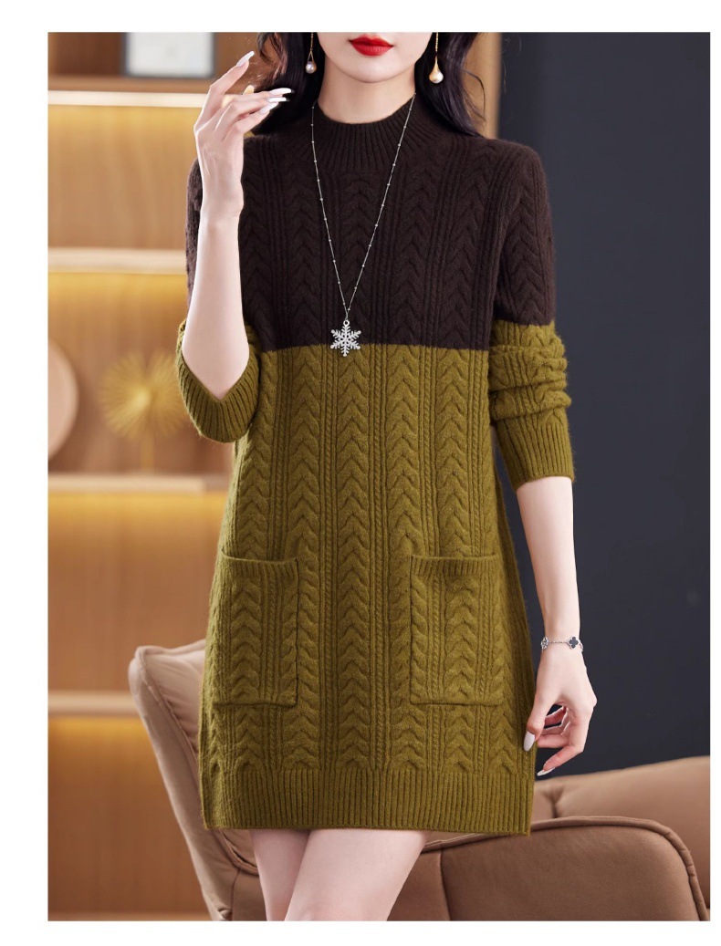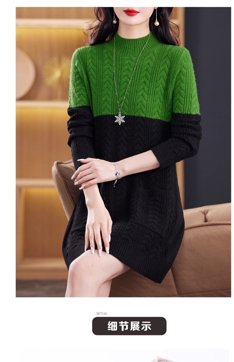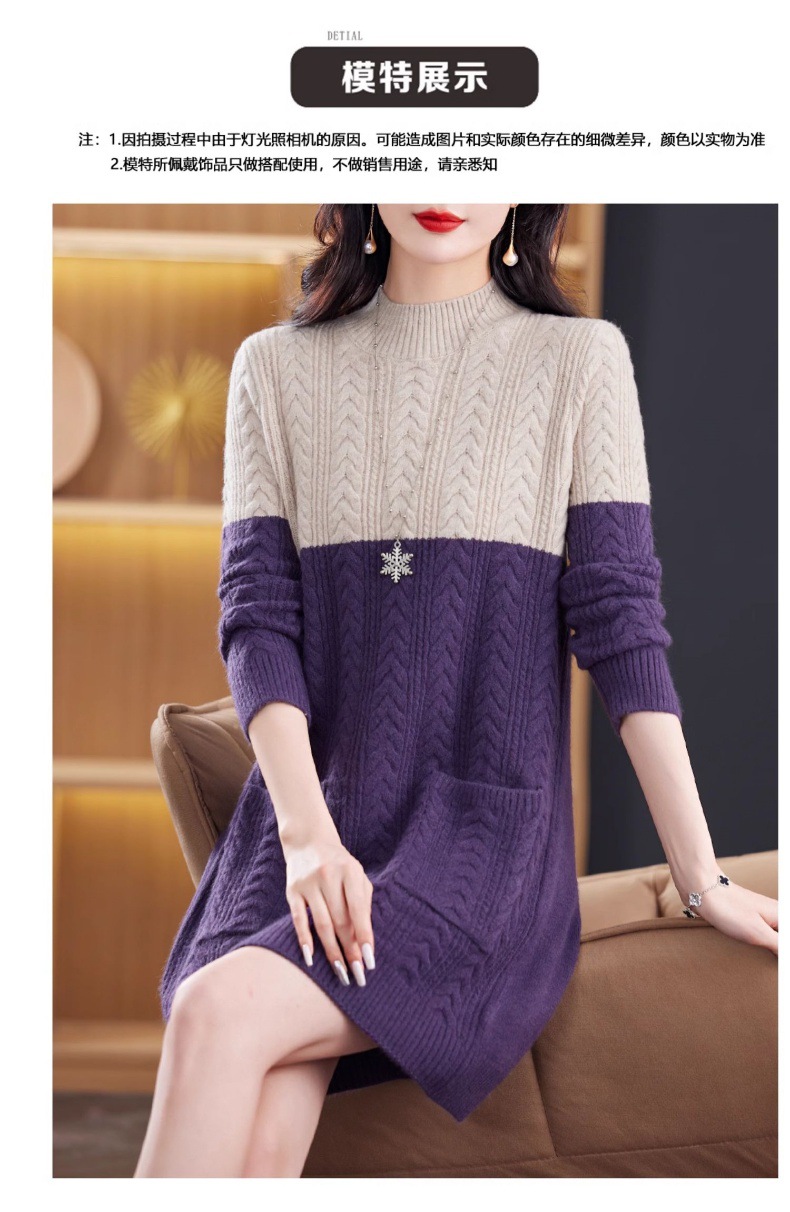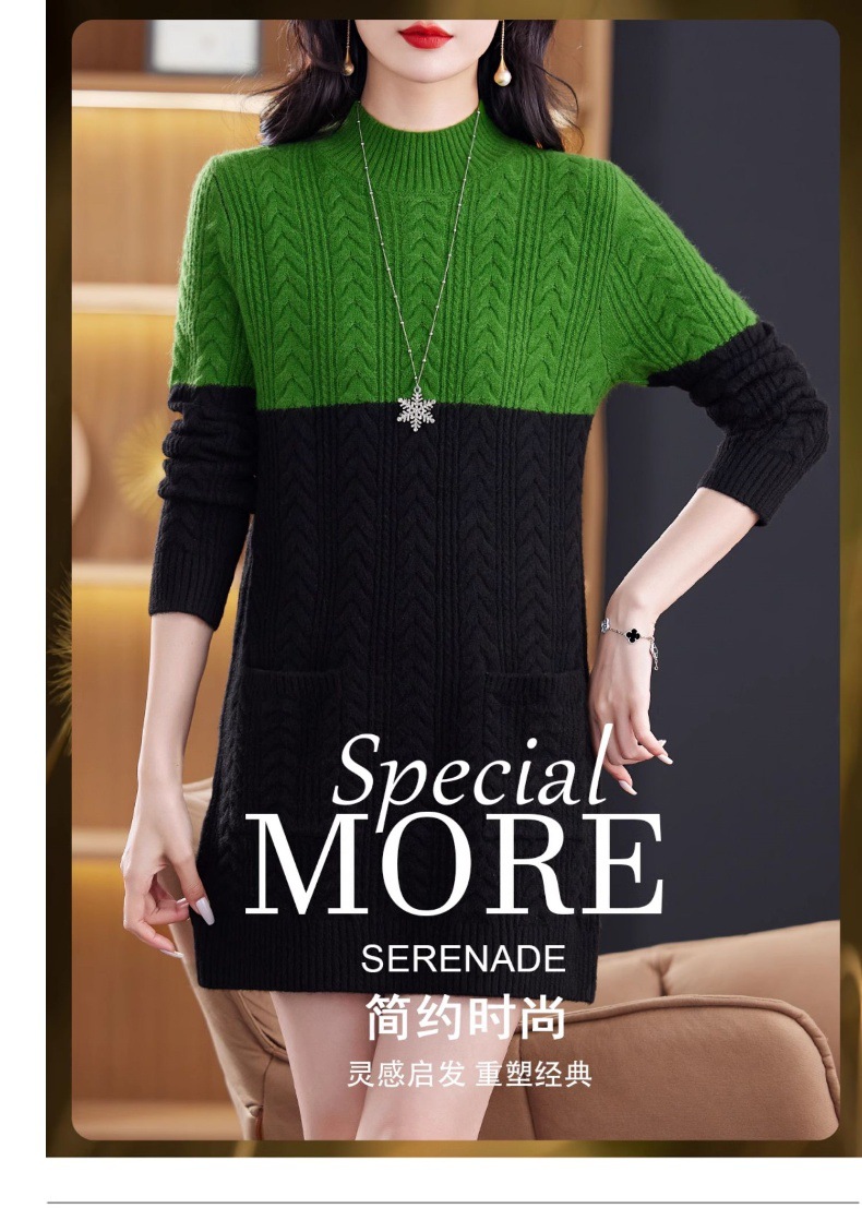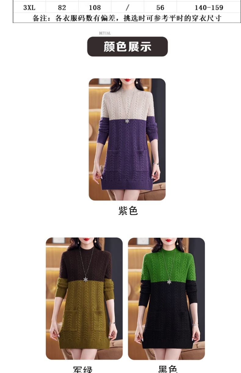 半高领中长款女士毛衣,冬季新款拼色螺纹口袋针织打底衫上衣CC-XX-3778