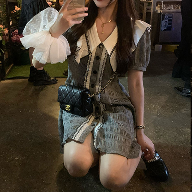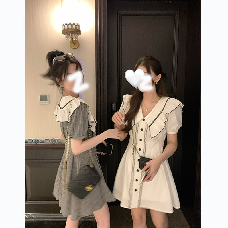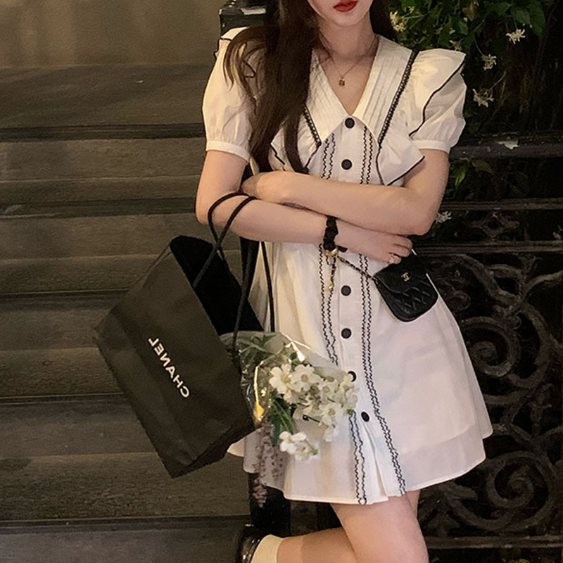(清仓现货)【社群供V】荷叶边连衣裙精致花边俏皮优雅V领单排扣涤纶2
