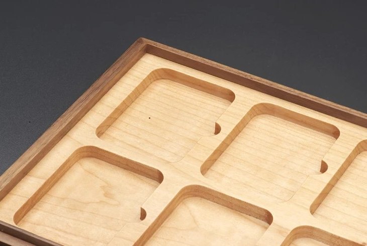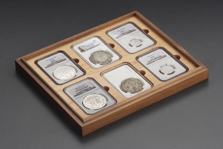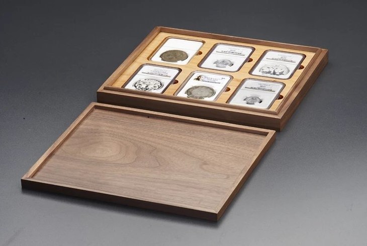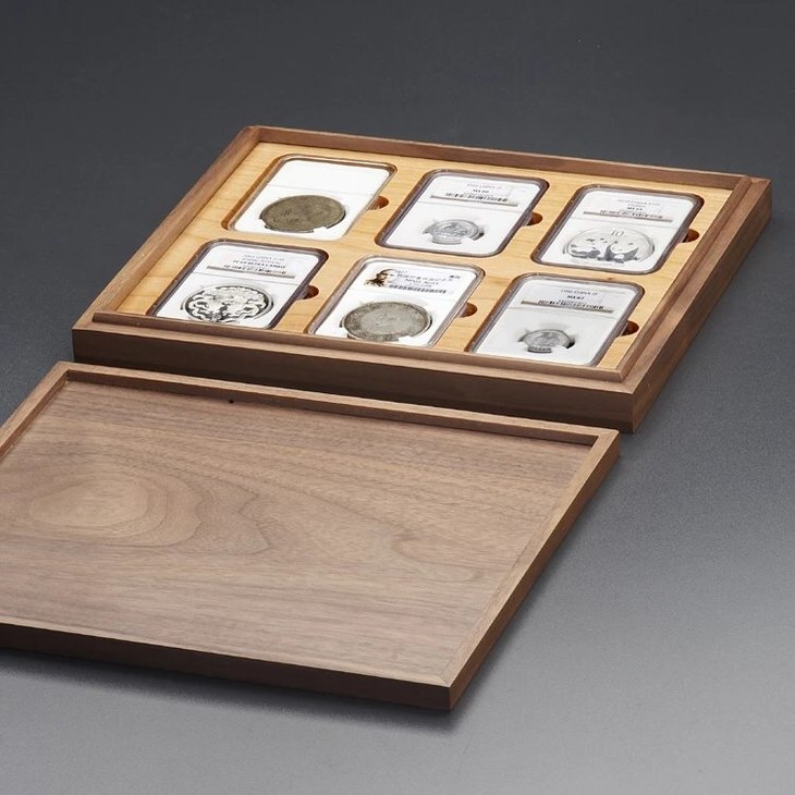 黑胡桃(枫木)单层实木托盘(6枚装NGC型),外盒尺寸:264*220*35mm,适用于市场上常见的各种NGC型评级币!如:NGC各时期盒,众诚,华夏,华龙,保粹,PCCB第2代盒,公博白盒等,为了加强盒子的更安全性,避免温差与天气干湿带来的盒子变型与开裂脱胶,主盒与盖四边采用黑胡桃实木,盒盖上面二个面用DMF贴厚黑胡桃实木;里面全枫木CNC缕槽,四边嵌边工艺制作,以力保整体美观,精细,安全,耐用!