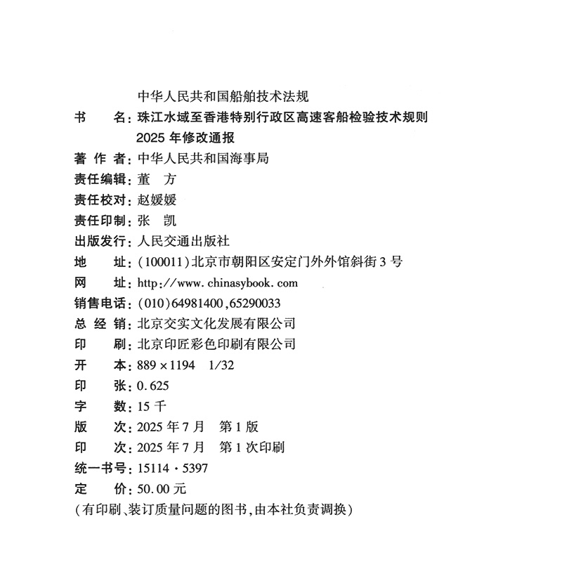 书名:珠江水域至香港特别行政区高速客船检验技术规则 2025年修改通报