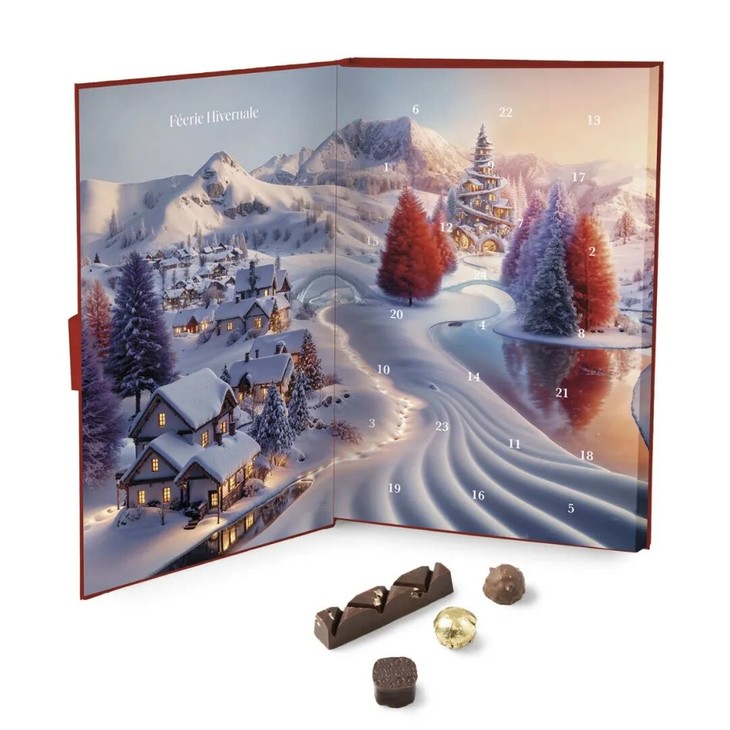 来看看官网的介绍:“巧克力圣诞倒计时日历始于一座魔法山谷,金色的天空下矗立着盘旋缎带阶梯的塔楼。每日庆典时分,发光的窗扉将揭晓甜蜜宝藏——深褐与纯白巧克力交织出精妙平衡,宛若一件节日瑰宝,开启纵享丝滑的味觉奇幻之旅。天鹅绒般柔滑的甘纳许流淌着细腻层次,酥脆糖衣杏仁在齿间迸发欢愉,每一口都是匠艺的诗意绽放,源自天然纯粹的巧克力杰作。雪檐覆盖的童话屋檐下,每日都是值得珍藏的庆典,绵密香醇的风味如钟摆般流转,编织出充满珍贵时刻的倒数时光。让圣诞魔力在此刻尽情苏醒,于这座风味主宰的魔法村落,开启属于你的冬日甜蜜寓言。”