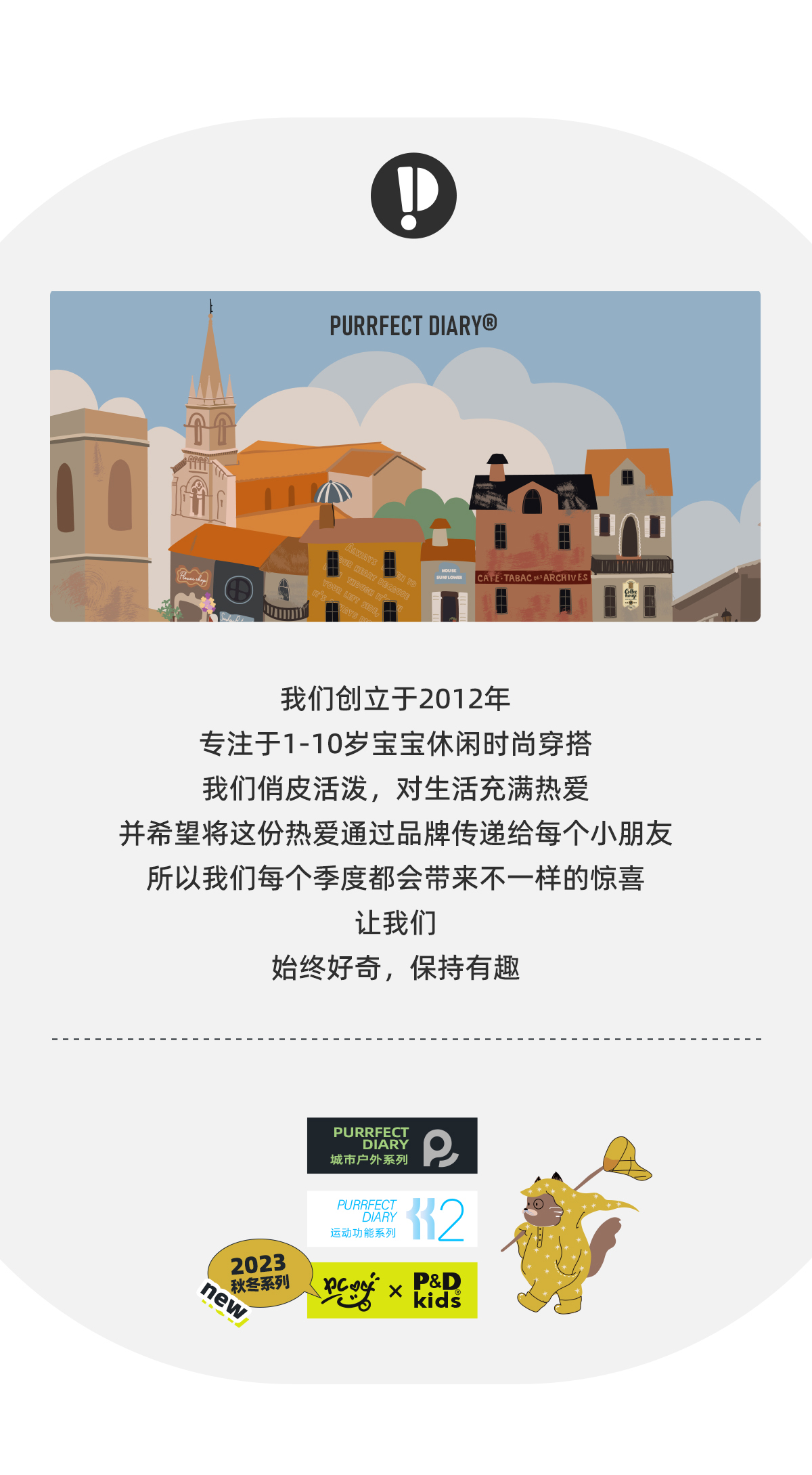- Purrfect-Diary专注于贴近自然随性的穿着概念,轻奢平价的童装文化传播,在产品设计上更加注重婴童穿着的舒适性、安全性、更出众的国际化品牌,将欧美的育婴文化在中国进行深入的传播与推广。