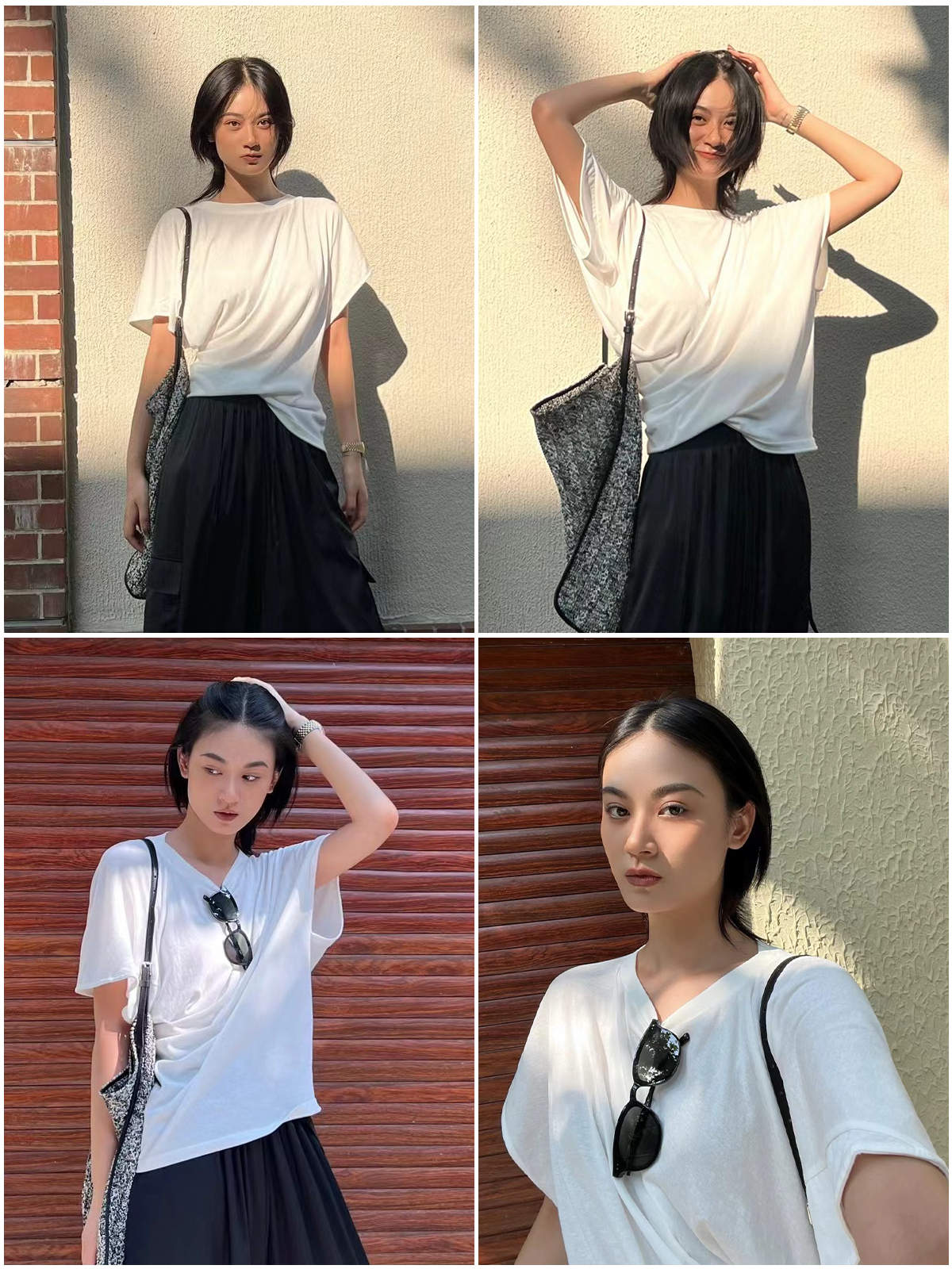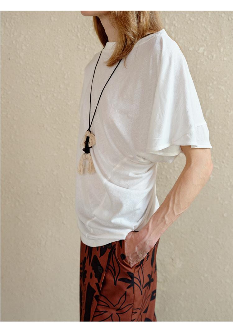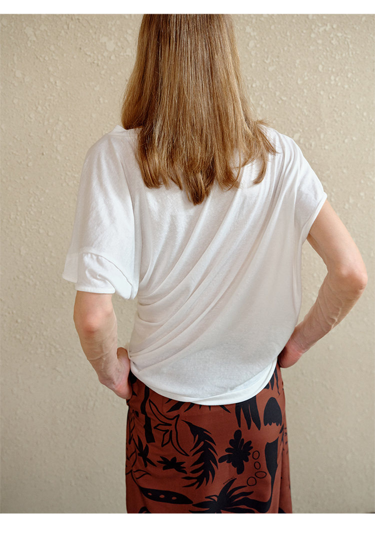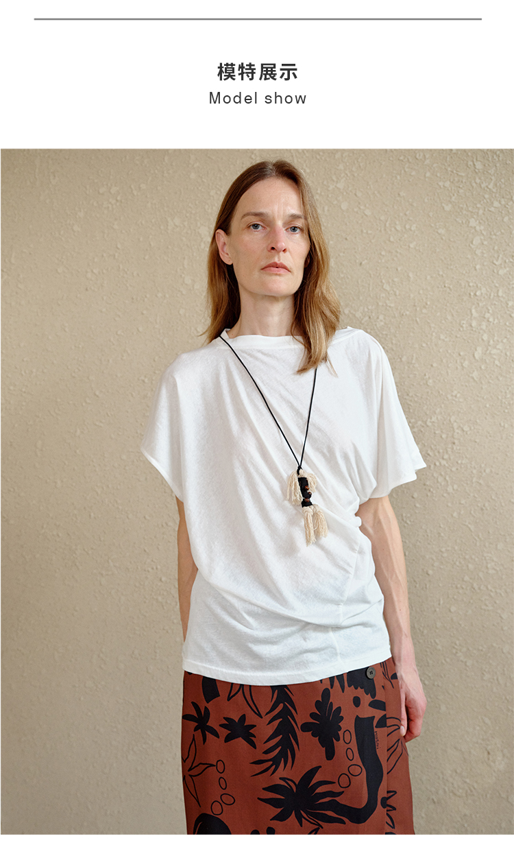 HIDEMI 度假系列水洗自然棉不对称扭扭式堆叠感短袖针织t恤上衣 白色/灰色/黑色
