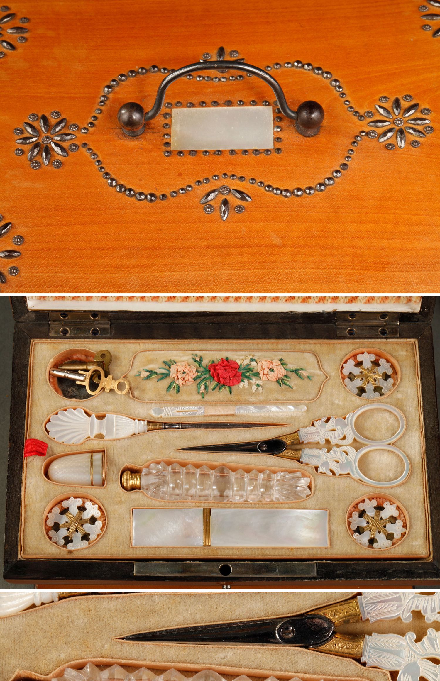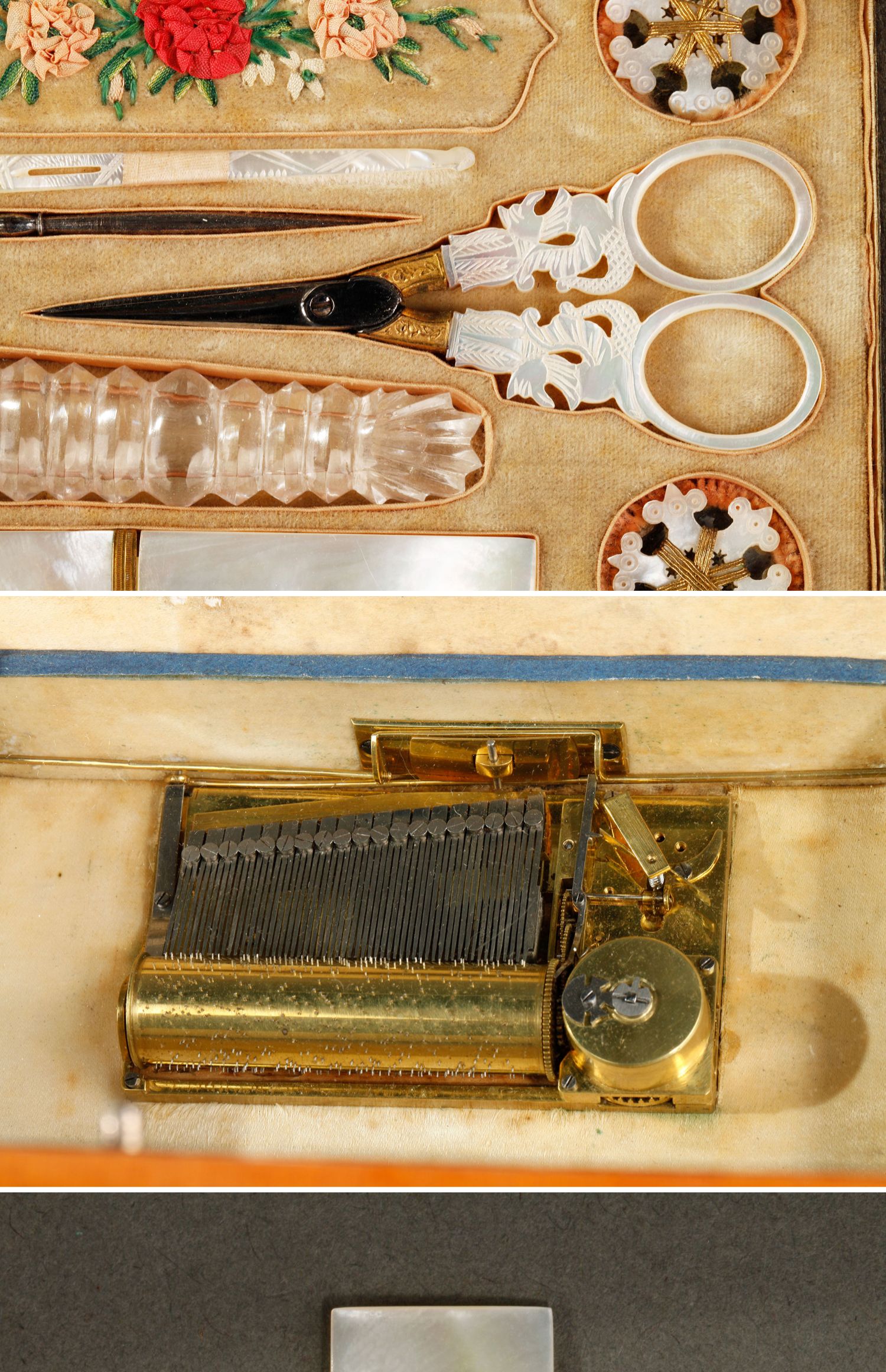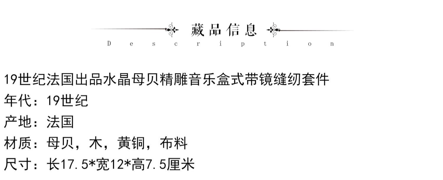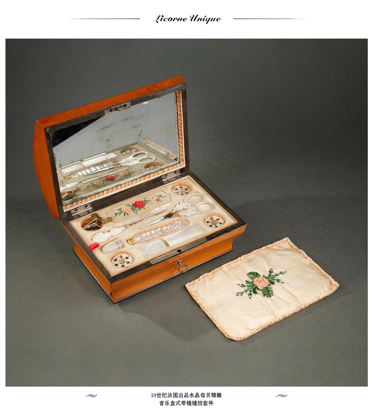 独角鹿西洋古董法国水晶母贝精雕音乐盒式带镜缝纫套装淑女珍藏