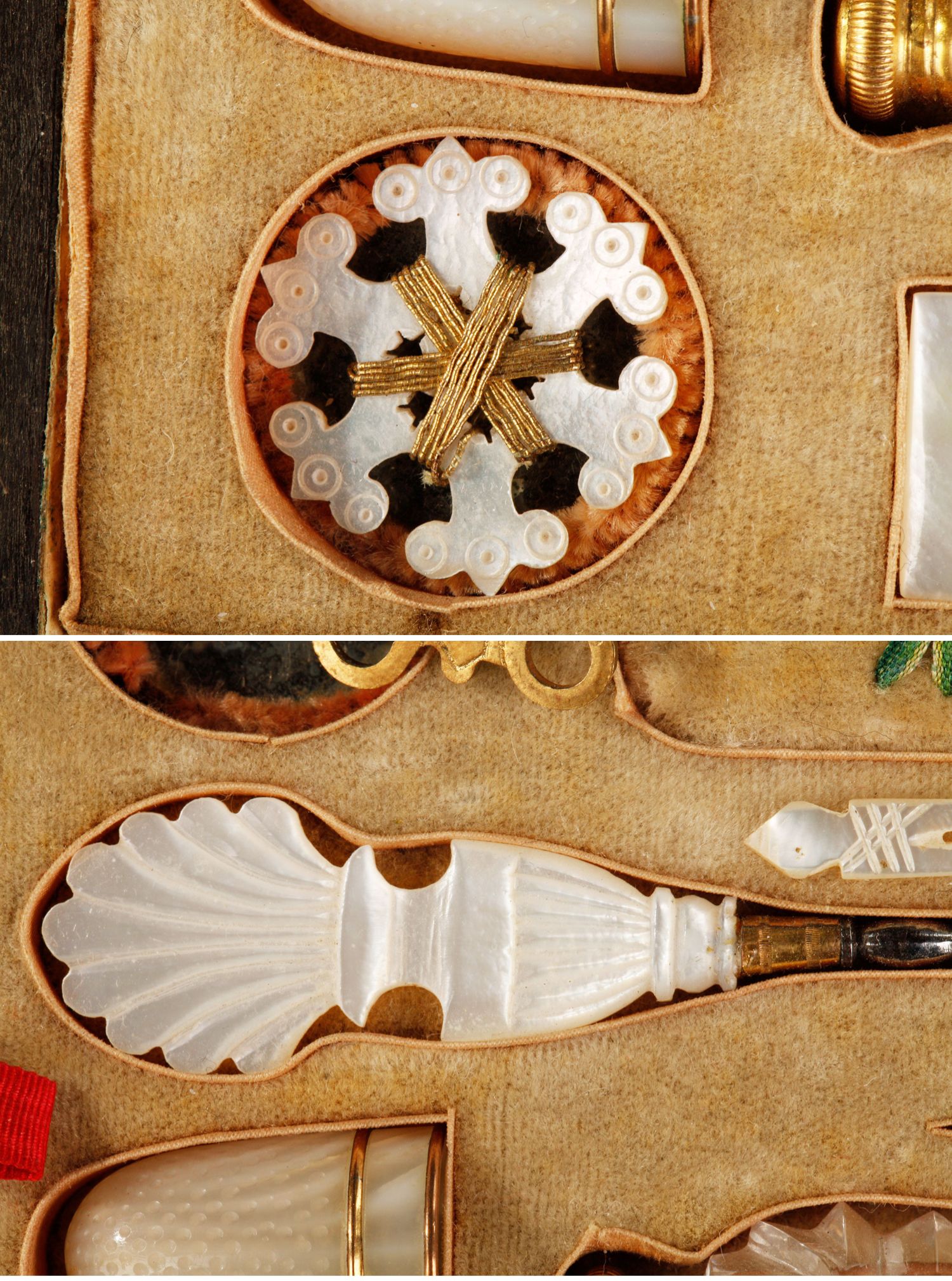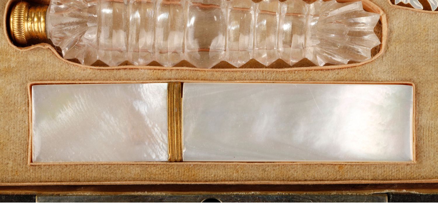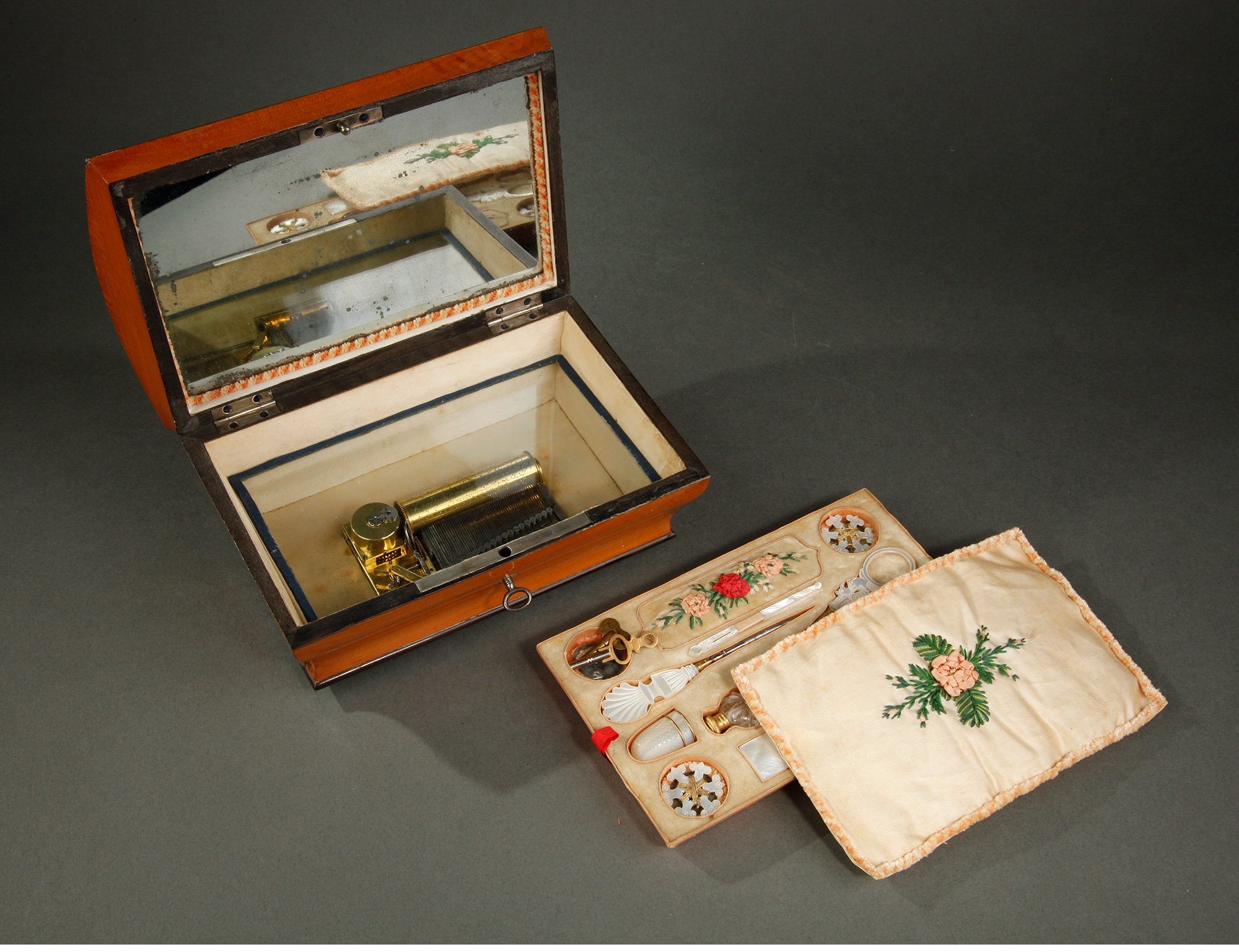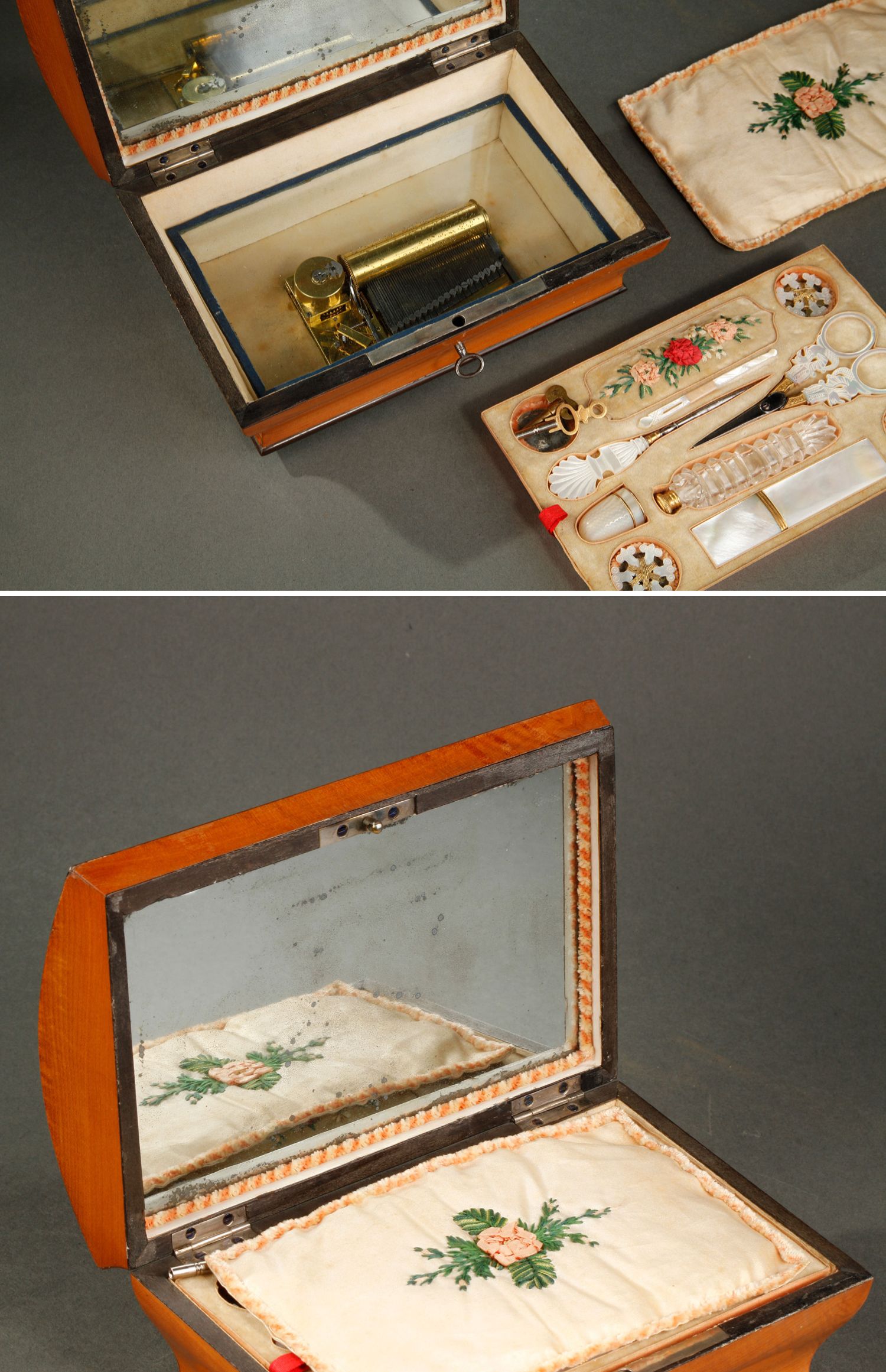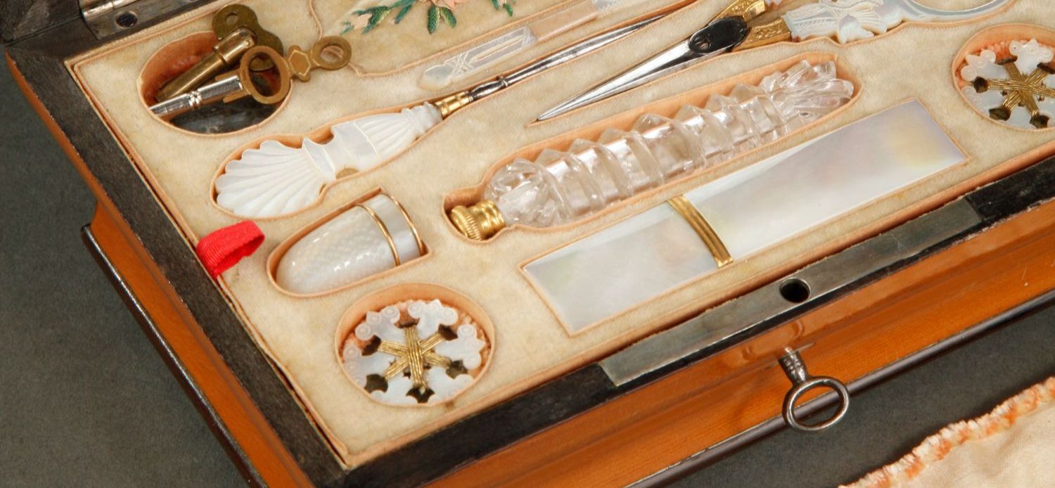 独角鹿西洋古董法国水晶母贝精雕音乐盒式带镜缝纫套装淑女珍藏