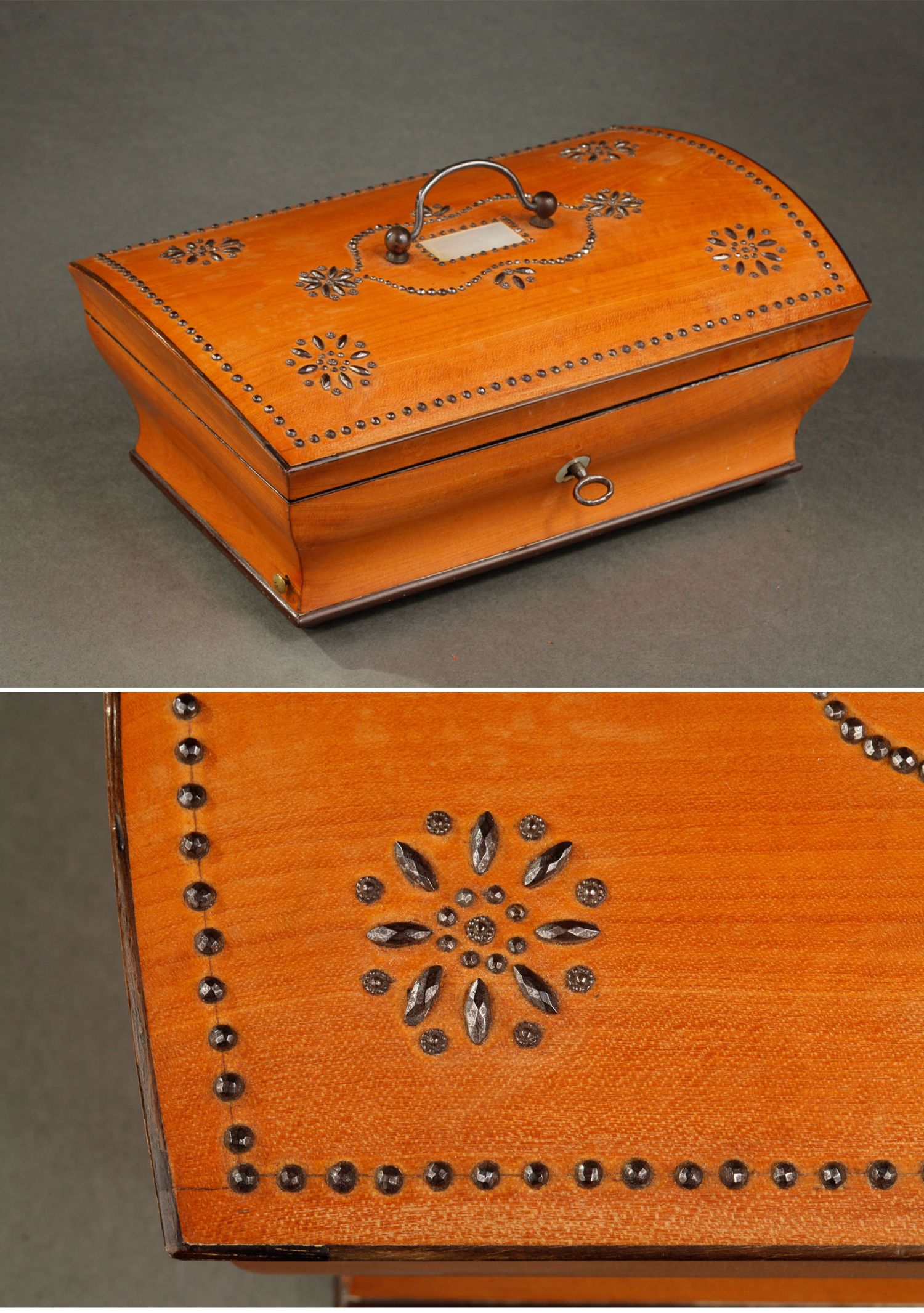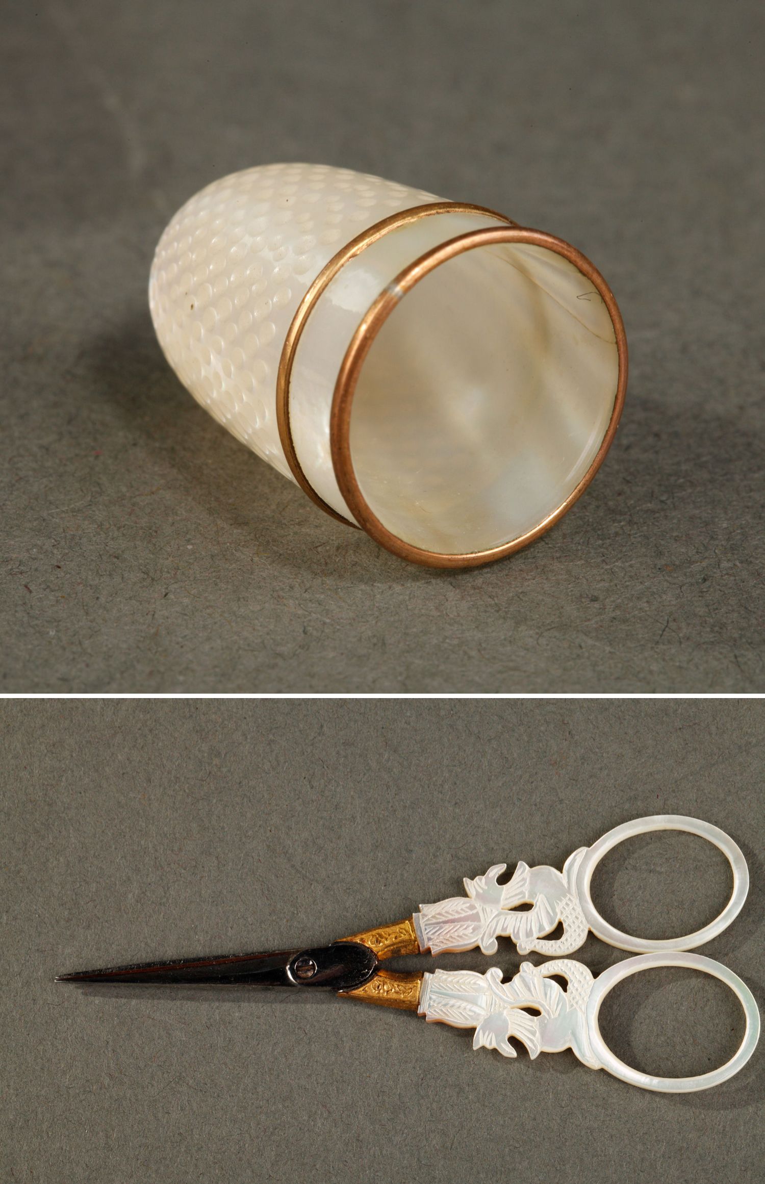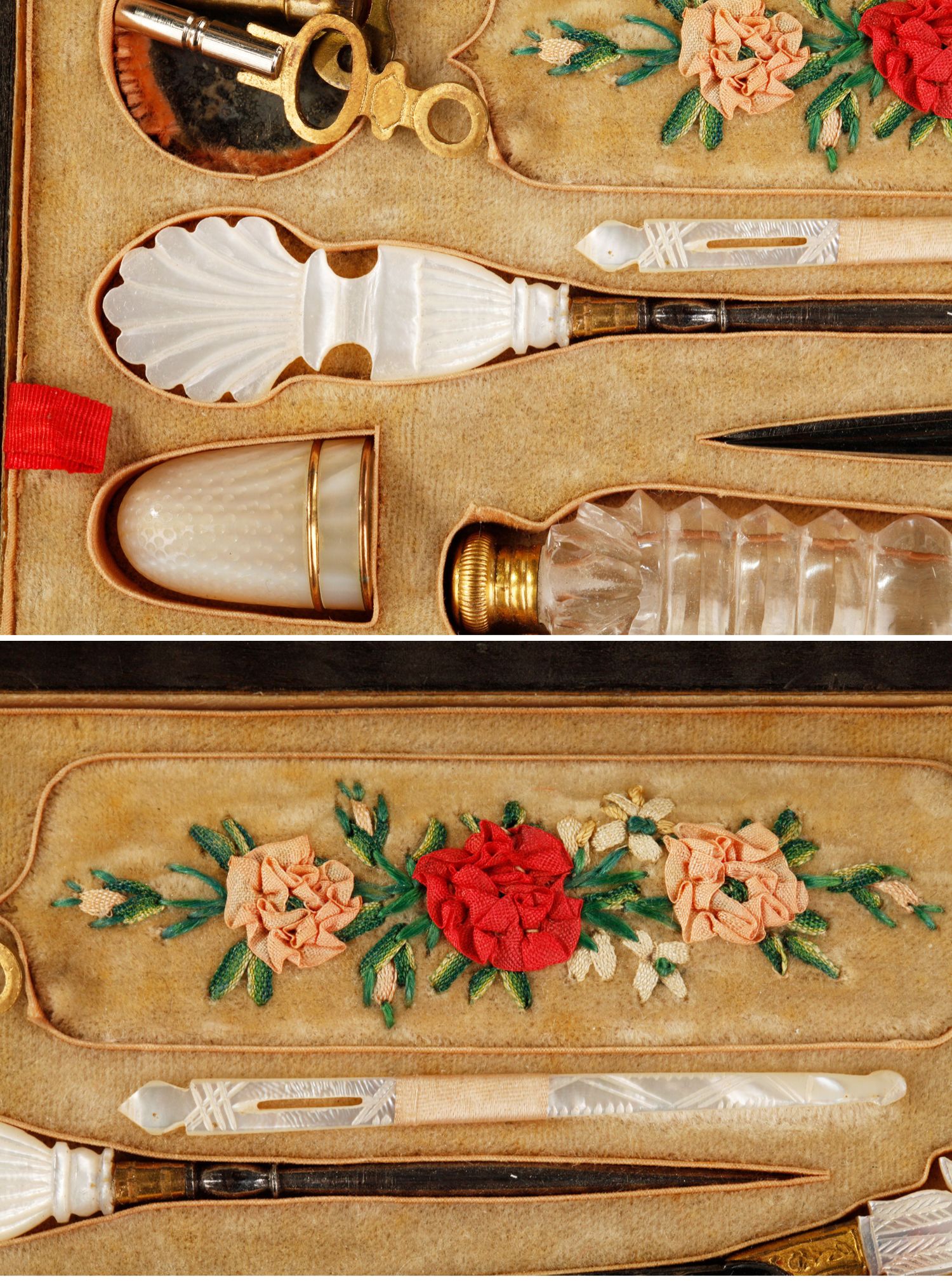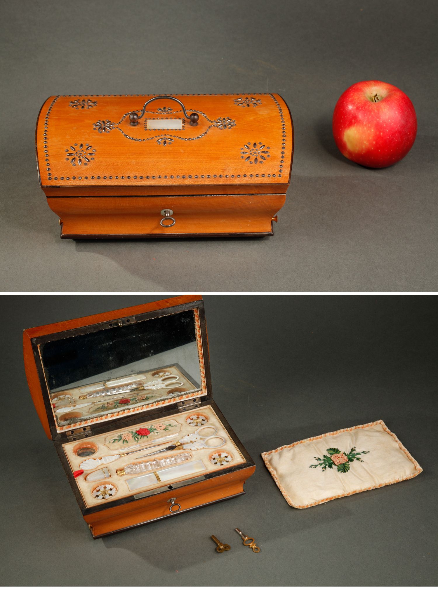 独角鹿西洋古董法国水晶母贝精雕音乐盒式带镜缝纫套装淑女珍藏