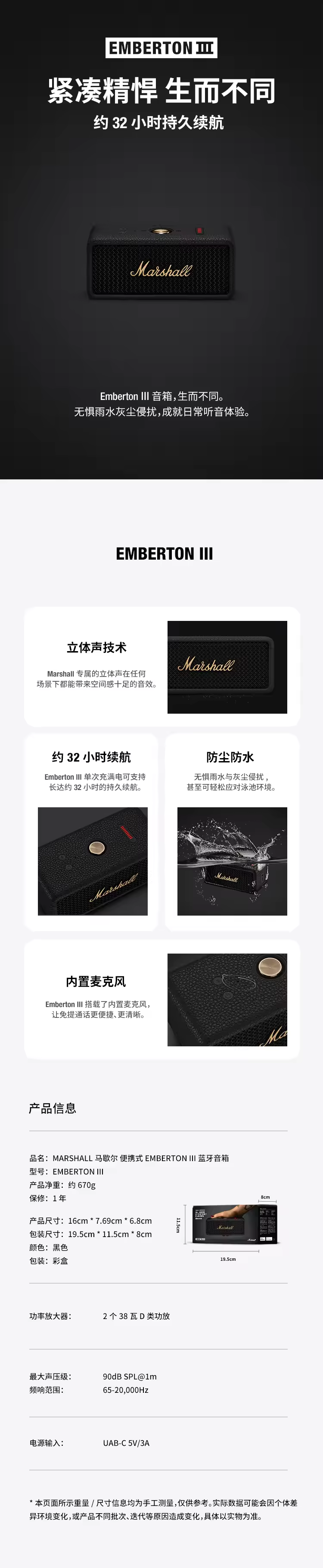 音箱 便携蓝牙 EMBERTON III 黑金 - 马歇尔