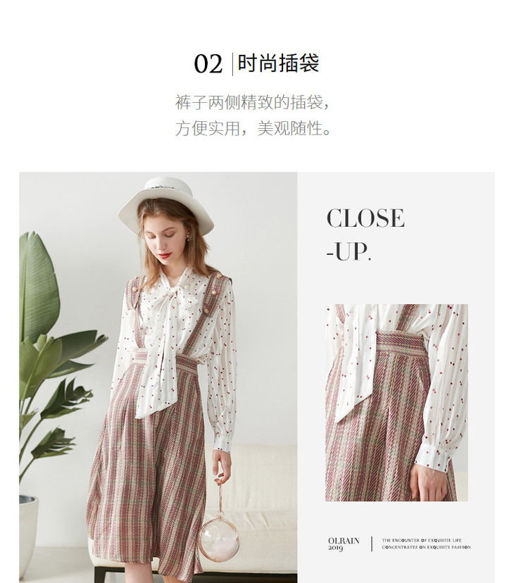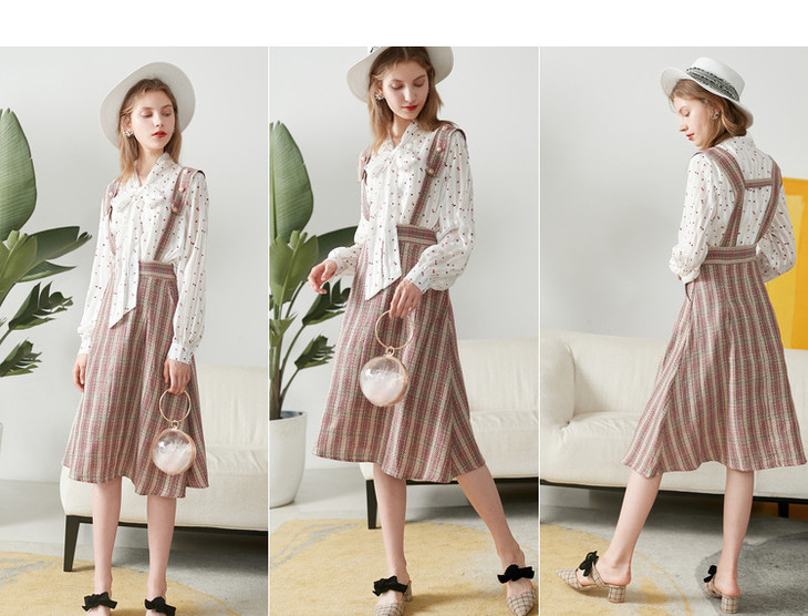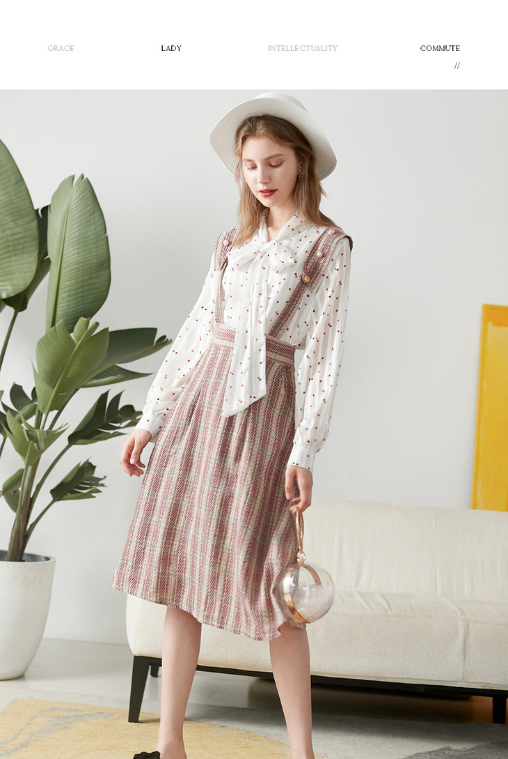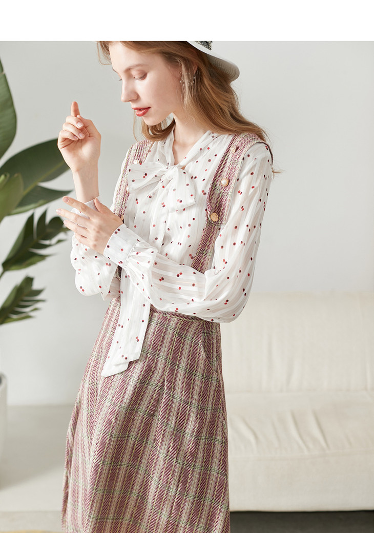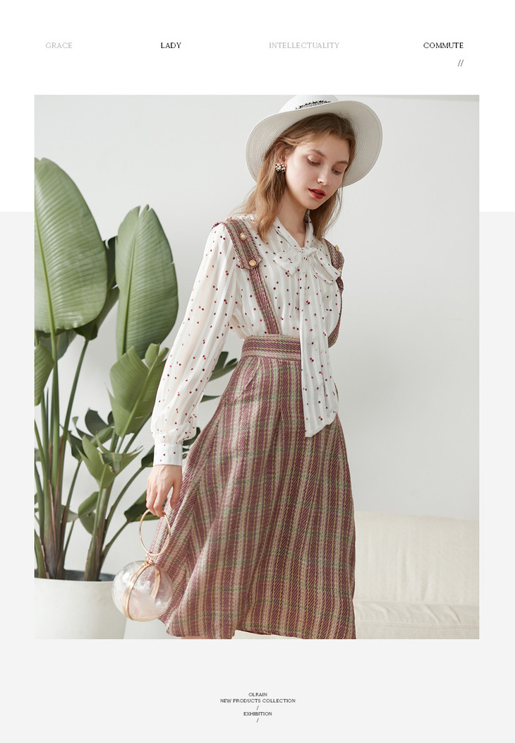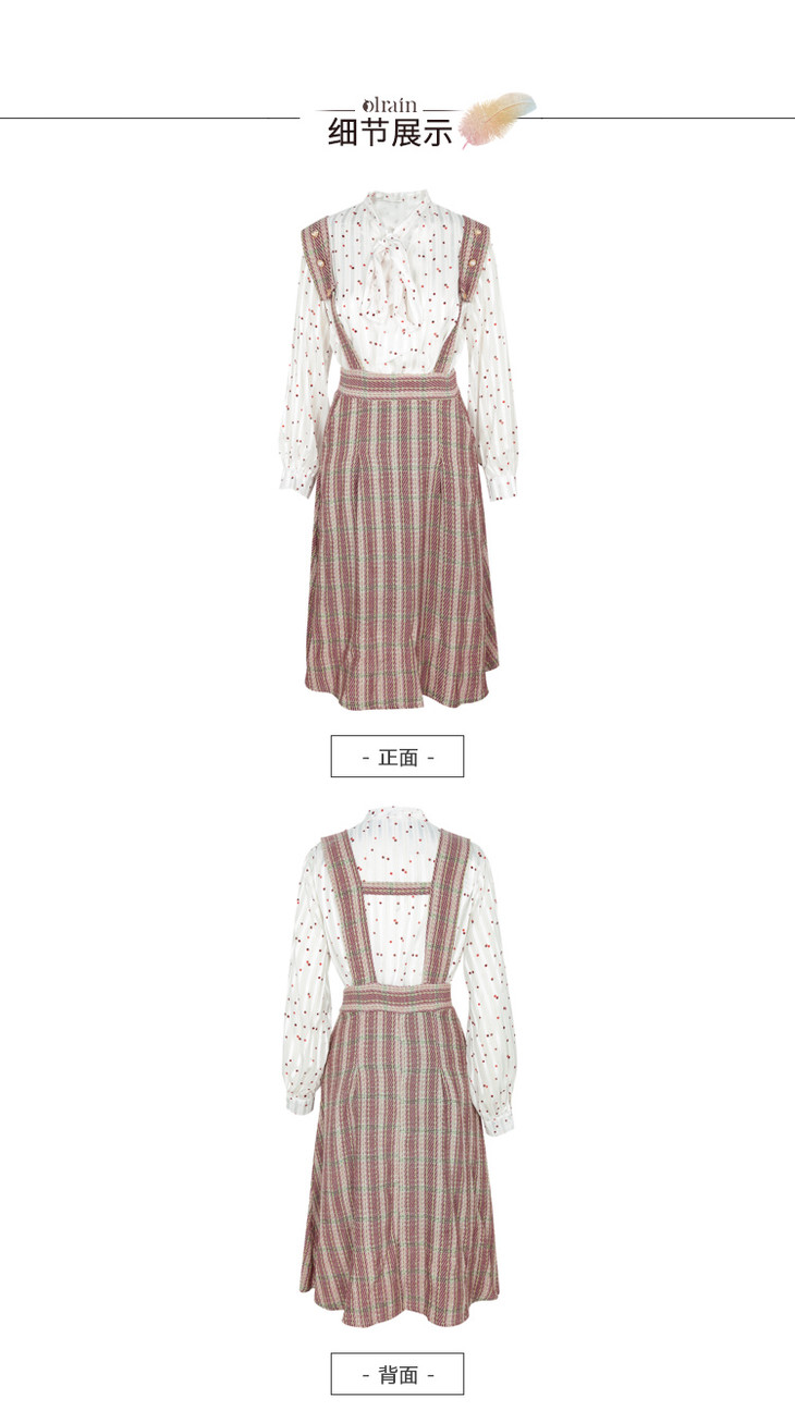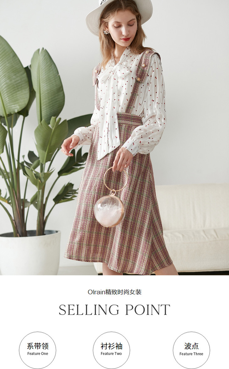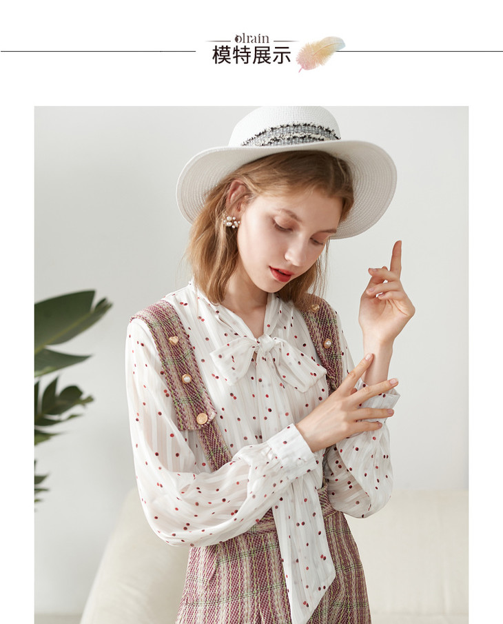 欧芮儿新款波点雪纺衬衫女背带裙连衣裙两件套时尚套装