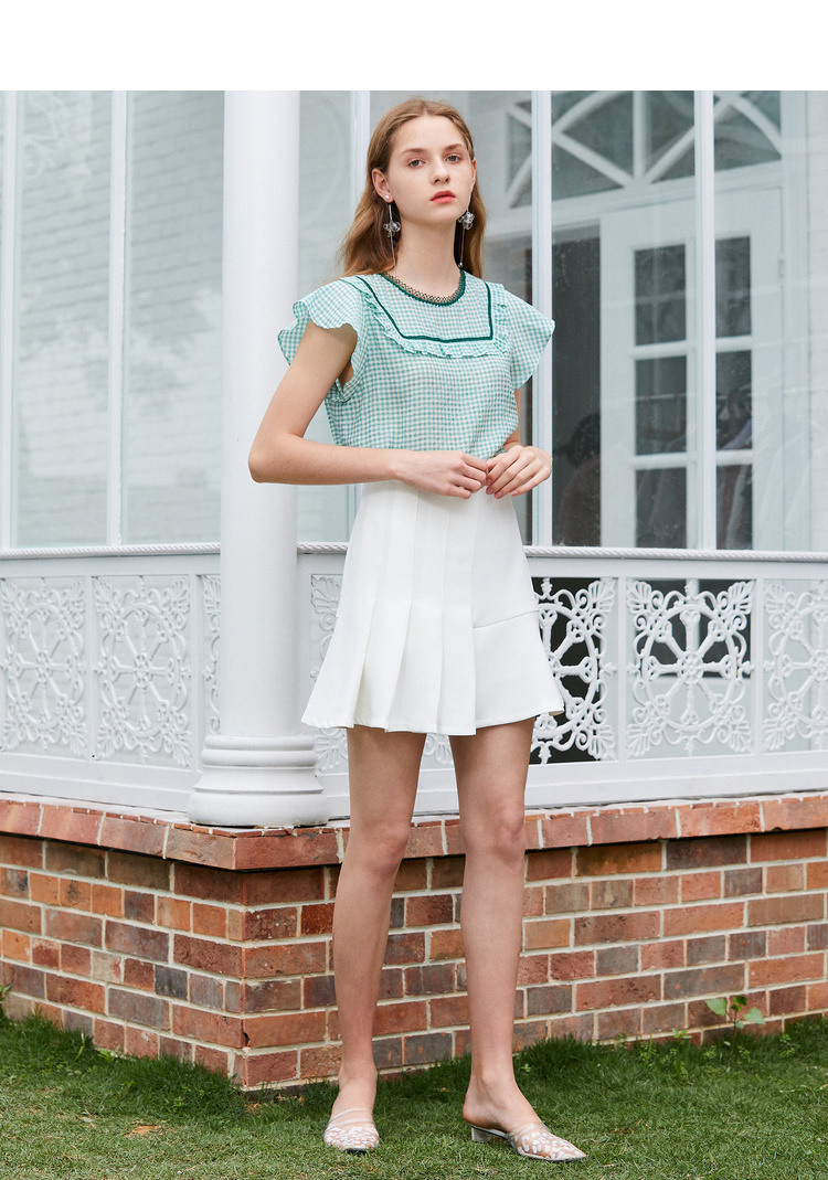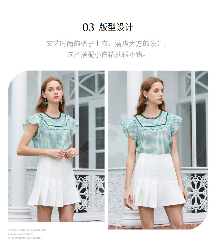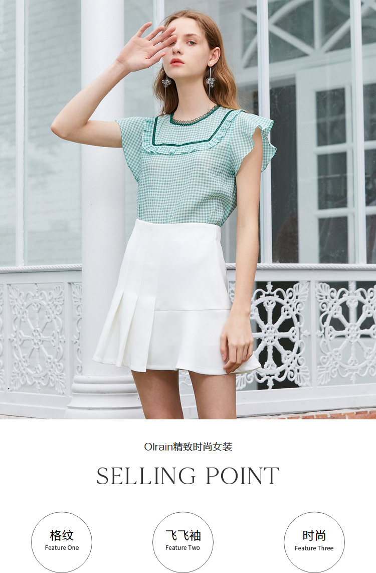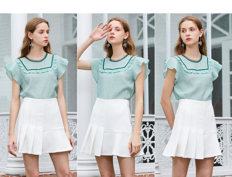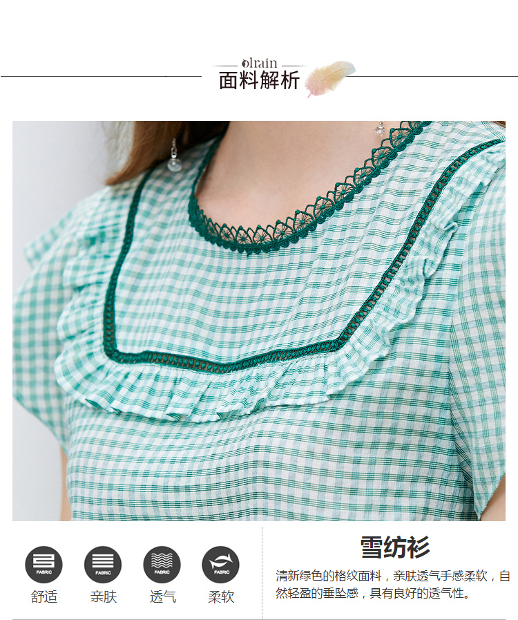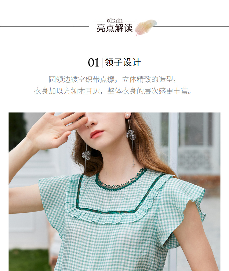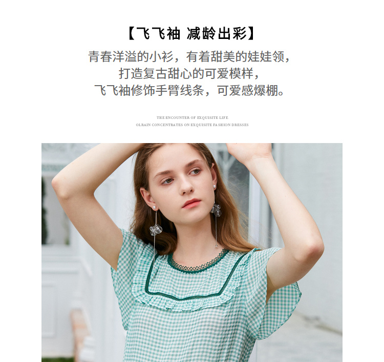 欧芮儿2019新款女装夏装时尚娃娃领格子雪纺衫女飞飞袖洋气小衫