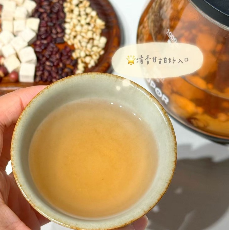 煮好后闻到谷物烘焙香,口感是天然的甘甜回醇,无添加剂,含山药多糖、茯苓多糖等活性成分,兼具食补与药效