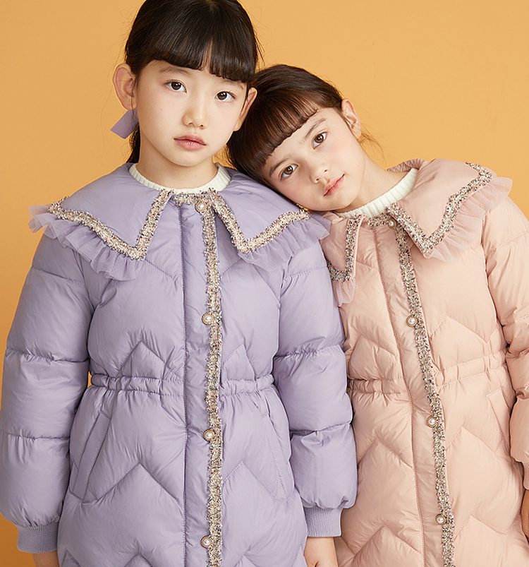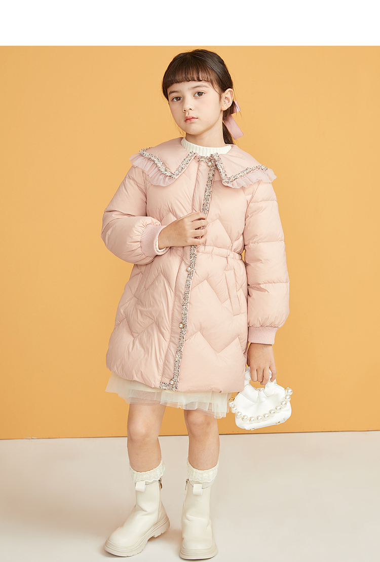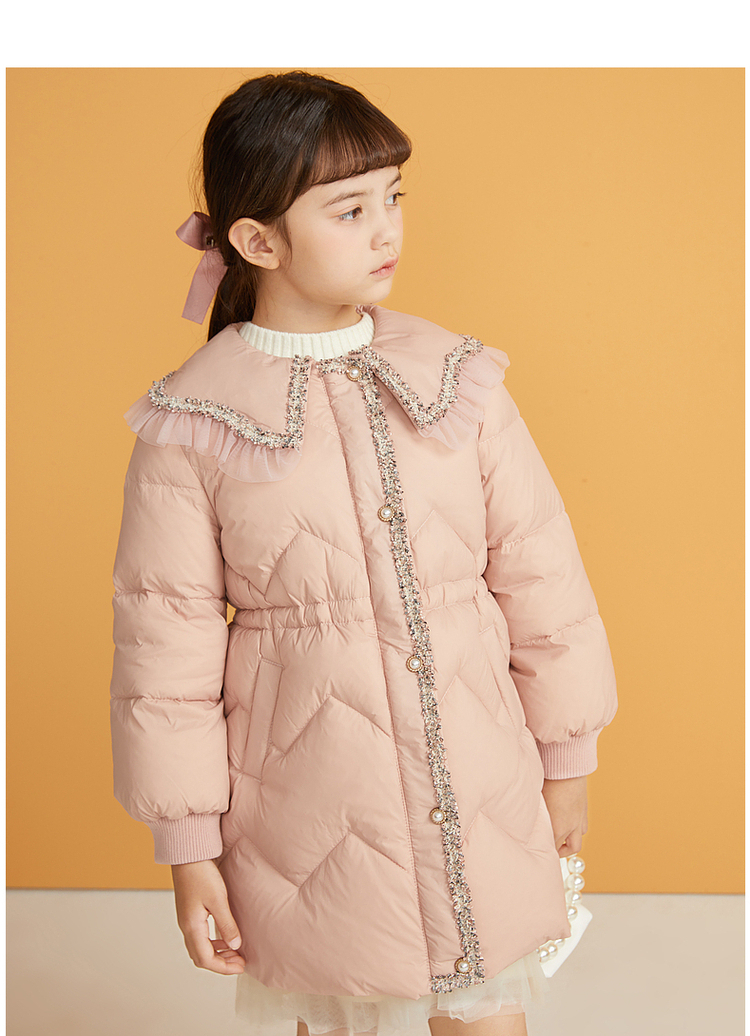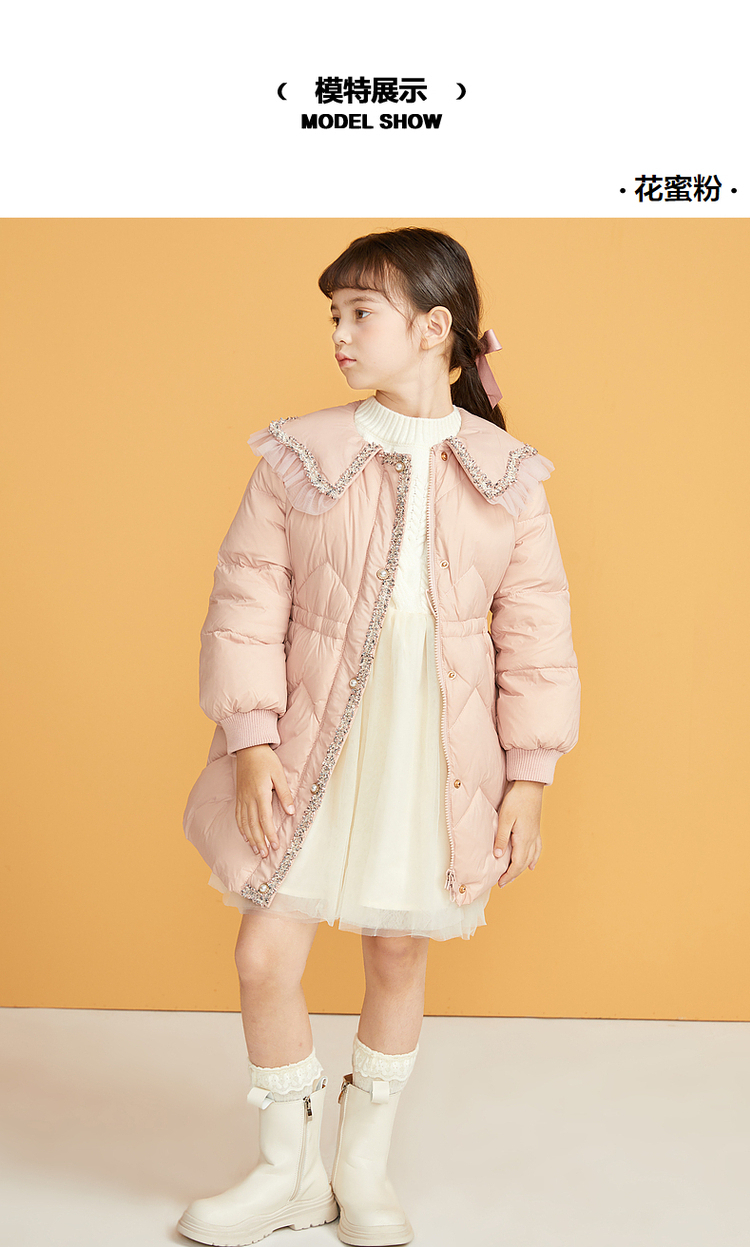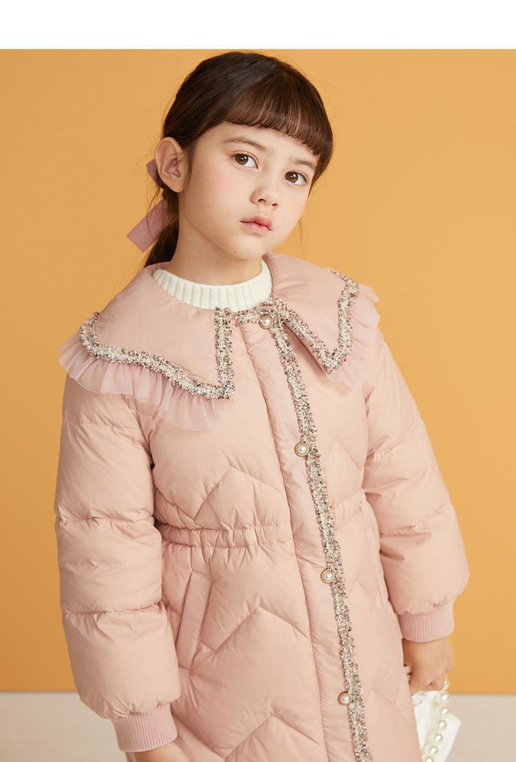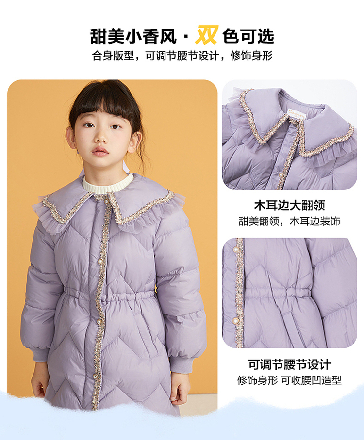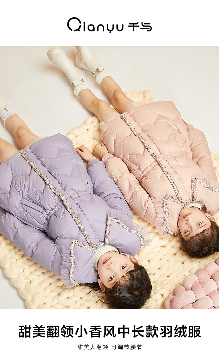 笛莎千与2024冬季新款男女童同款甜美翻领小香风中长款羽绒服
