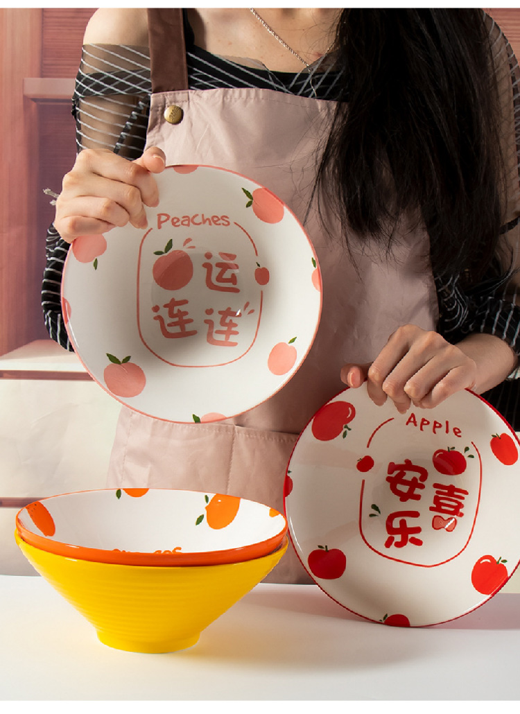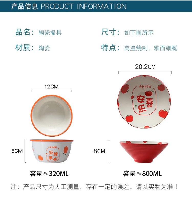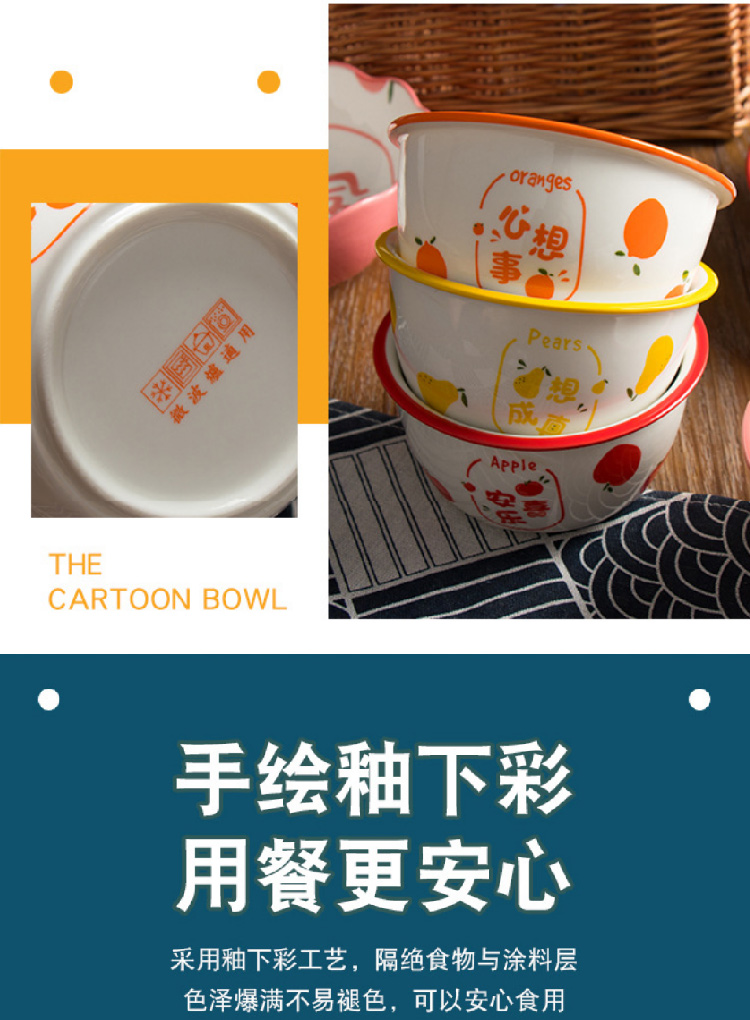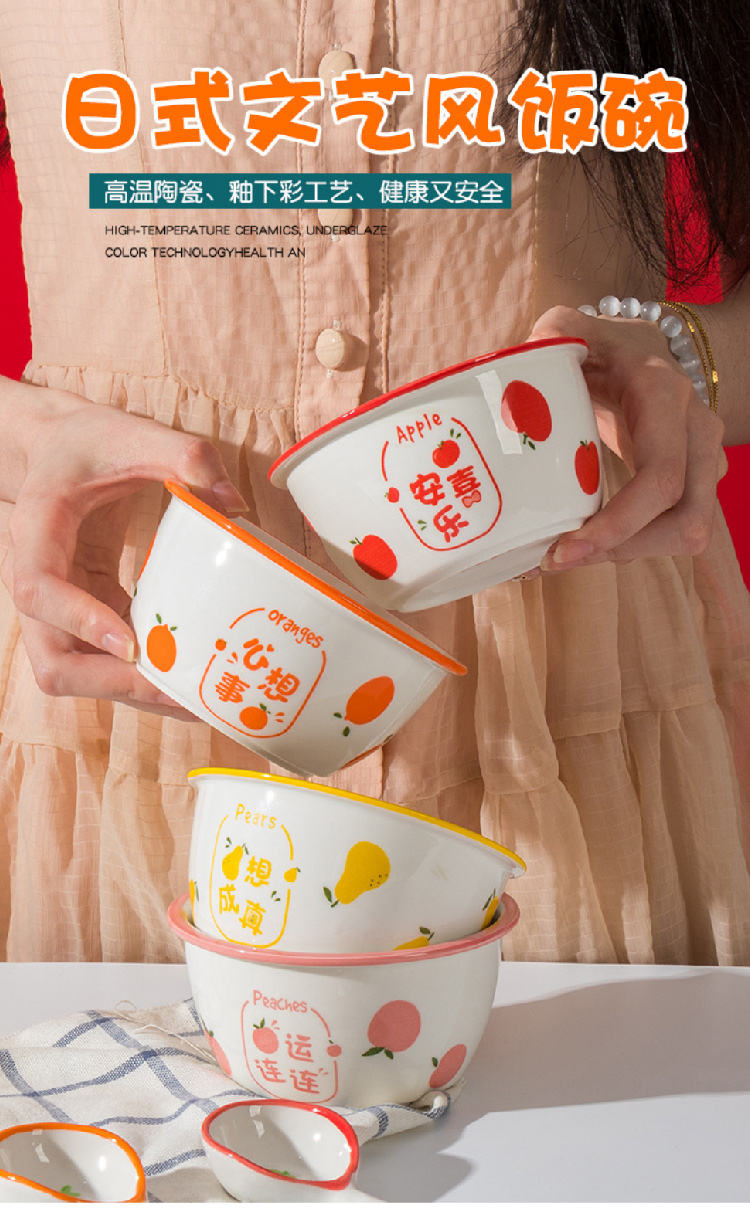 【大号彩碗2个装】家用水果祝福卡通系列陶瓷碗 大号汤碗釉下彩厚边碗