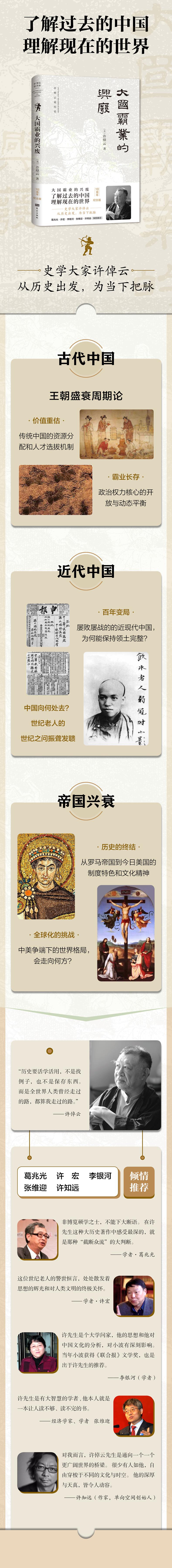 本书中,许倬云先生以其融汇中西、贯通古今的深厚学养,从系统论的角度深入剖析了古今中外大国霸业的成败兴废之道。中国史部分,从秦汉帝国开始,提纲挈领地分析了中国历代王朝组织架构的分散聚合对其存续的影响,简明扼要地勾勒出一幅中国历史大脉络;世界史方面,则重点分析了罗马帝国的成败因缘,并由此而下将其与近代列强如荷兰、大英帝国等比较异同,最后反思了今日美国基督教精神丧失的问题。