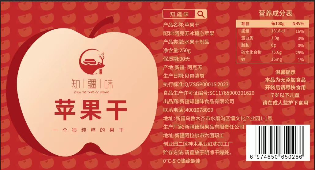 【名称】:知疆味三蒸三晒苹果干