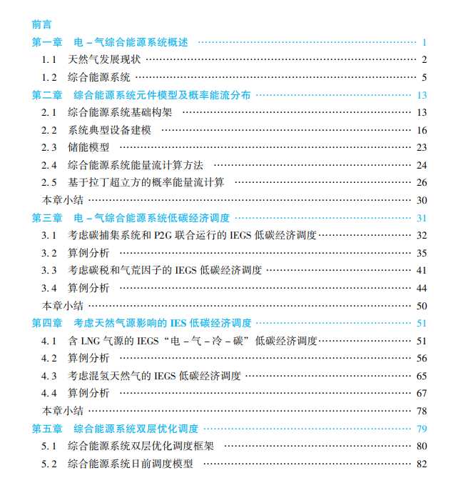 本书主要针对综合能源系统可能的运行模式、 运行优化及可靠 性进行分析, 为综合能源系统发展提供相关建议。 (1) 针对双碳背景下电 - 气综合能源系统运行优化问题, 探讨了考虑碳捕集系统、 电 - 氢联合系统、 碳交易机制、 混氢天然气运行方式、 综合需求响应等 “电 - 气 - 储” 综合能源系统运行模式, 构建了电 - 气综合能源系统中冷、 热、 电、 气、 储系统的典 型设备、 耦合设备模型。 (2) 介绍综合能源系统不同能量流的计算原理, 并针对不同运行体系, 采用冷 - 热 - 电 - 气 - 储异质能源同质化法, 建立日前 - 日内 - 实时多时间尺度调度模型, 引 入多时间尺度协同优化调度方法, 提升综合能源系统运行经济性, 进一步提升新能源 消纳比例。 (3) 针对所构建的综合能源系统的典型运行场景和运行模式, 并提出了运行优化 策略, 以提升系统运行的经济性和可靠性, 为综合能源系统的构建和运行提供了技术 支持和参考。 (4) 考虑气源对电气综合能源系统稳定性和经济性的问题, 提出了含多微能网综 合能源系统可靠性评估体系, 探讨了综合能源系统对供能可靠性的影响。 (5) 建立低碳能源互联网智慧科创平台, 利用仿真平台对各种场景进行模拟, 对 比分析运行数据, 加强实际操作系统与信息传输设备之间的联系, 加快数据回收分析 速度, 提高对未来场景的预测精准度, 保证系统运行的可靠性。