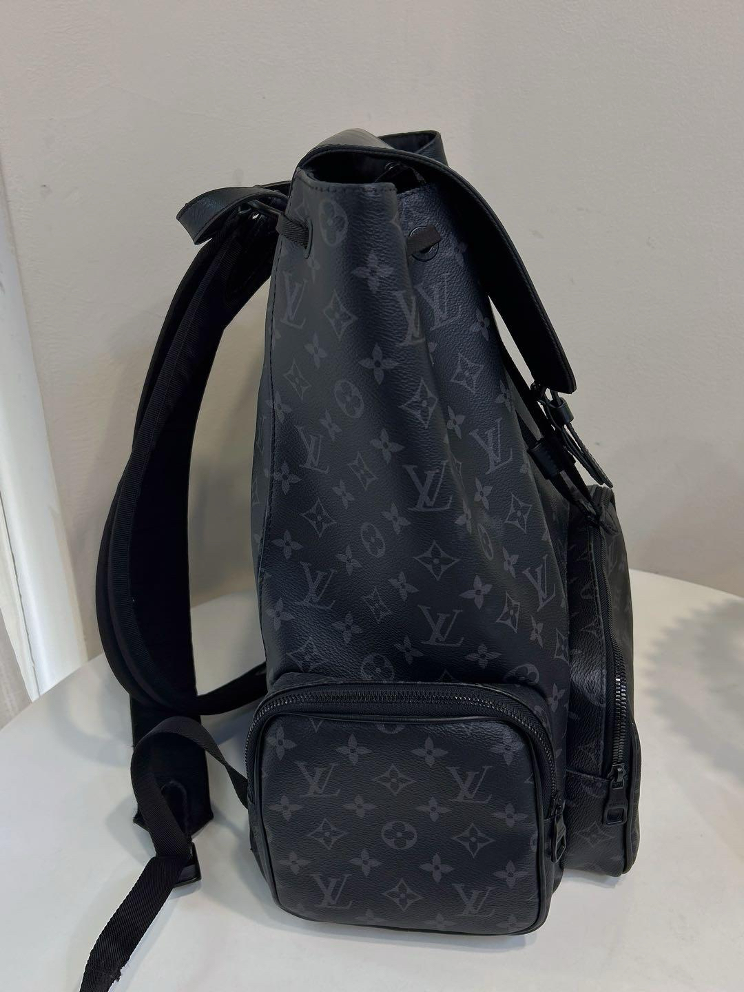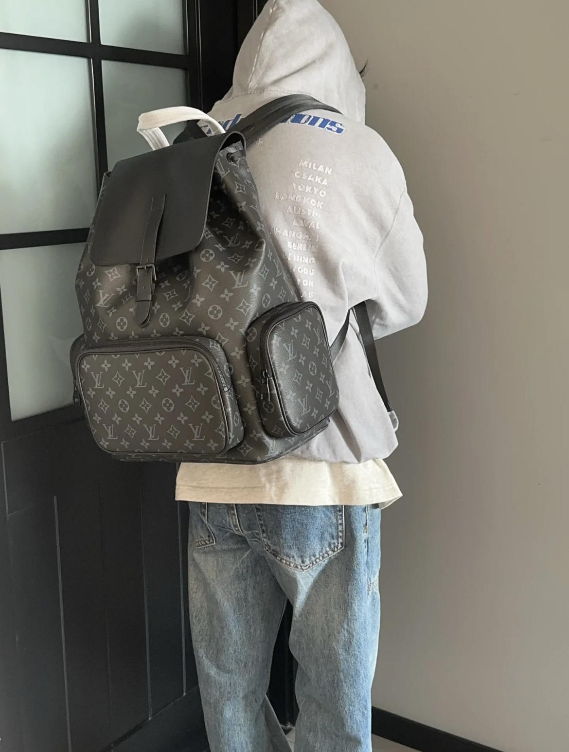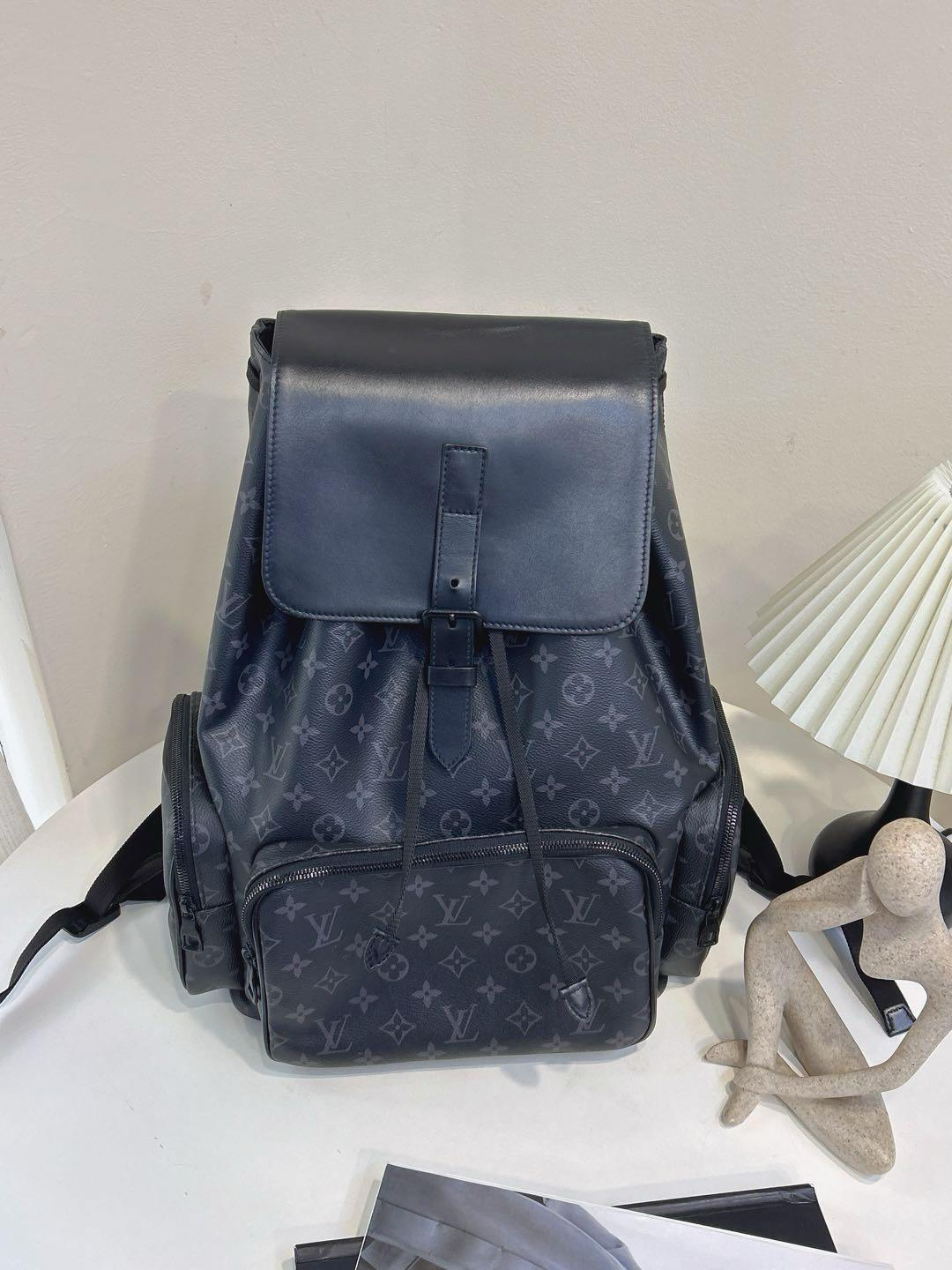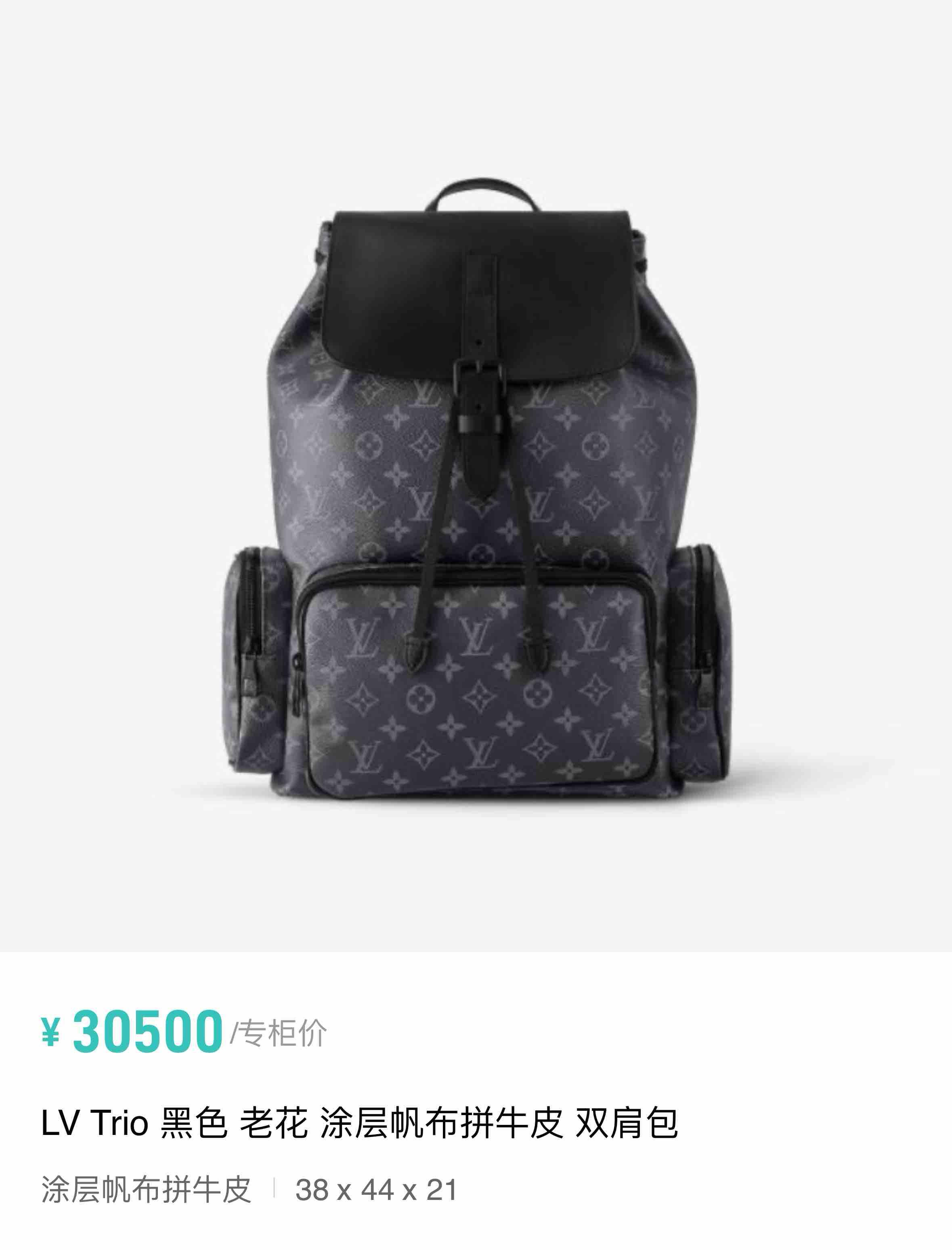 【商品详情】正品二手 LV 黑老花 拼皮 Trio 黑武士 双肩包🍘 97新 31×42。手柄油边处及包带扣油边有轻微融边 翻盖、双肩带及包底有轻微使用痕迹。帅气男包