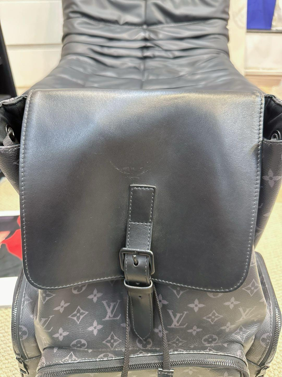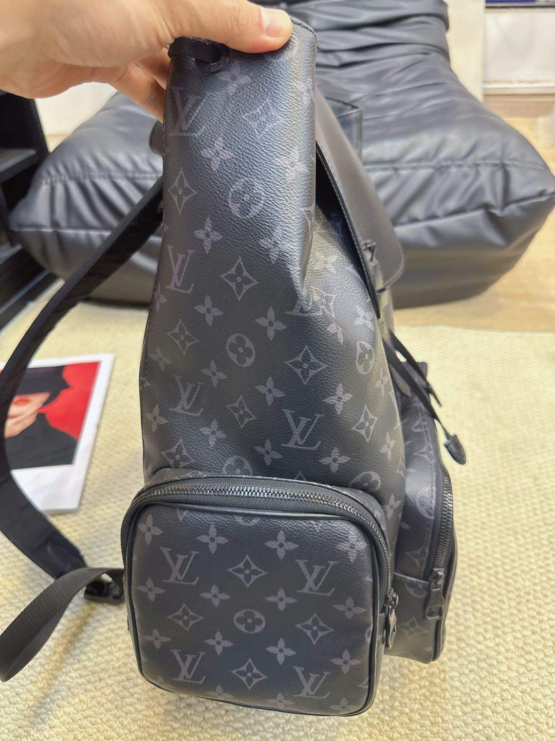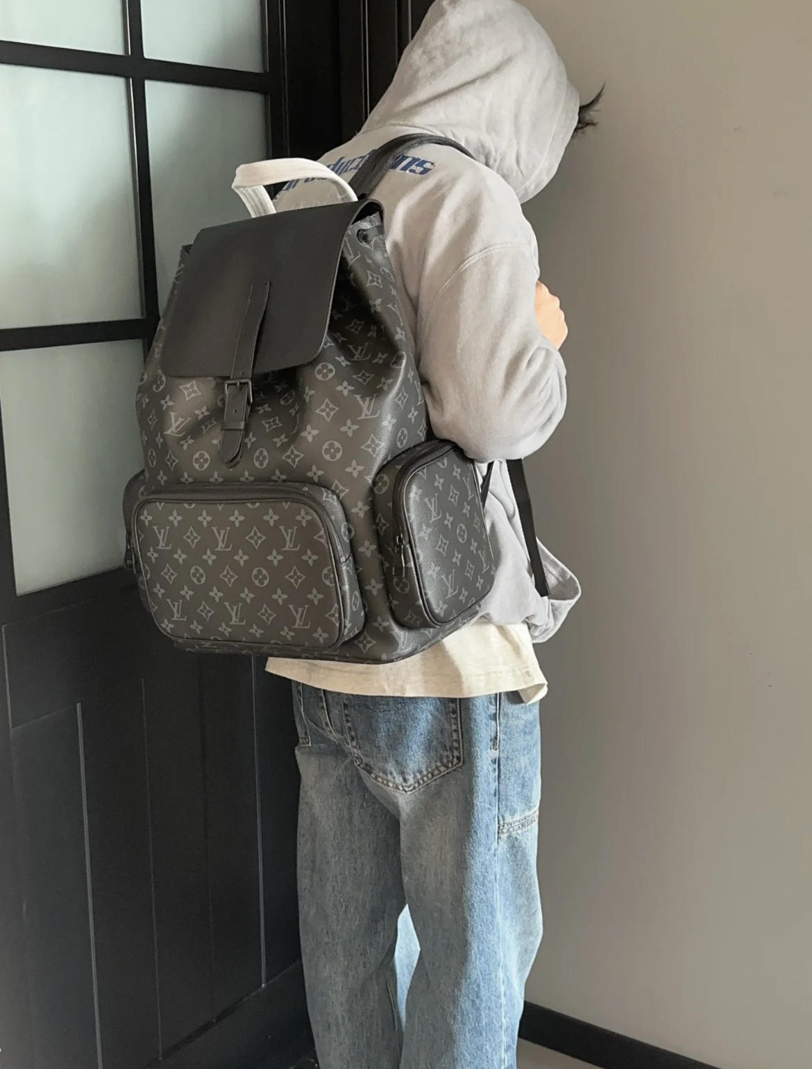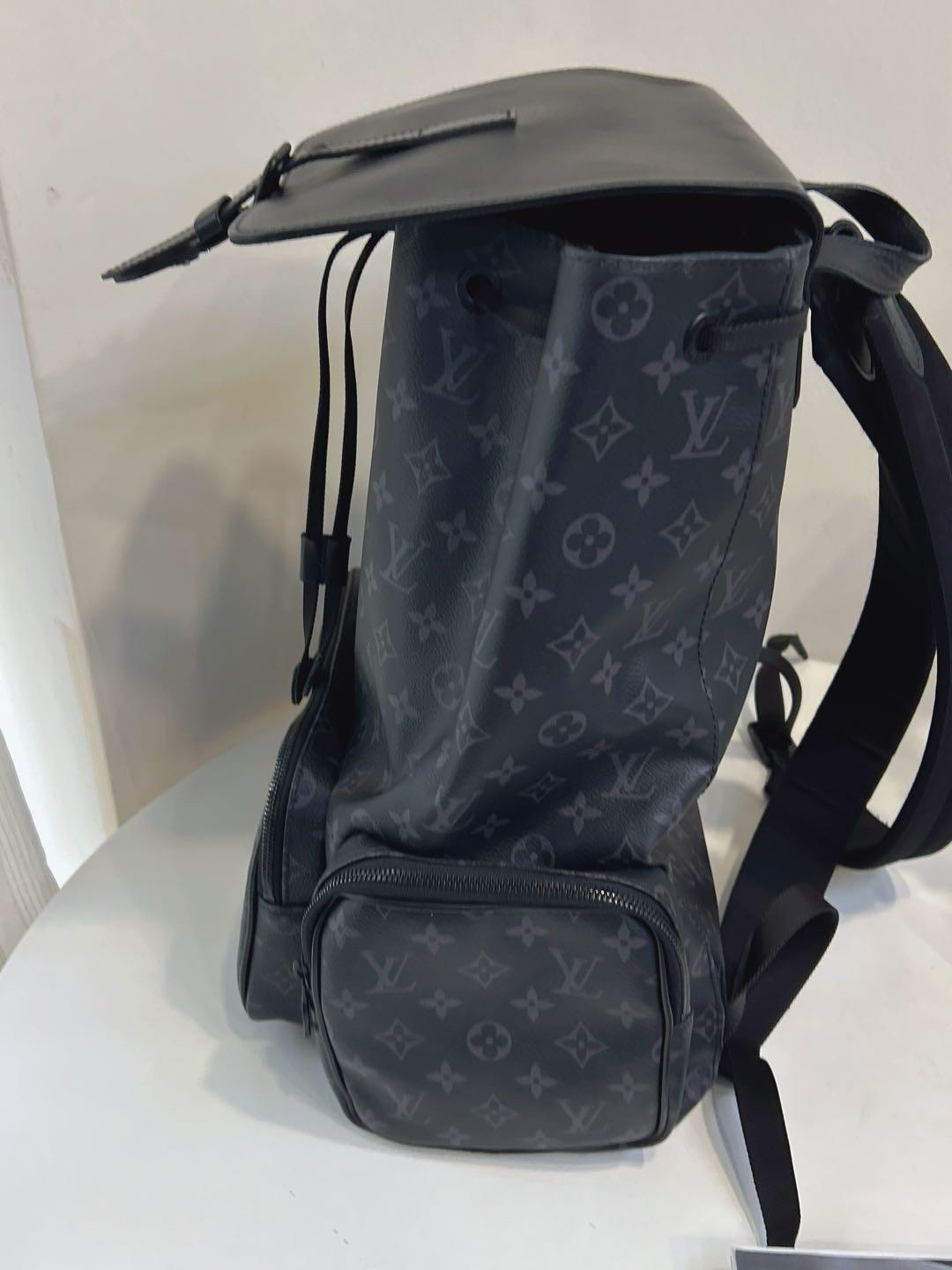 【商品详情】正品二手 LV 黑老花 拼皮 Trio 黑武士 双肩包🍘 97新 31×42。手柄油边处及包带扣油边有轻微融边 翻盖、双肩带及包底有轻微使用痕迹。帅气男包