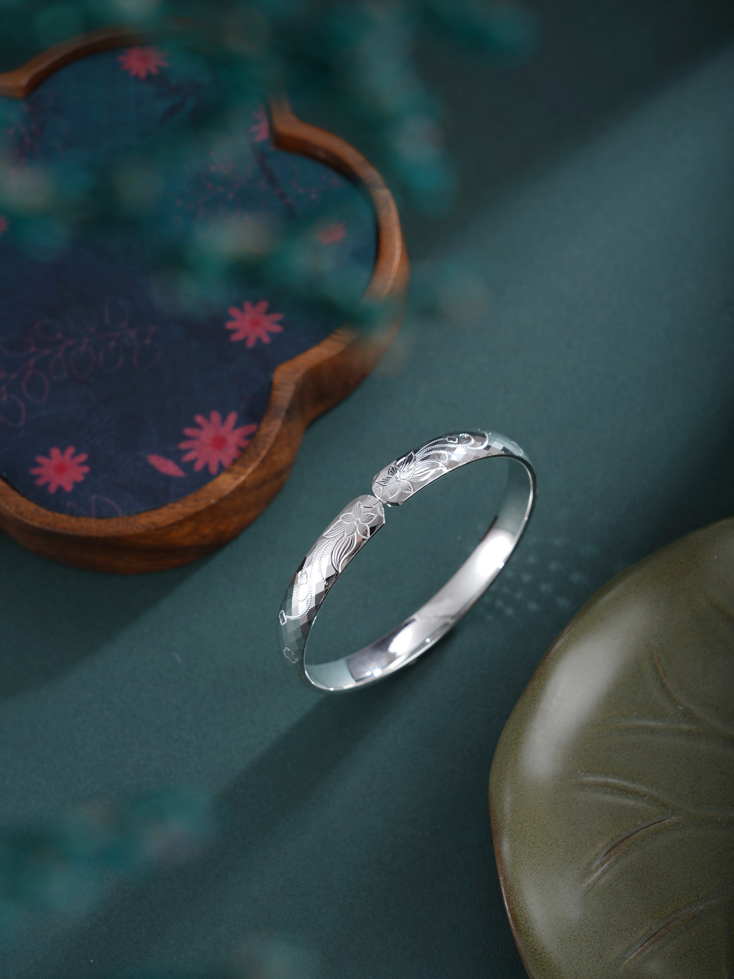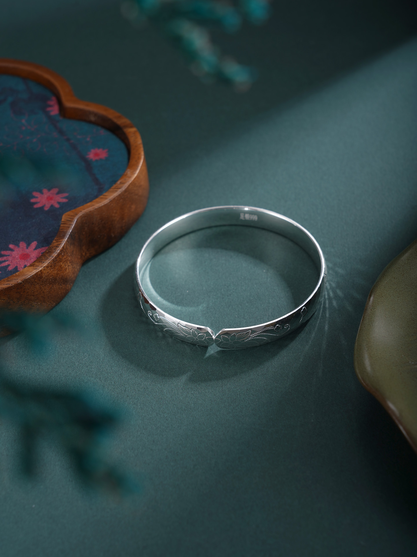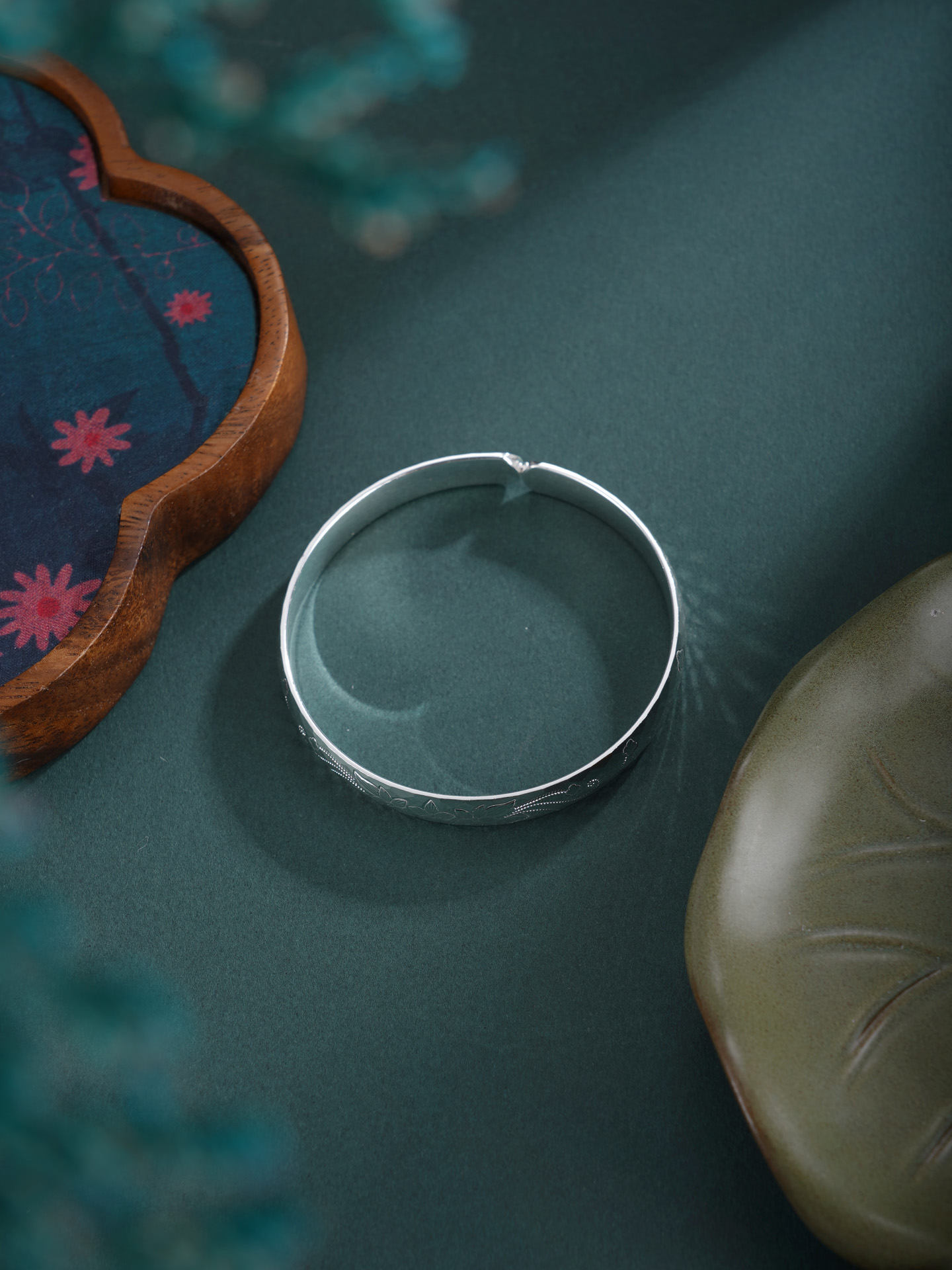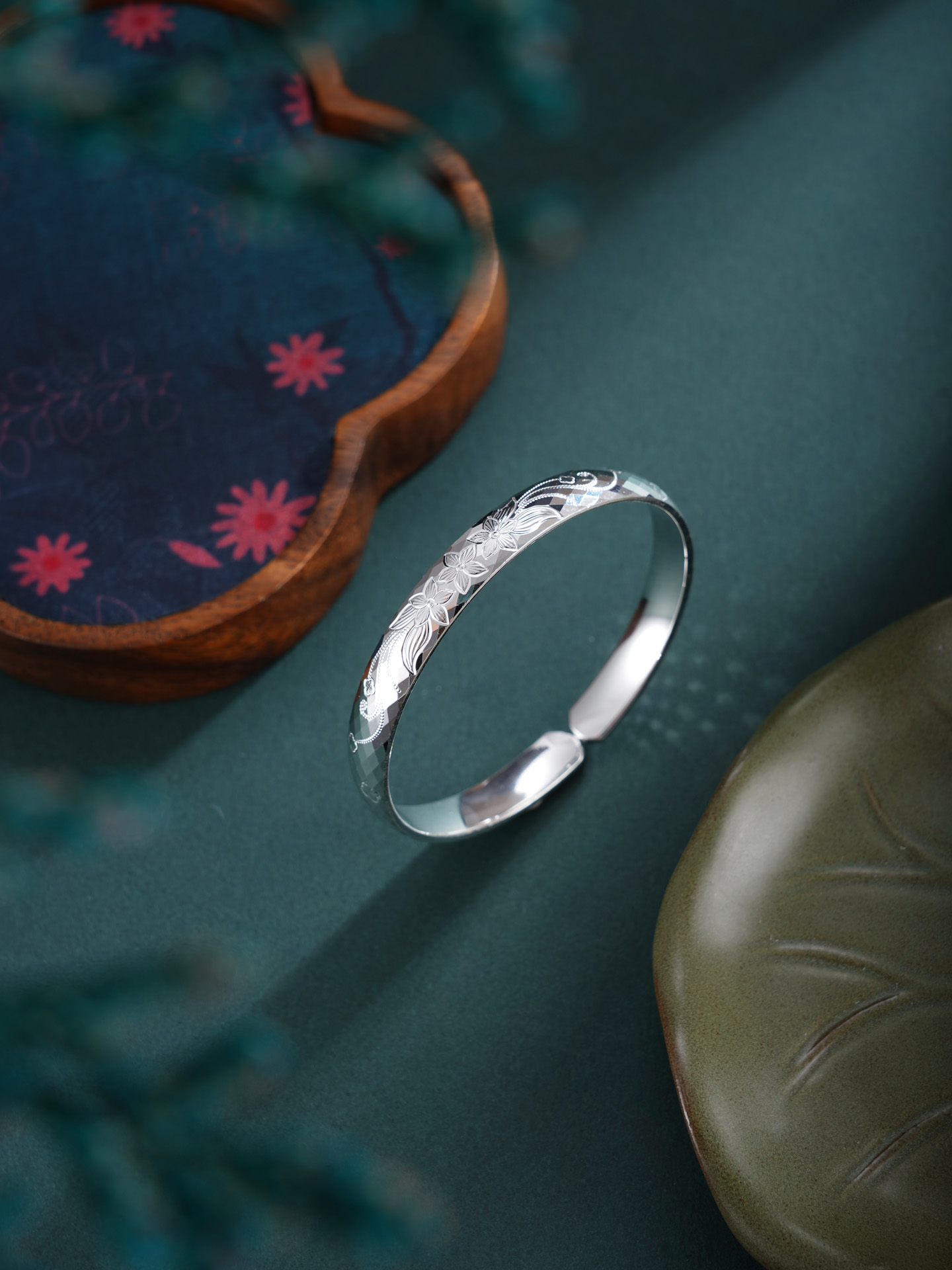 【寓意】:纯银手镯表面錾刻繁花纹样,寓意爱与美好如繁花不息,在岁月中愈绽愈艳。