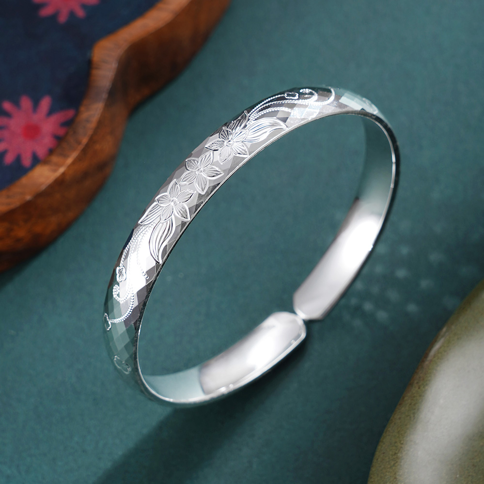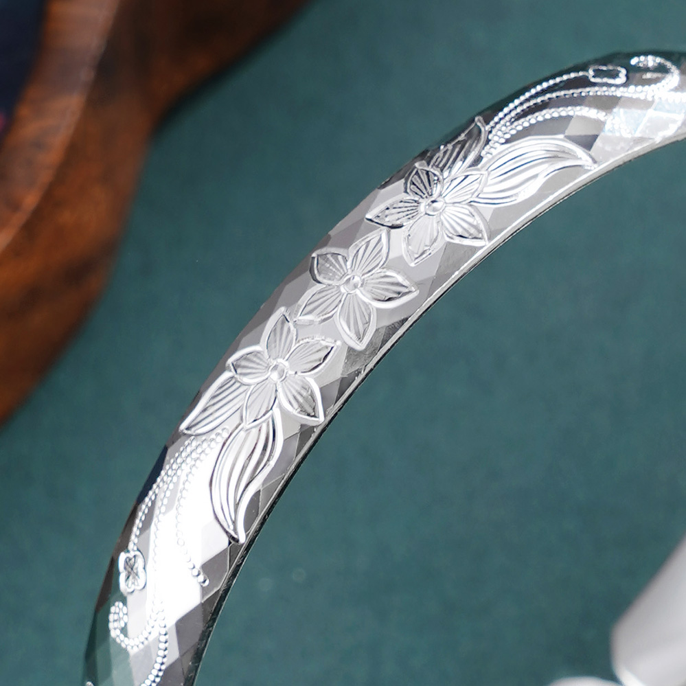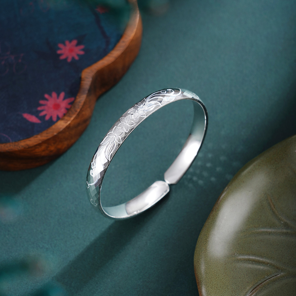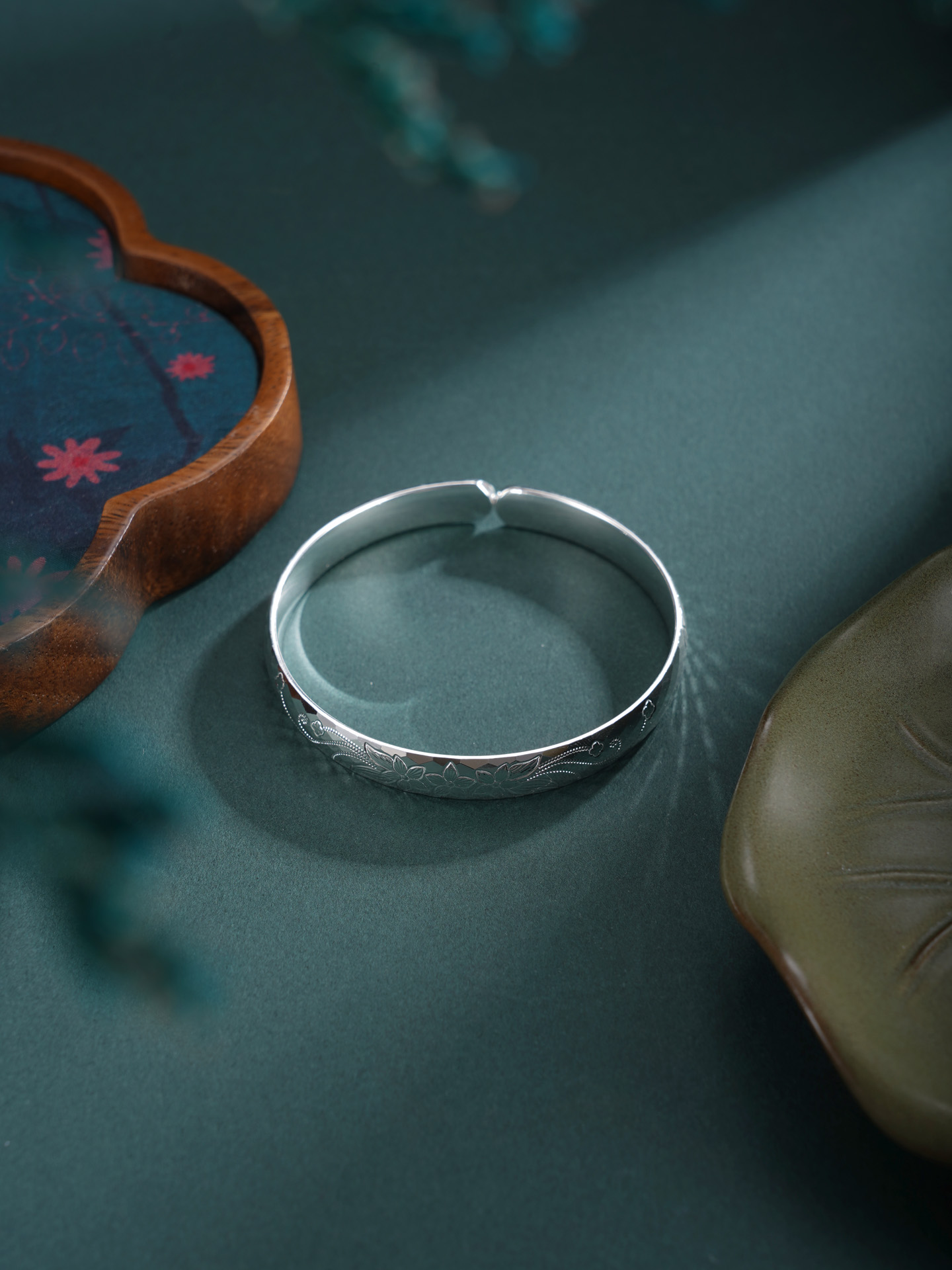 【寓意】:纯银手镯表面錾刻繁花纹样,寓意爱与美好如繁花不息,在岁月中愈绽愈艳。