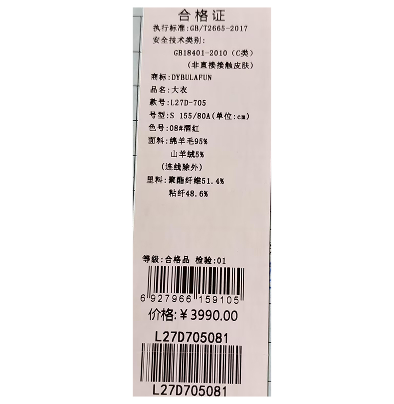 戴布拉芬呢大衣L27D705