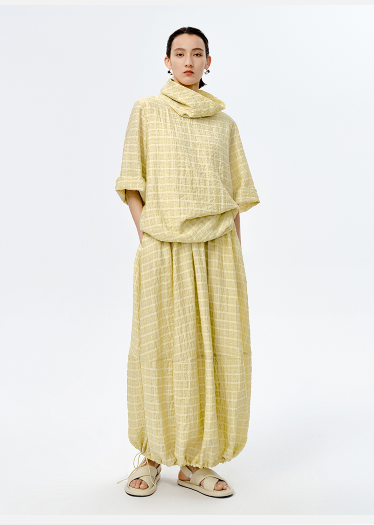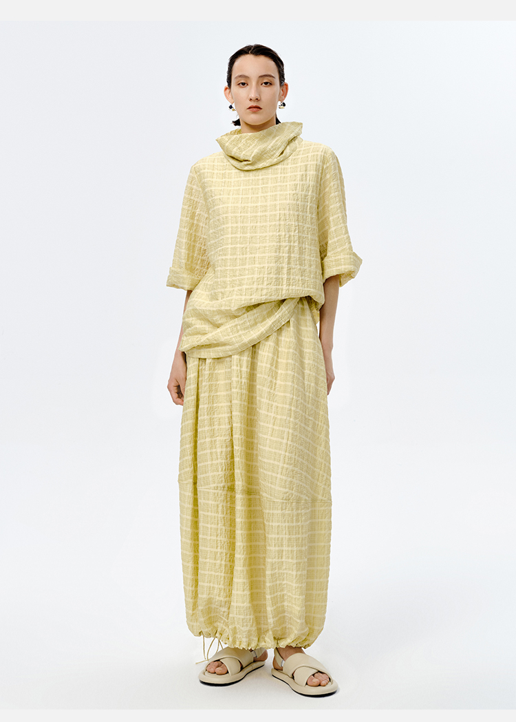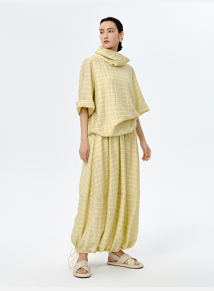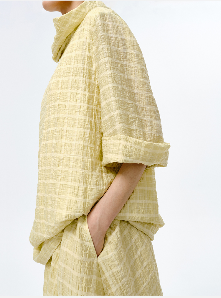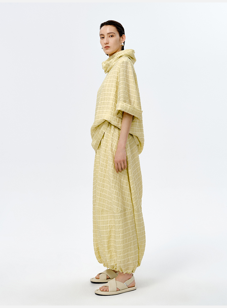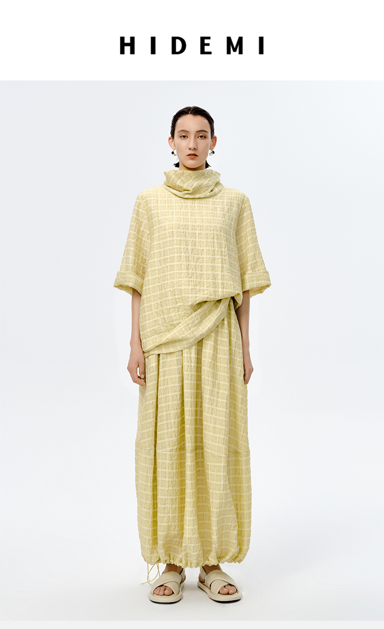 HIDEMI堆堆领色织格纹大廓形超薄清透茧型套装