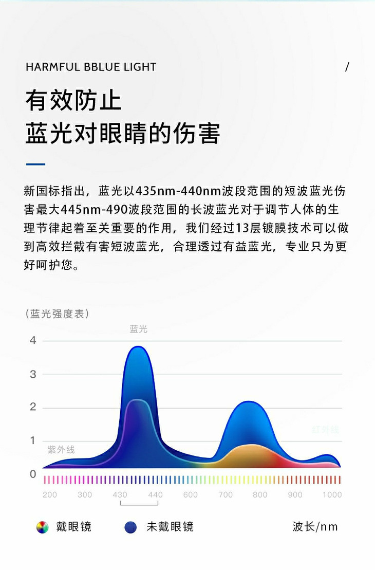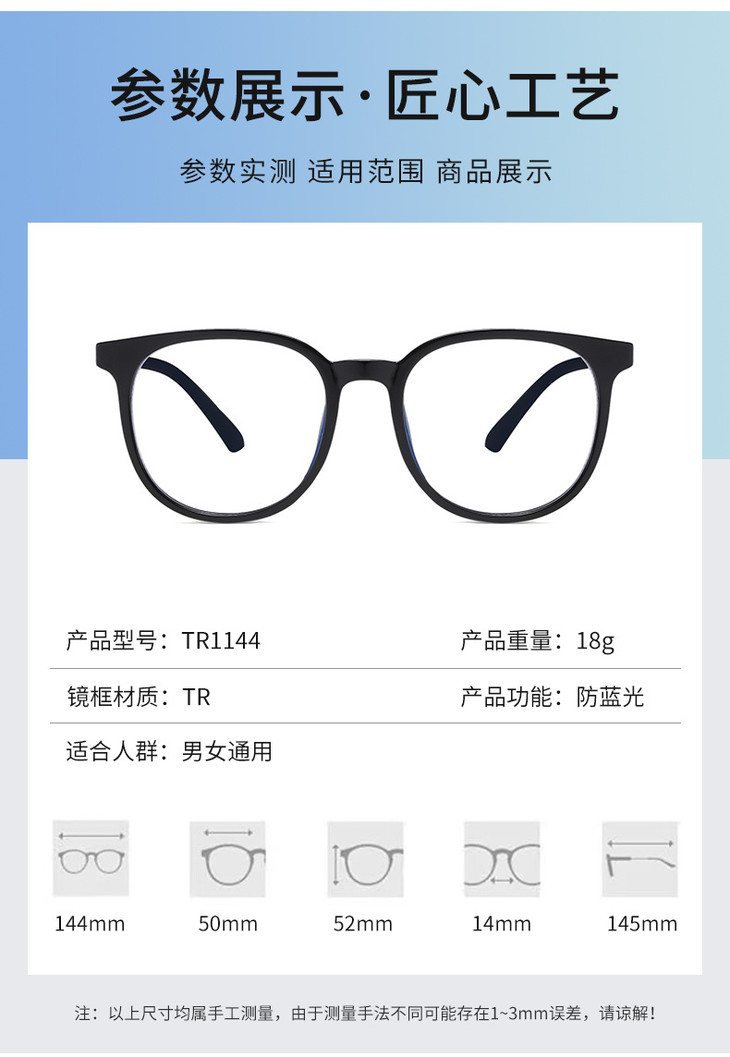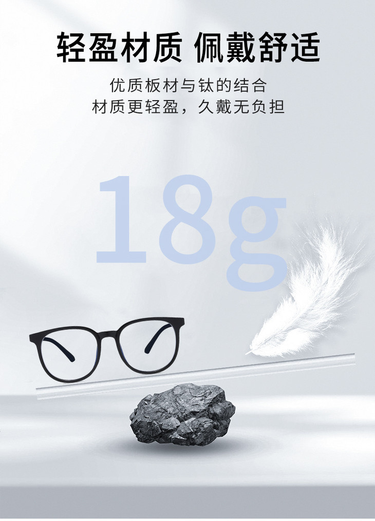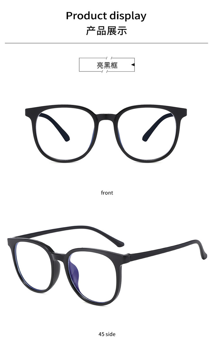 【产品信息】 产品颜色: 黑框、透灰框、冰美式 材质: TR镜框 + 高清树脂防蓝光镜片 特性: 有效阻隔有害蓝光,保护眼睛健康