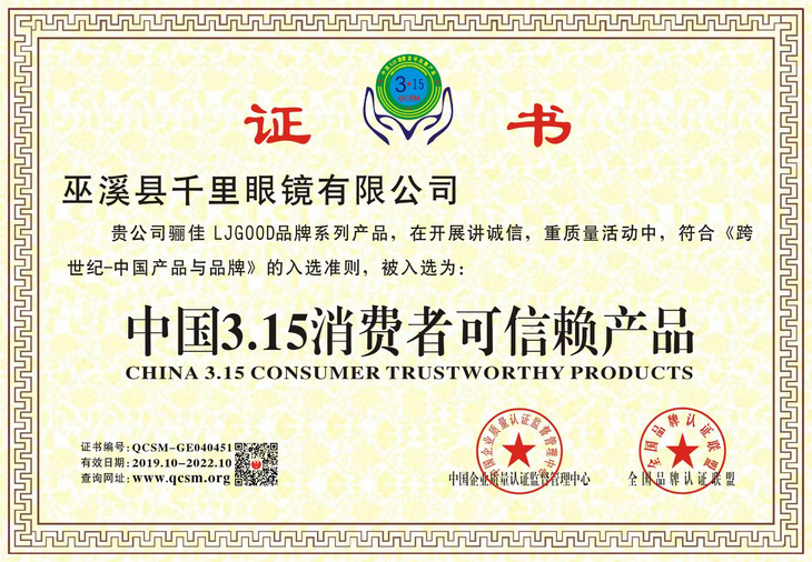 骊佳品牌获得“中国3.15消费者可信赖产品”奖、 “质量、服务、诚信3A企业”、 “中国眼镜行业畅销品牌“ “质量检验.国家标准合格产品”? 专业团队.精功品质.畅销各大卖场?