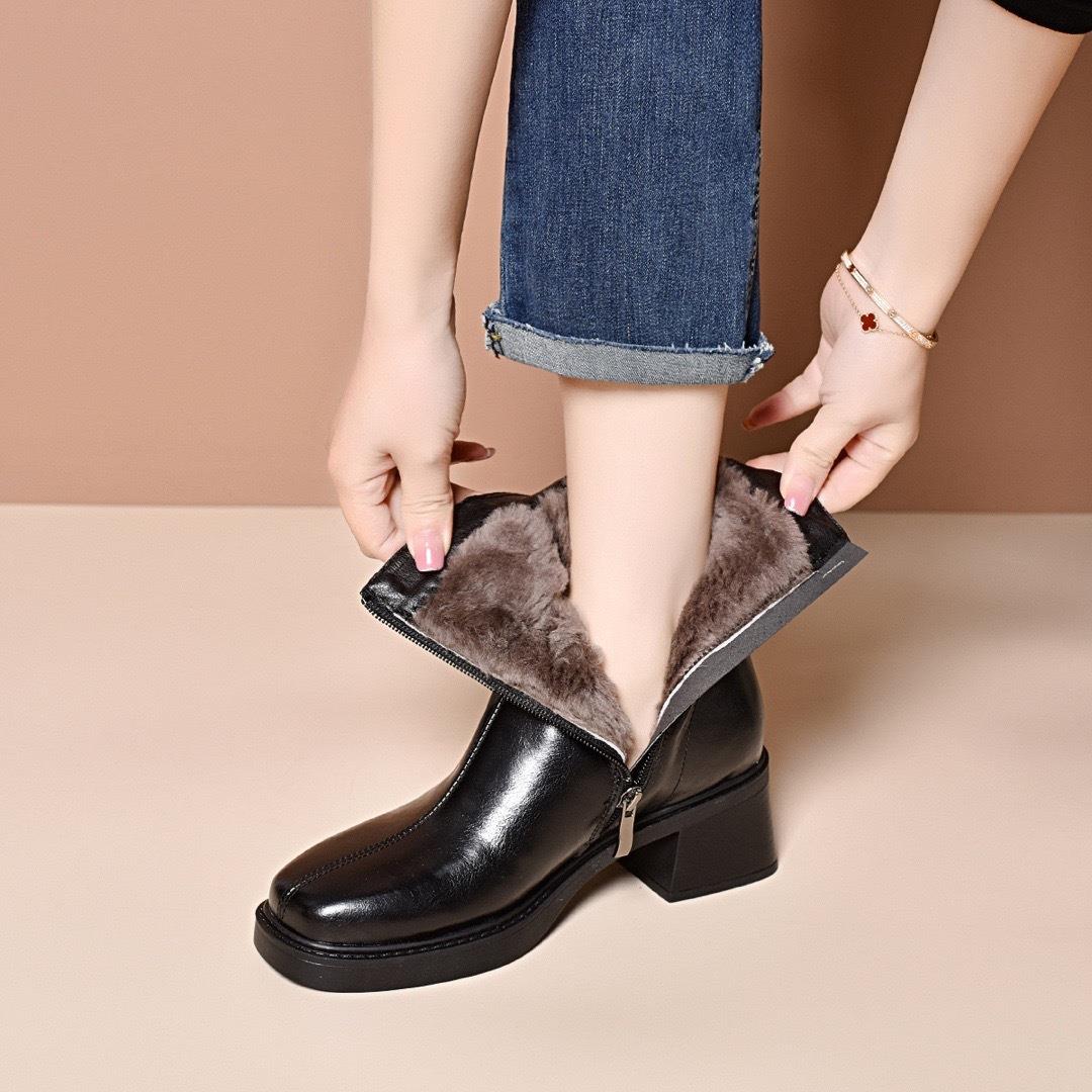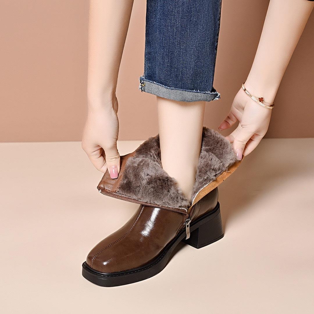 真皮方头粗跟短靴女厚底2024新款秋冬季保暖羊毛马丁靴加绒棉皮鞋