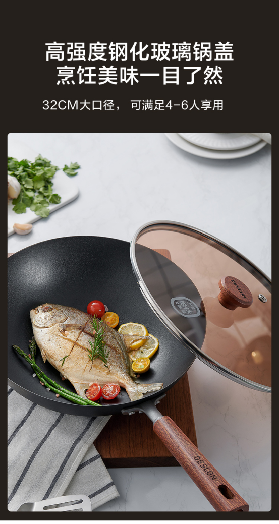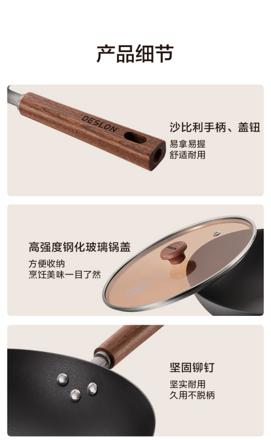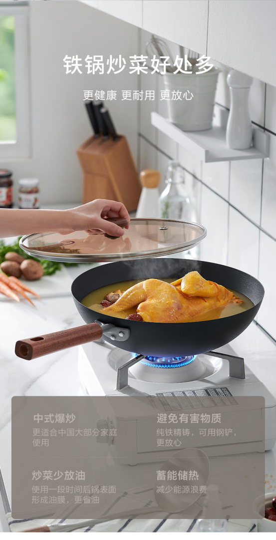 高纯度精铁,受热均匀,传热更快 无涂层不锈工艺,不易生锈,不惧锅铲铁刷,健康耐用; 旋纹锻压工艺,锅身厚底壁薄,导热迅速更轻量; 全新窒化处理工艺,物理不粘性能更佳; 高强度钢化玻璃锅盖,烹饪美味一目了然; 沙比利手柄和盖钮,隔热防烫,符合人体工程学,握感舒适,让您收放自如。