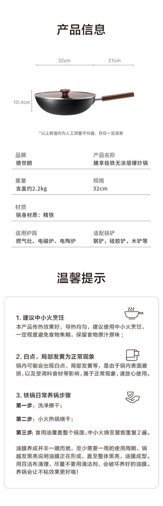 德世朗DFS-C849A膳享极铁无涂层爆炒锅 【品牌】德世朗 【型号】DFS-C849A 【颜色】黑色 【规格】32cm 【材质】精铁 【包装】彩盒+外箱 【发货地】浙江 【发货时效】3-5天(节假日顺延) 【快递】三通一达 【加邮费区域】无 【不发地区】新疆、西藏、港澳台不发 【加运费区域】青海甘肃宁夏海南内蒙古+15 【售后标准】 1.无理由退货(不可拆封,不影响二次销售的情况下 2.7天内支持无理由退换,非质量问题运费买家自己承担,不扣发出、拦截、拒收费 3.以上质量问题是指产品非人为造成的质量问题(损耗类产品配件,无质保)!