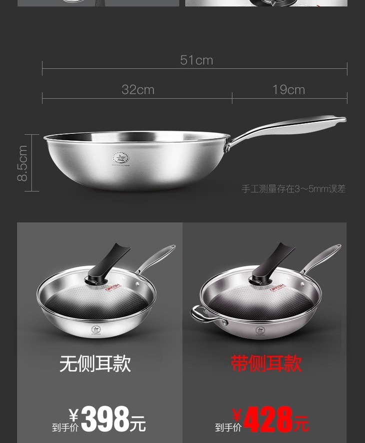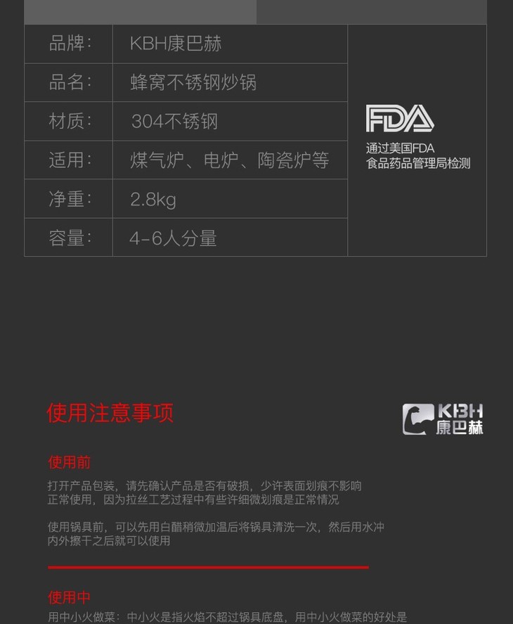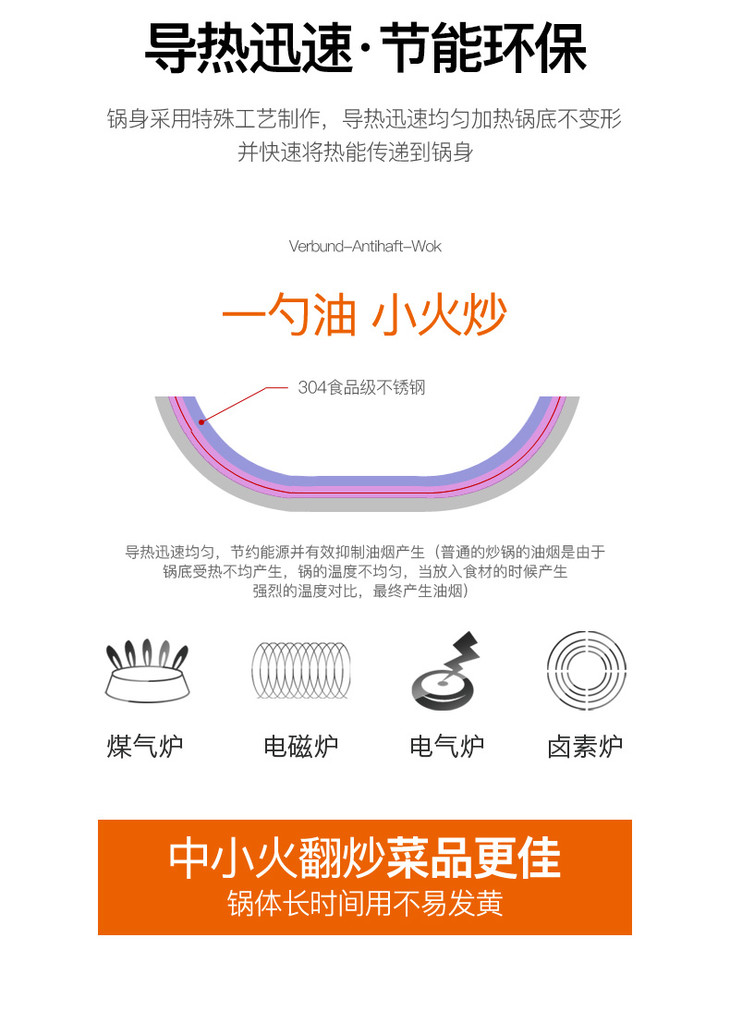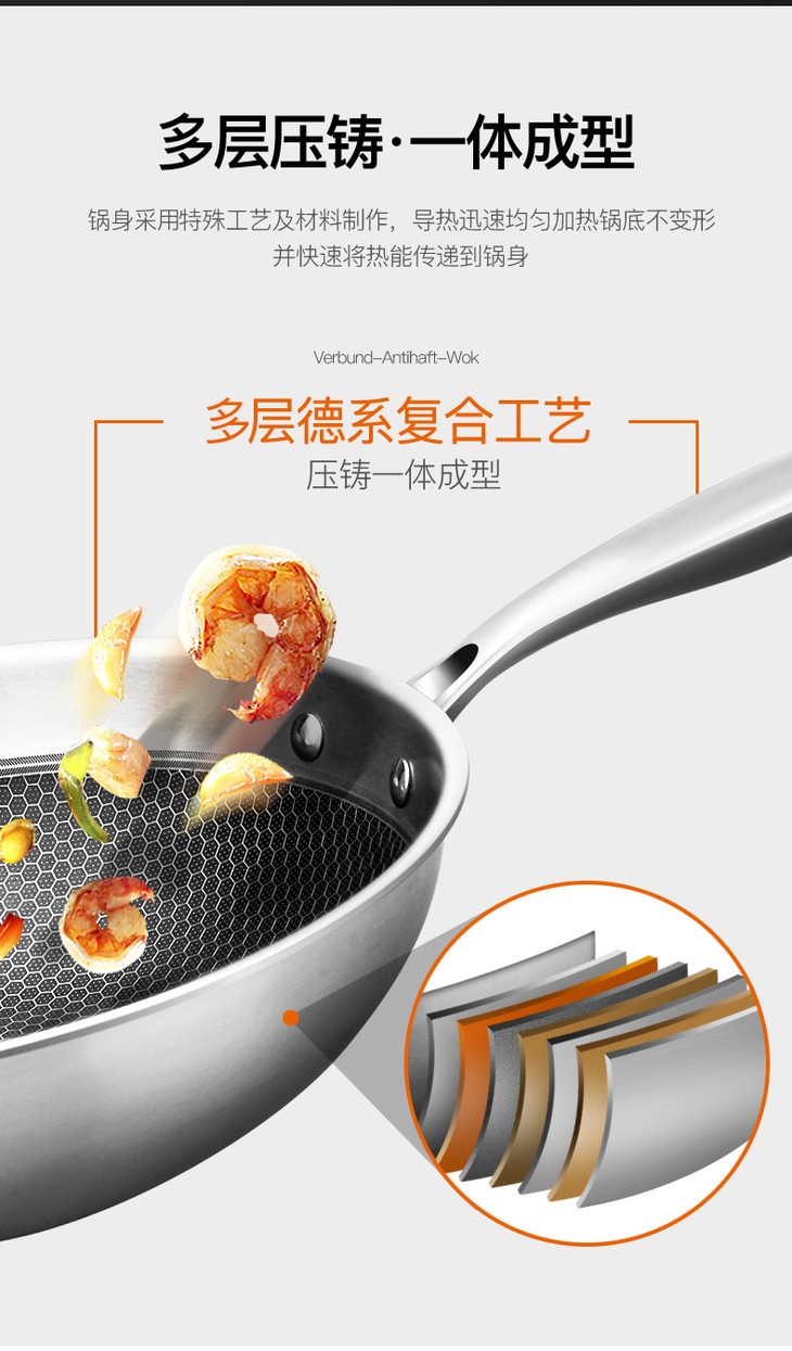 康巴赫炒锅无油烟不粘锅304不锈钢炒菜锅燃气电磁炉通用锅具家用无涂层平底锅