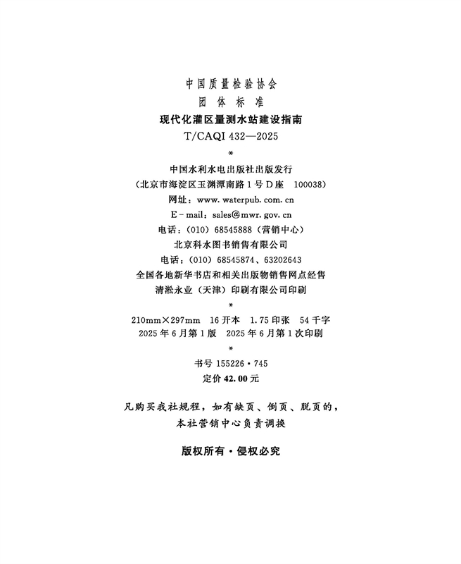 本文件按照GBT 1.1—2020《标准化工作导则 第1部分:标准化文件的结构和起草规则》的规定起草。请注意本文件的某些内容可能涉及专利。本文件的发布机构不承担识别专利的责任。 本文件由无锡国富安安全技术咨询服务有限公司提出。 本文件由中国质量检验协会归口。 本文件确立了现代化灌区量测水站建设目标和原则,提供了总体布局、测站布置、方案编制、项目实施、项目验收、测站管理等方面的指导和建议。本文件适用于各类灌区的量测水站建设,包括但不限于大、中、小型灌区的骨干渠道监测站、支渠监测点以及小型灌区的末级渠系监测设施。
